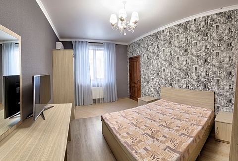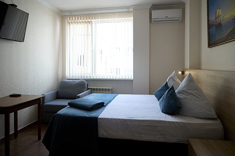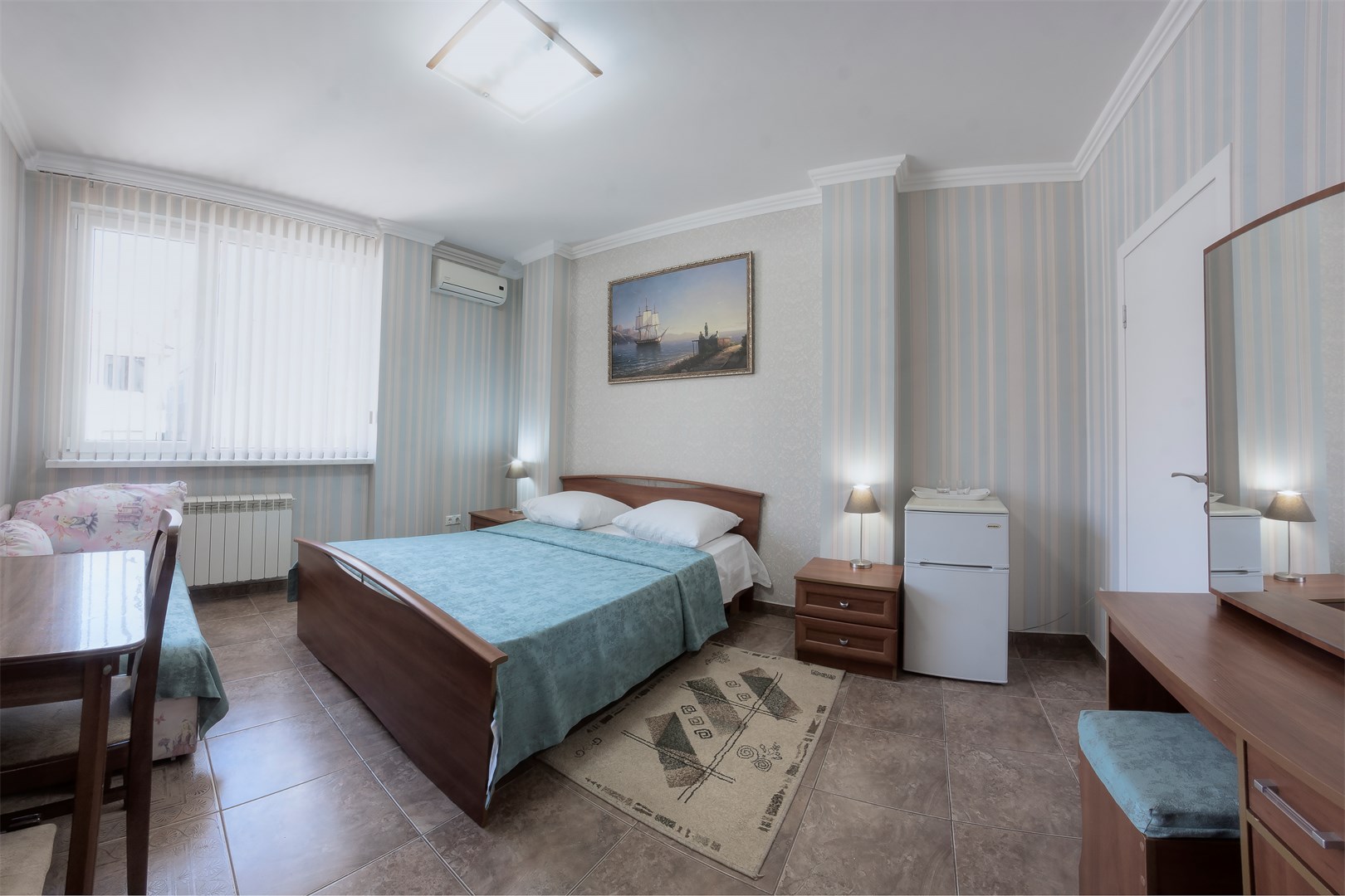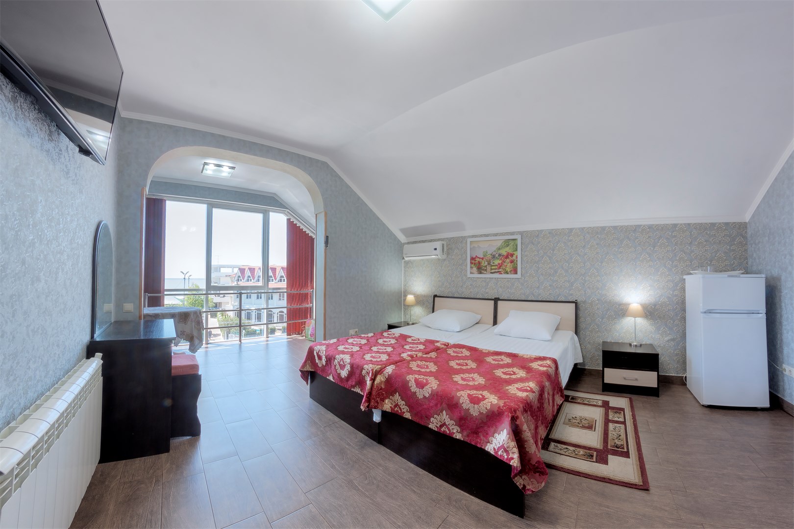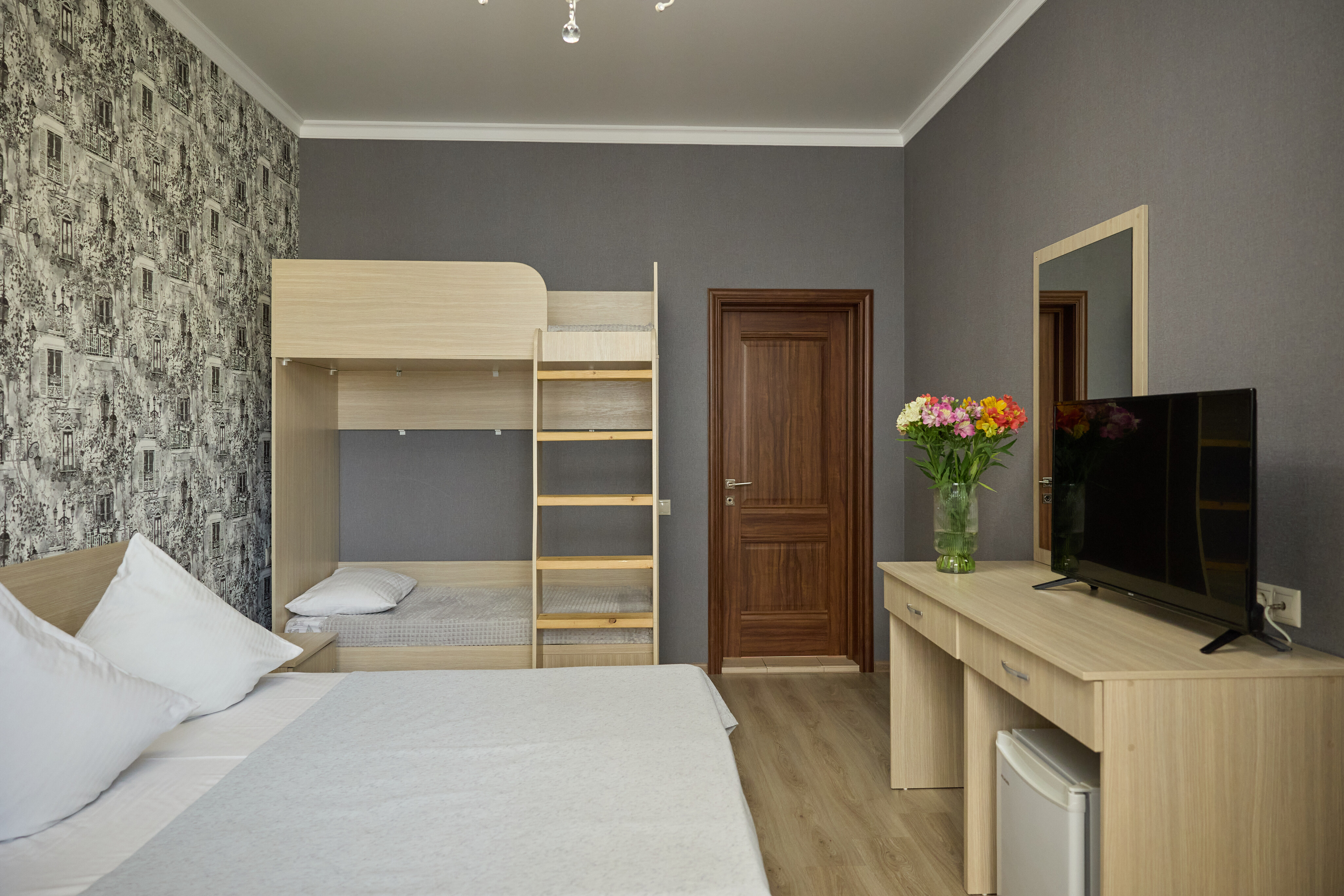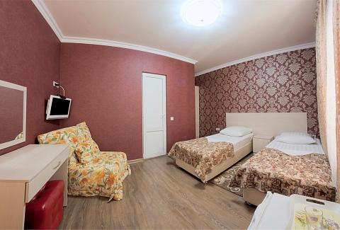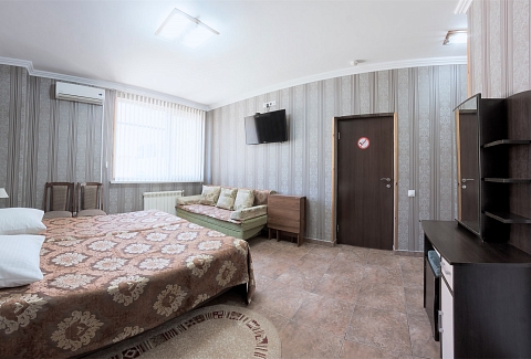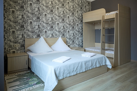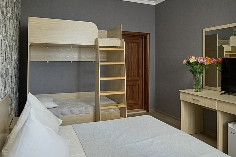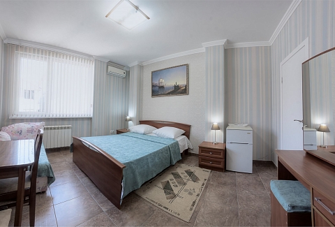 В номере: вешалка, зеркало, кровать двуспальная, кровать двухъярусная, прикроватные тумбочки, стол, стулья, шкаф, кондиционер, пляжные полотенца, телевизор, утюг, холодильник