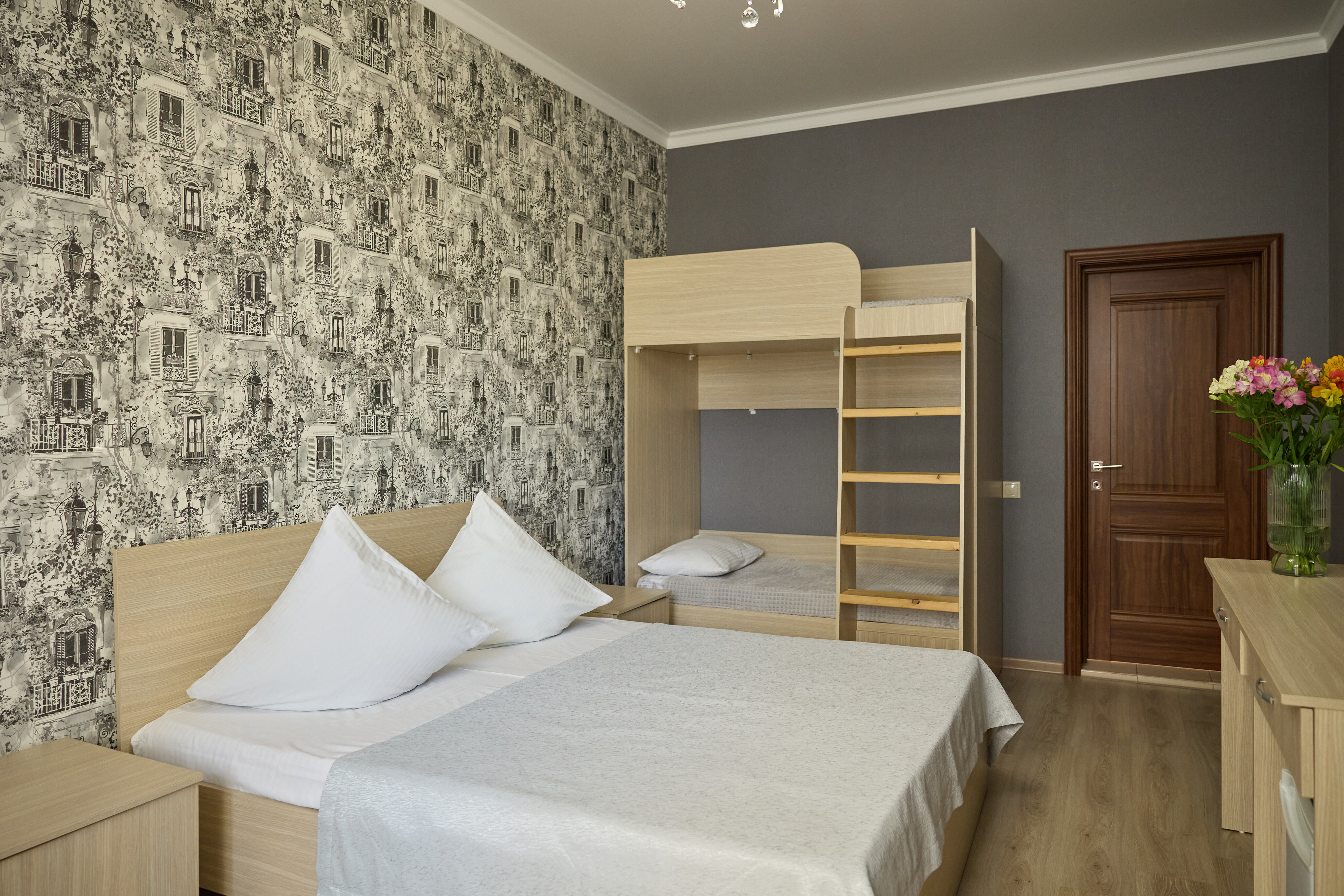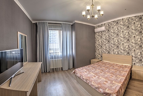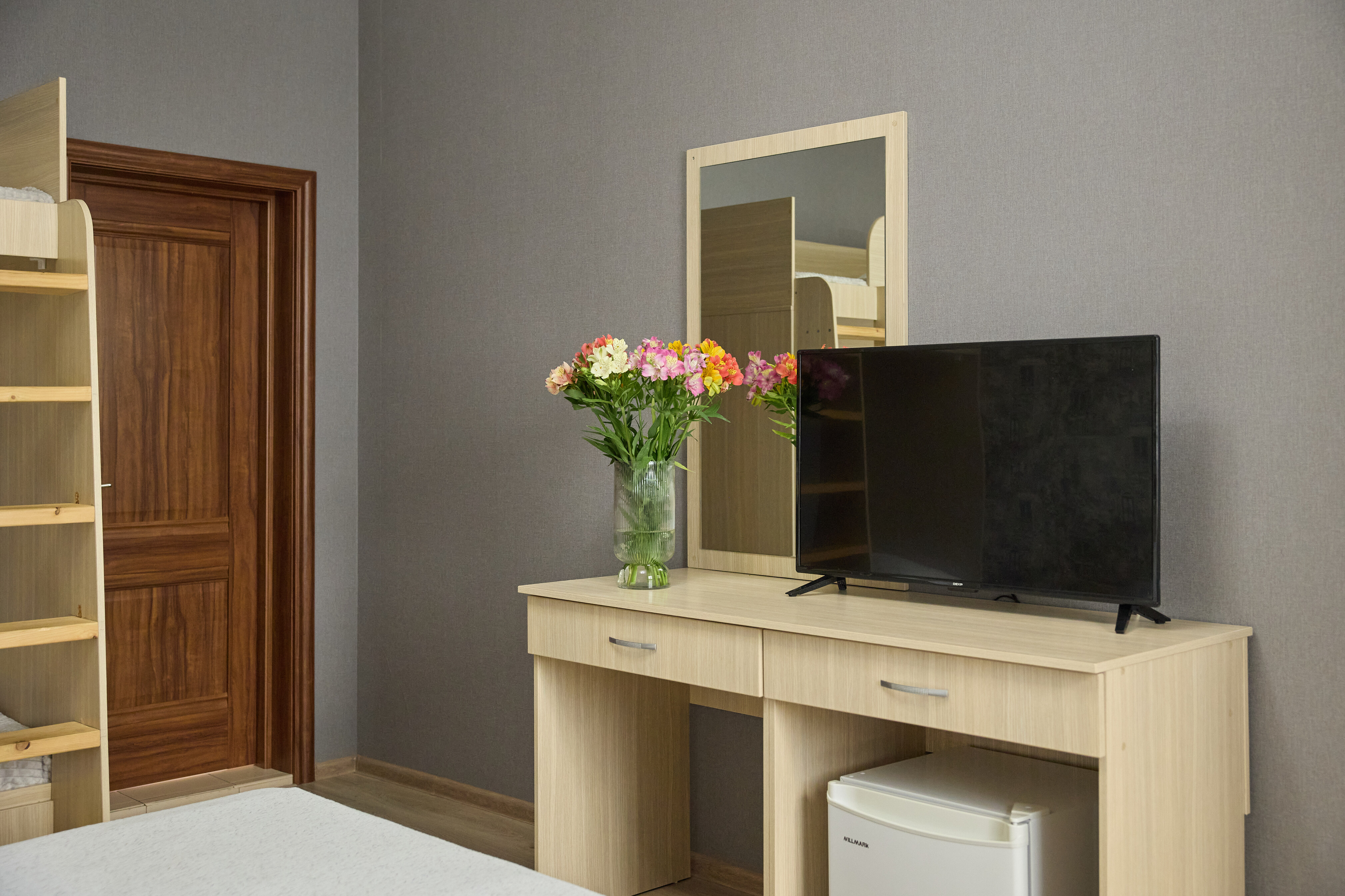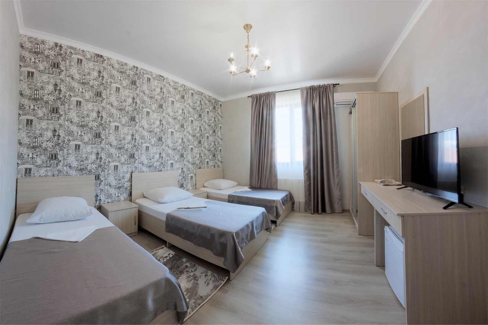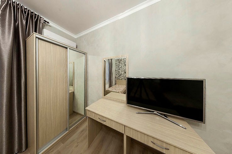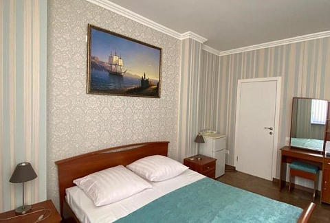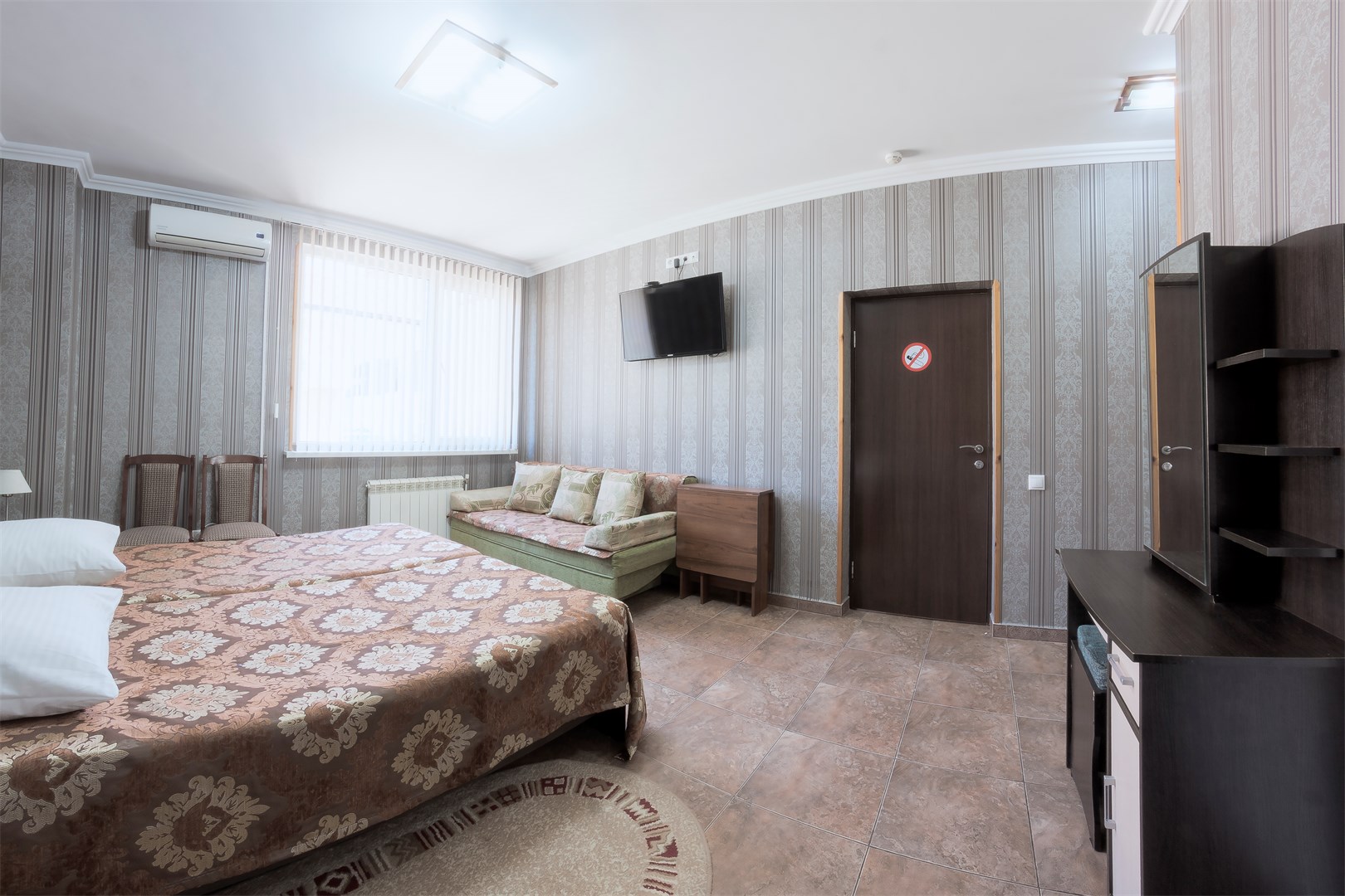 В номере: вешалка, зеркало, кровать двуспальная, кровать двухъярусная, прикроватные тумбочки, стол, стулья, шкаф, кондиционер, пляжные полотенца, телевизор, утюг, холодильник