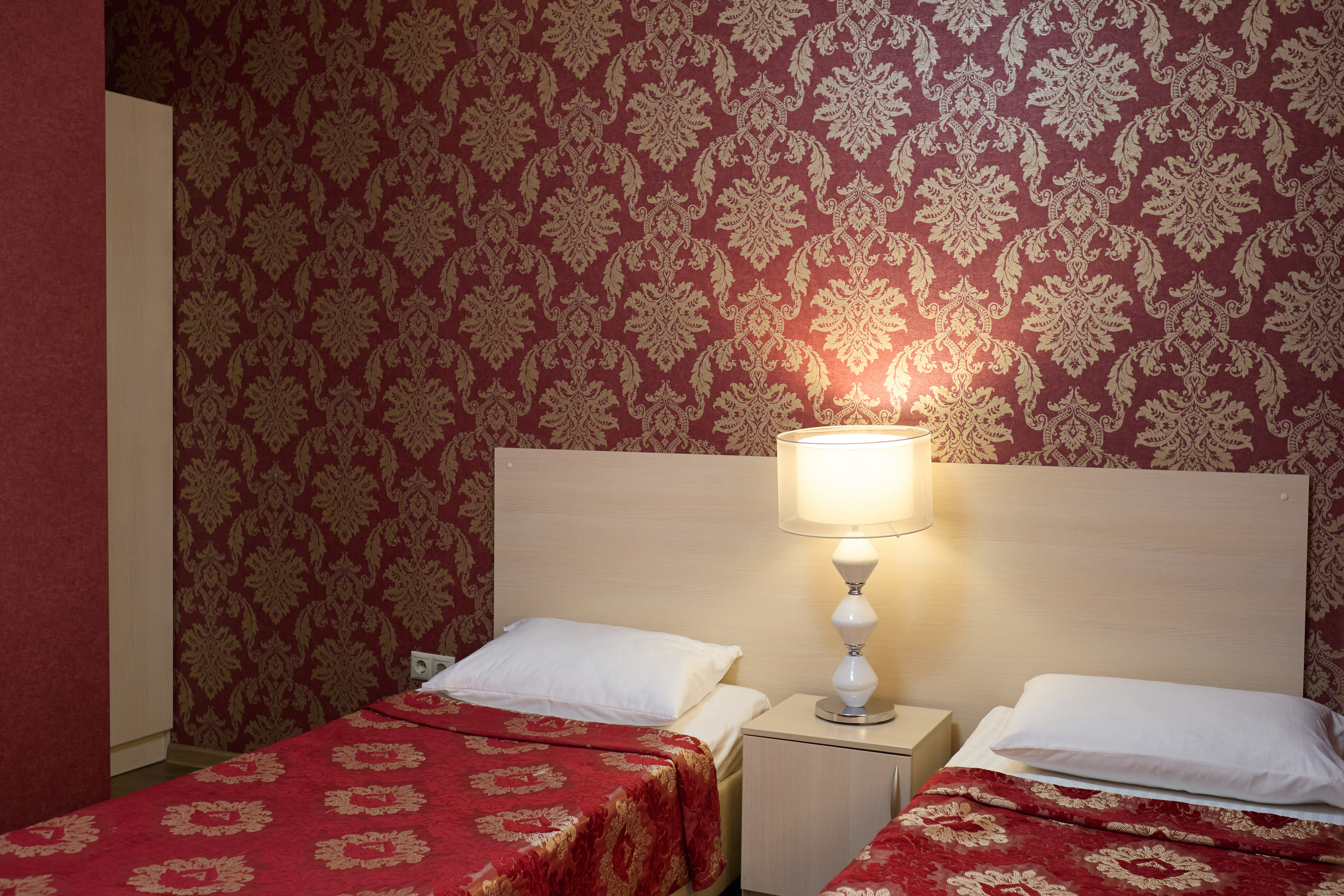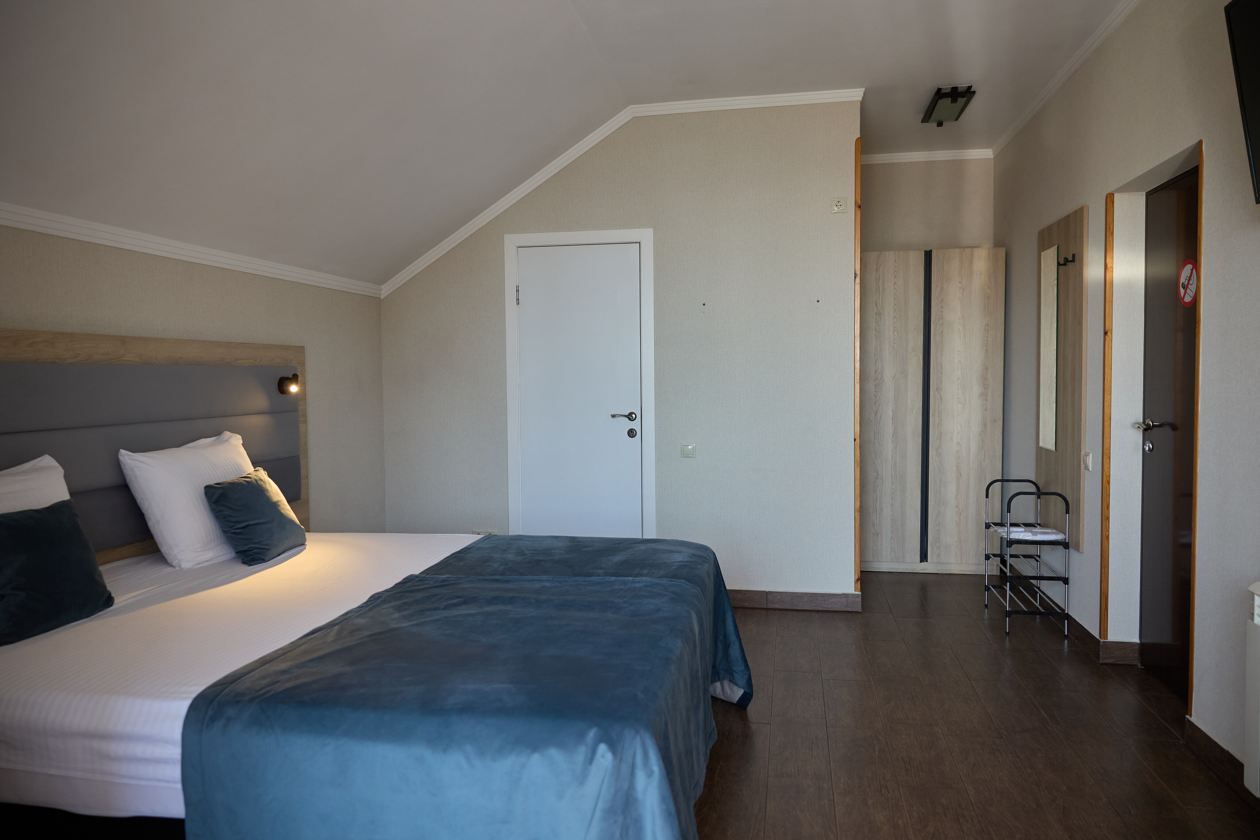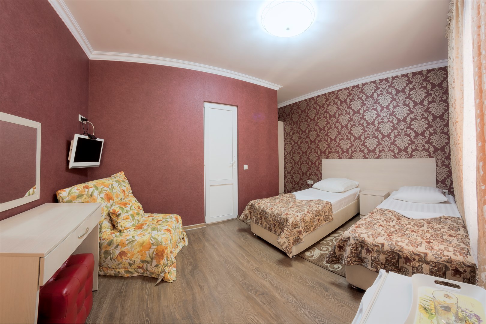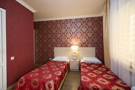 В номере: вешалка, зеркало, кровати односпальные, прикроватные тумбочки, стол, стулья, шкаф, кондиционер, пляжные полотенца, телевизор, утюг, холодильник