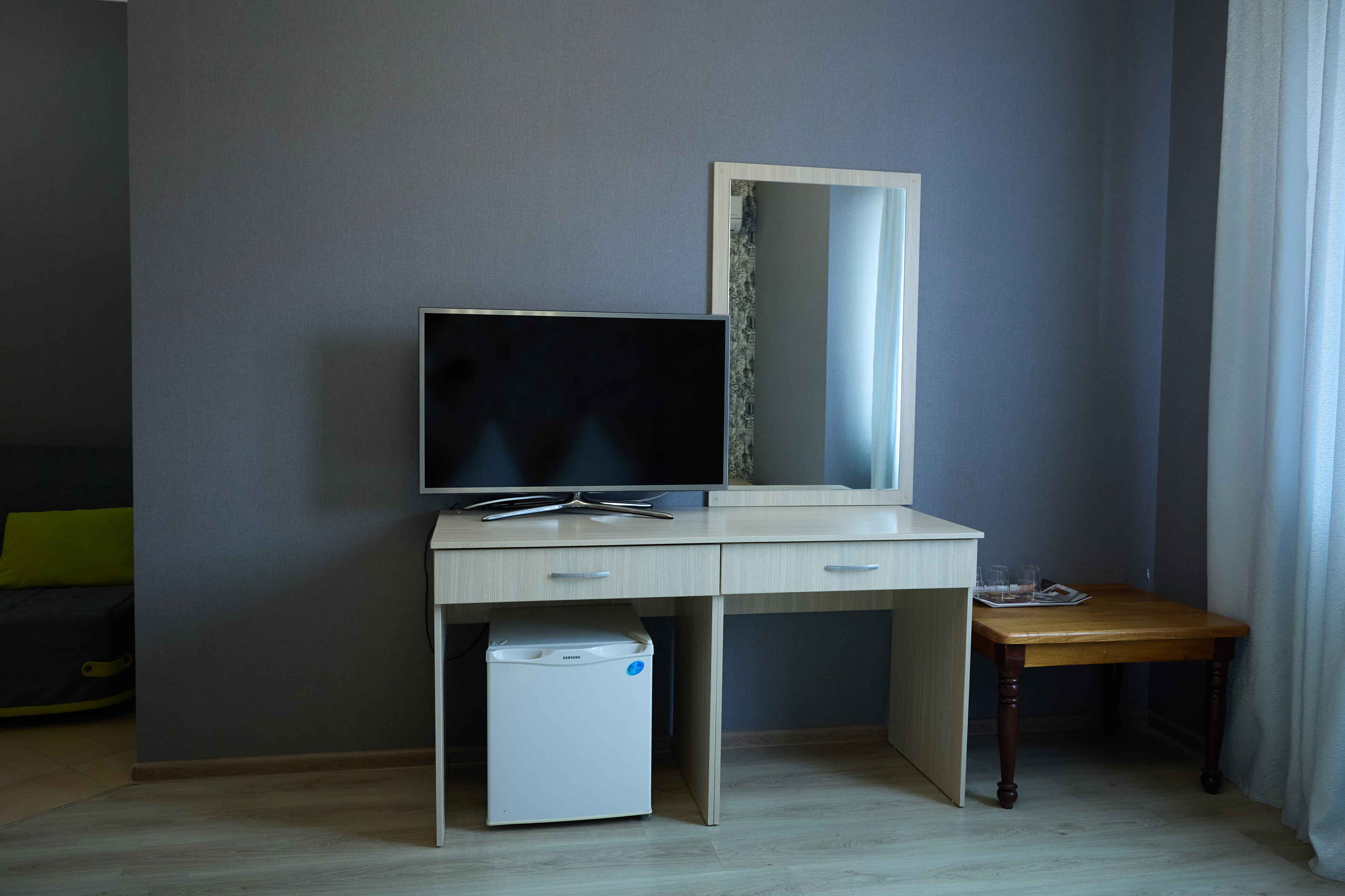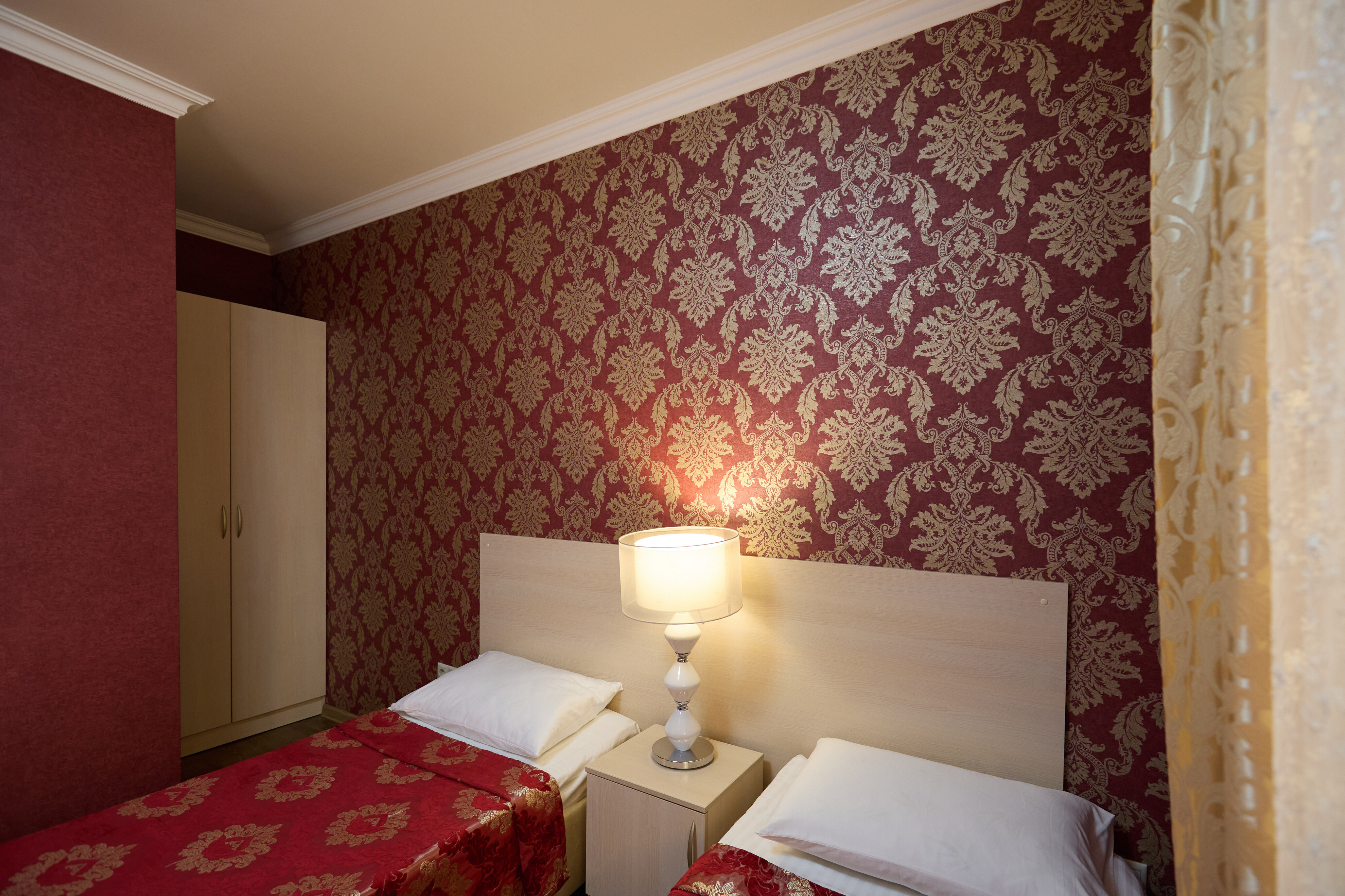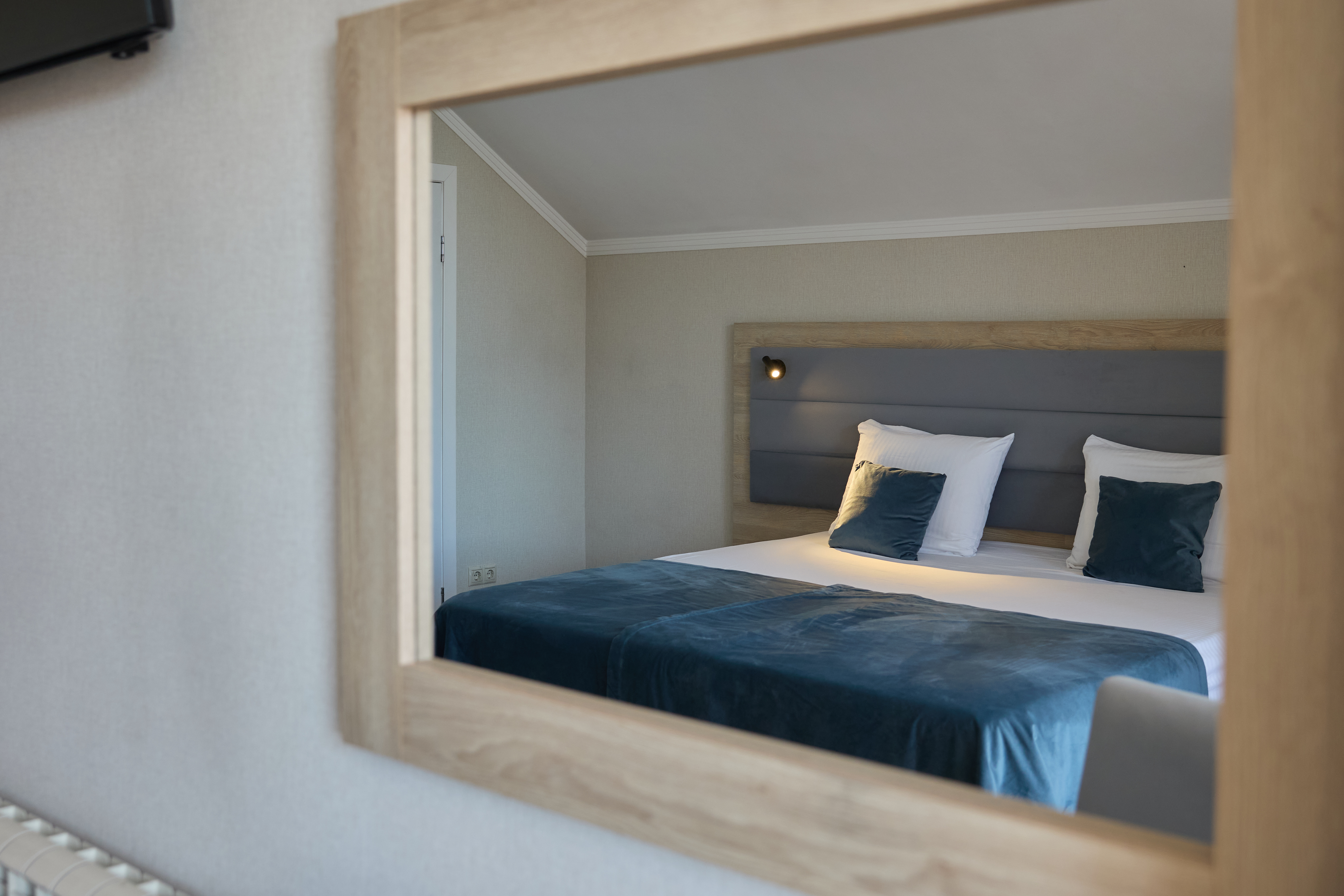 В номере: вешалка, зеркало, кровати односпальные, прикроватные тумбочки, стол, стулья, шкаф, кондиционер, пляжные полотенца, телевизор, утюг, холодильник