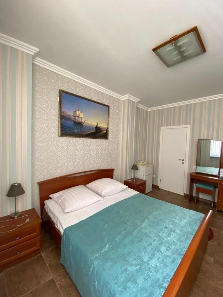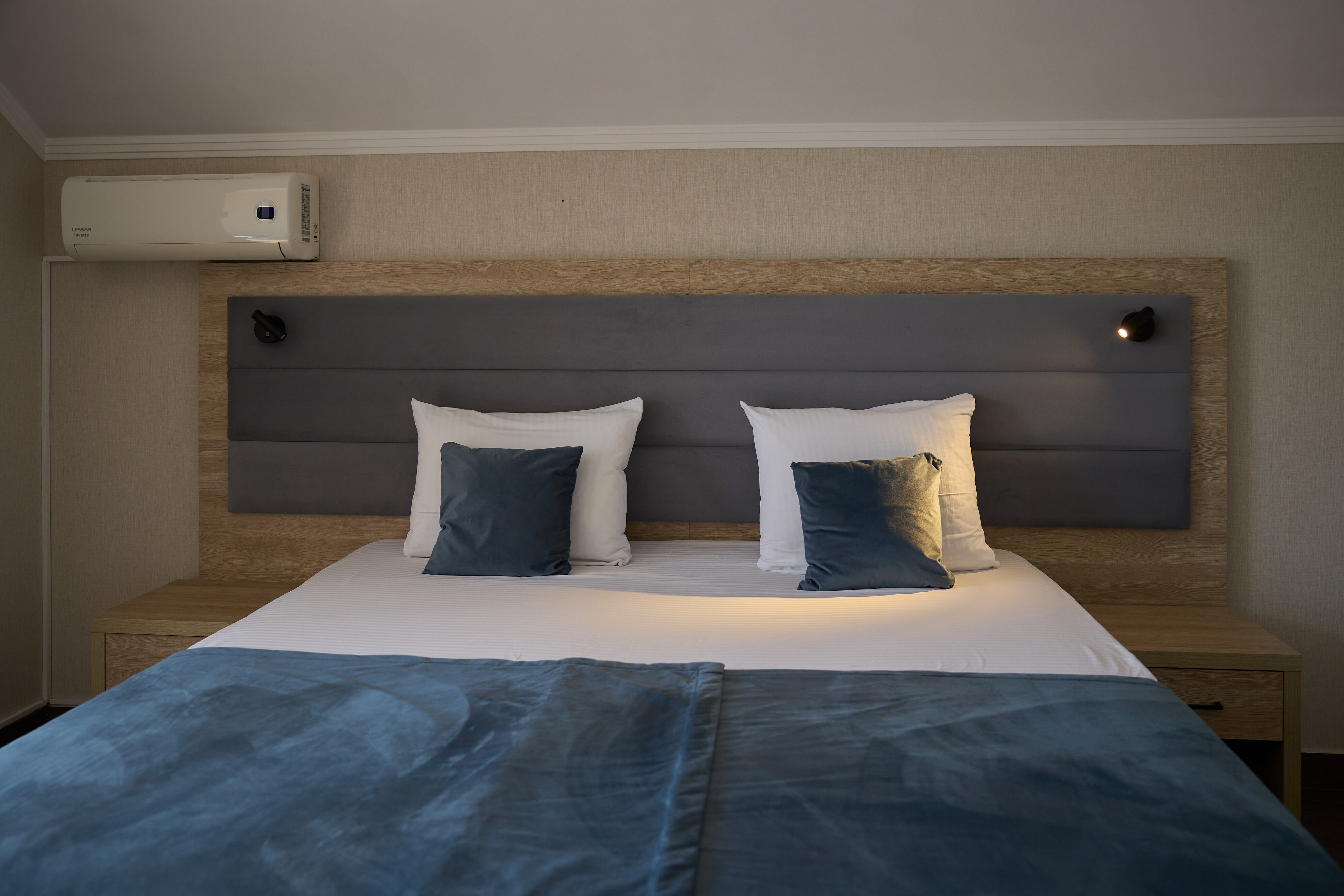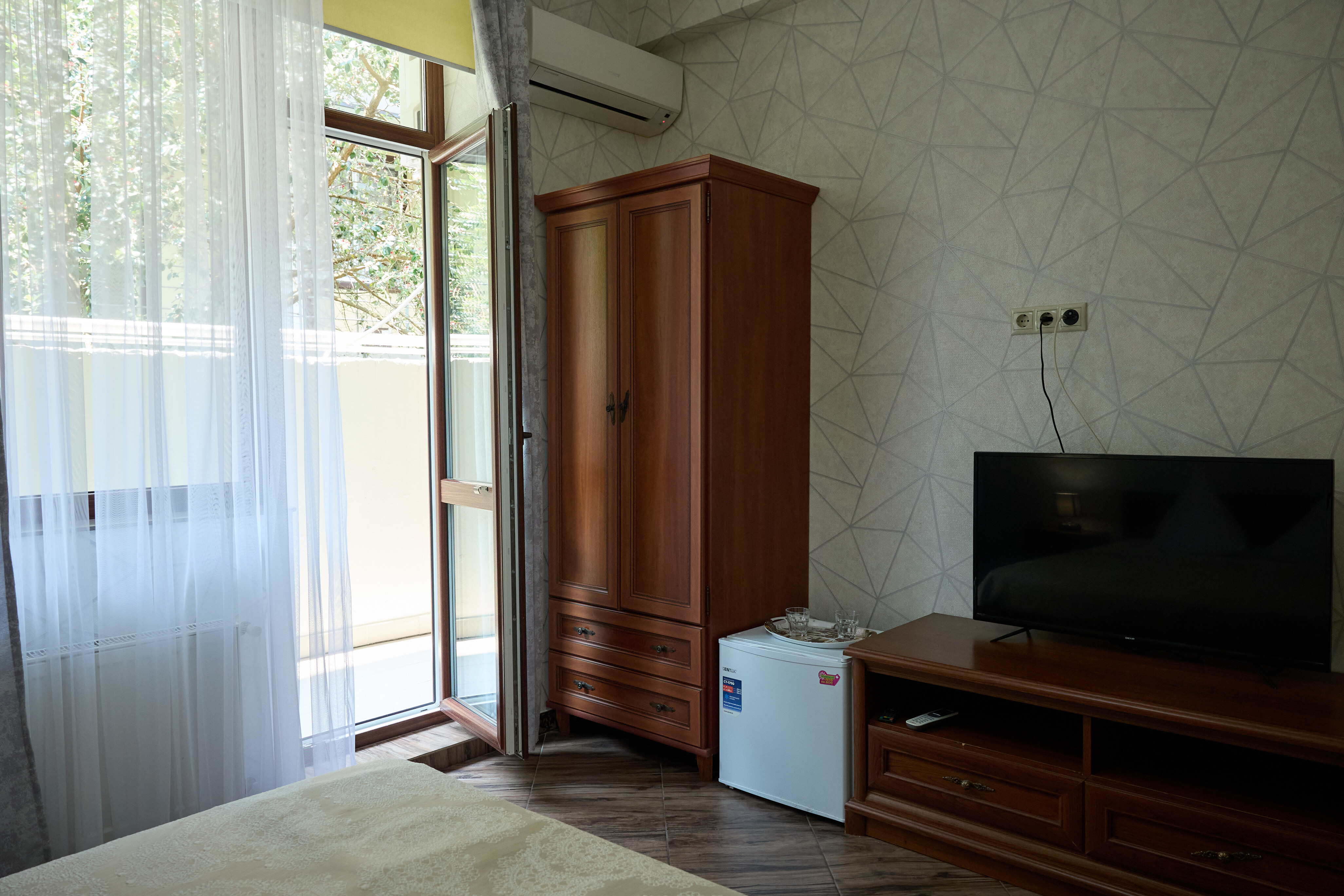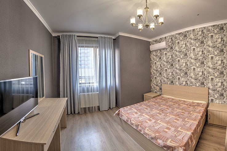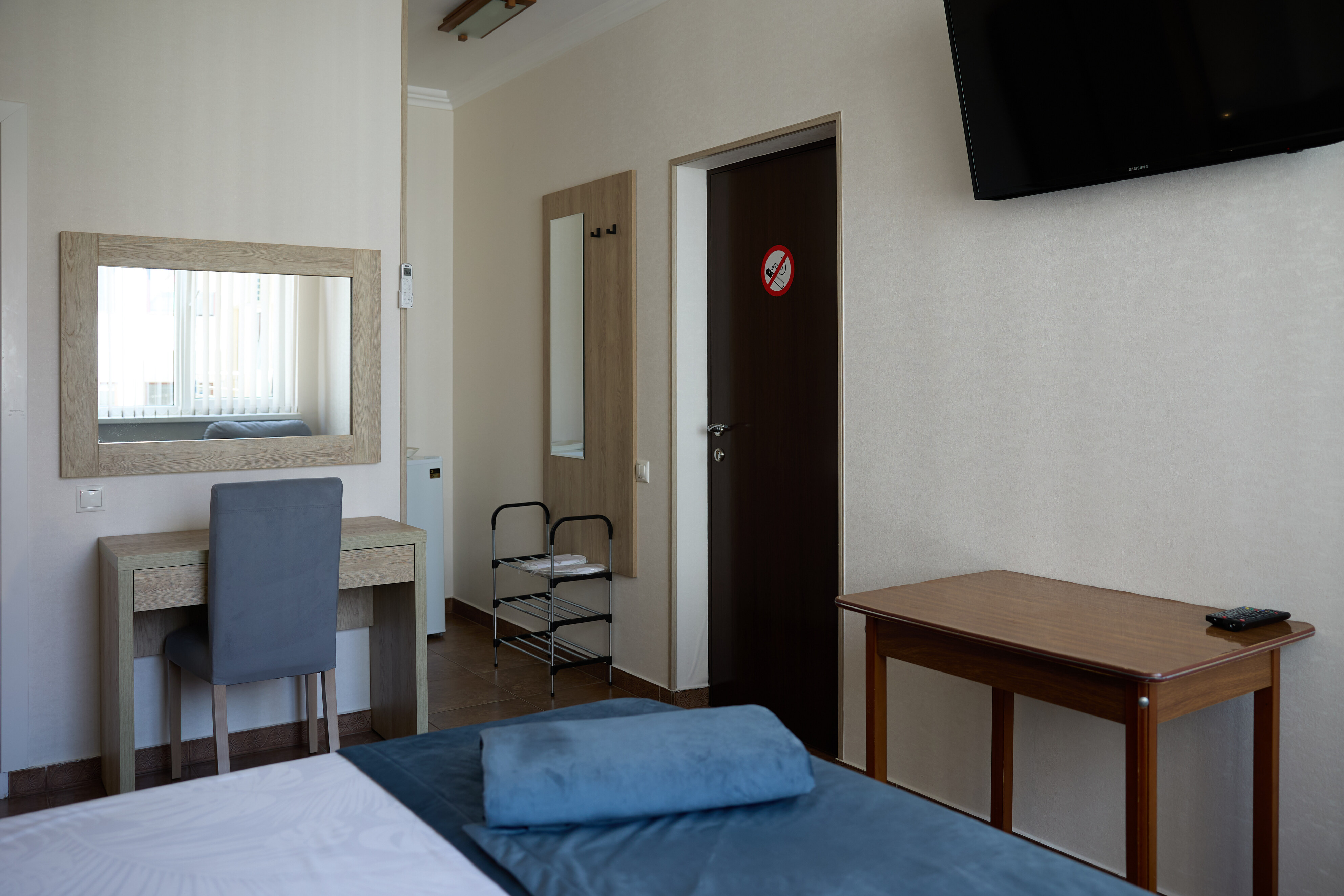 В номере: вешалка, зеркало, кровать двуспальная, прикроватные тумбочки, стол, стулья, шкаф, кондиционер, пляжные полотенца, телевизор, утюг, холодильник