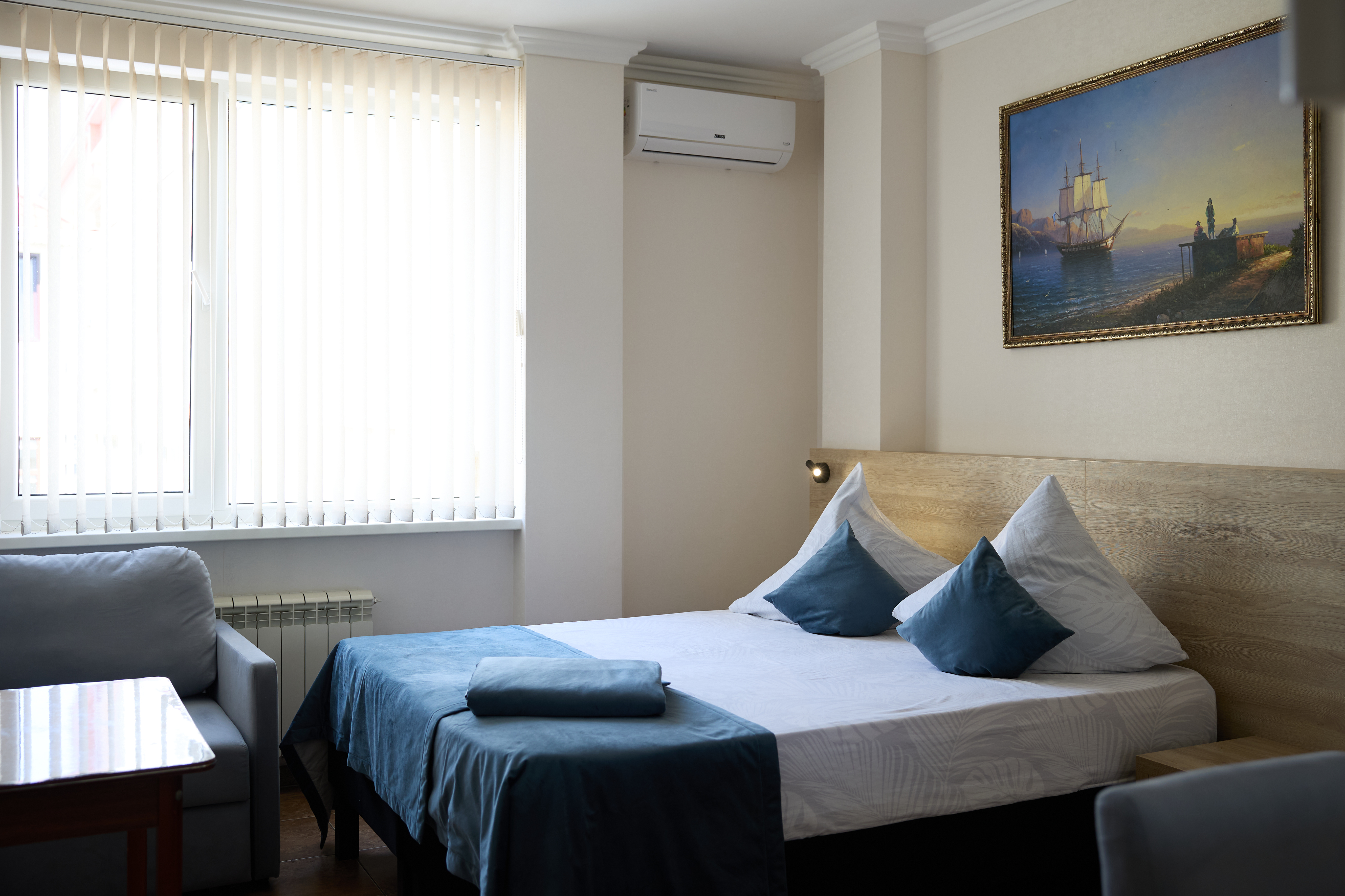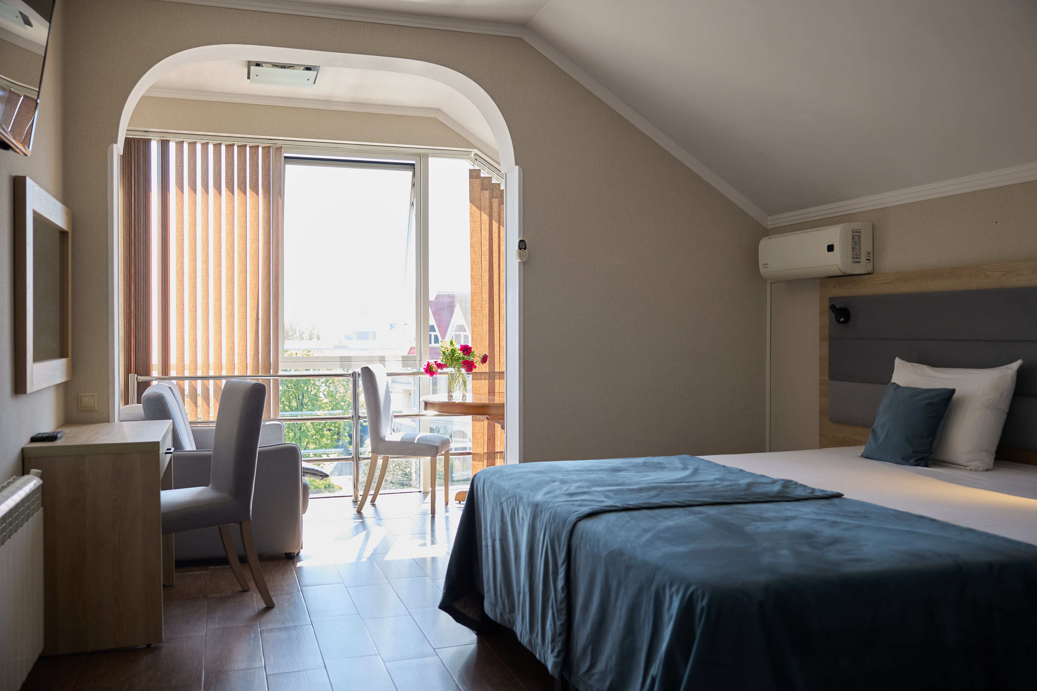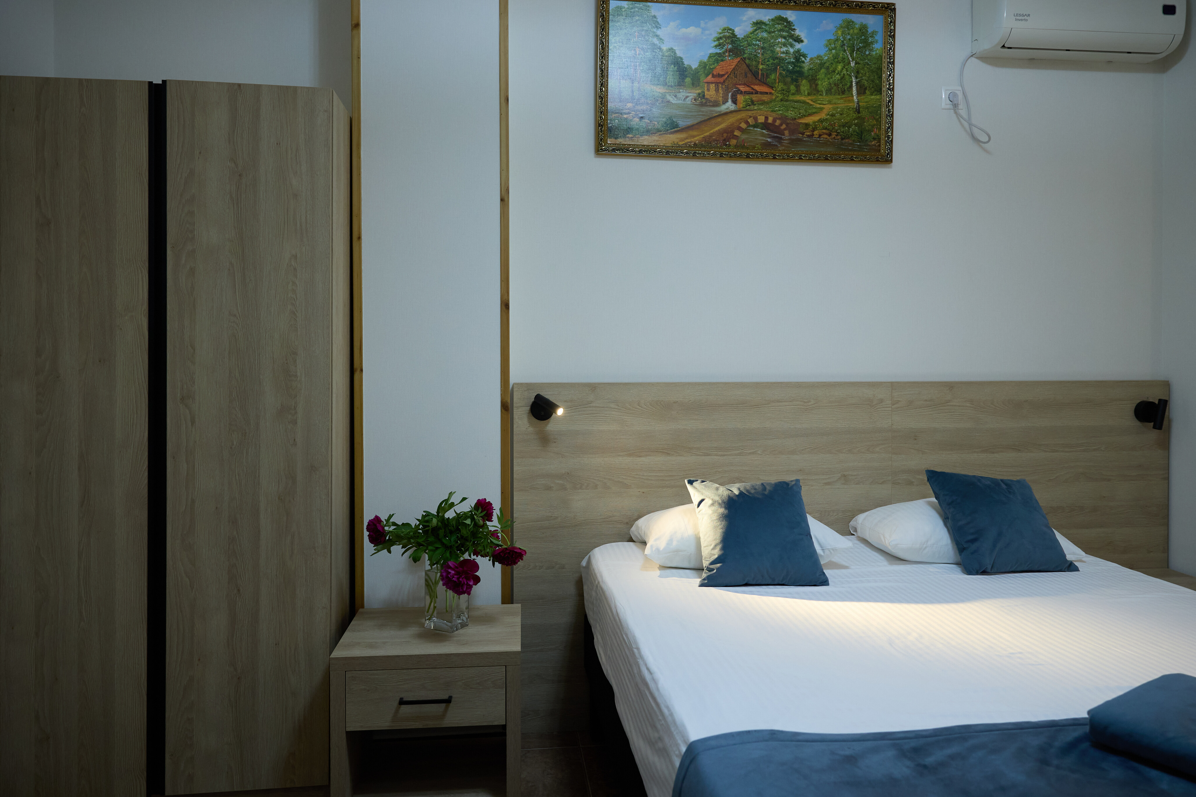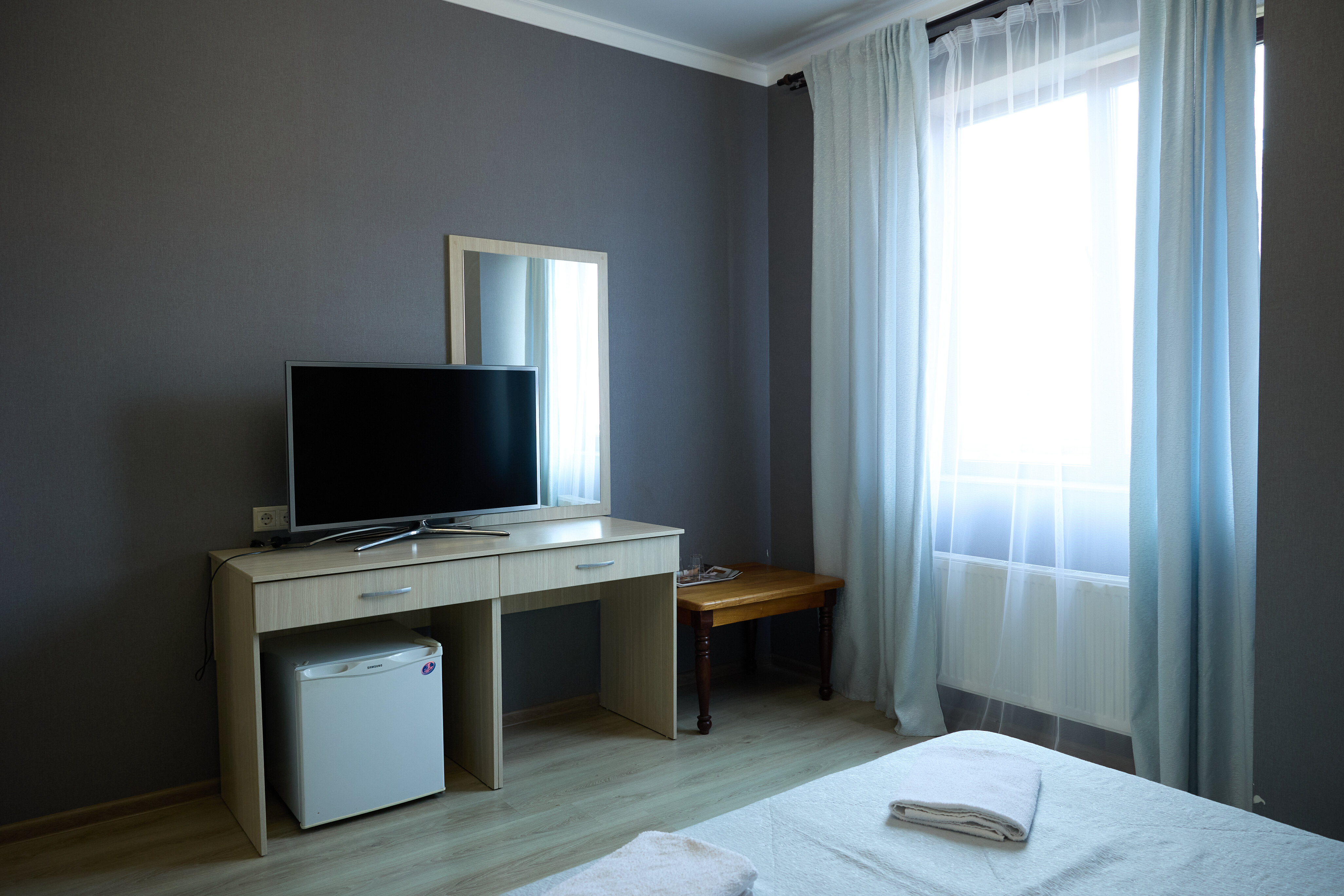 В номере: вешалка, зеркало, кровать двуспальная, прикроватные тумбочки, стол, стулья, шкаф, кондиционер, пляжные полотенца, телевизор, утюг, холодильник