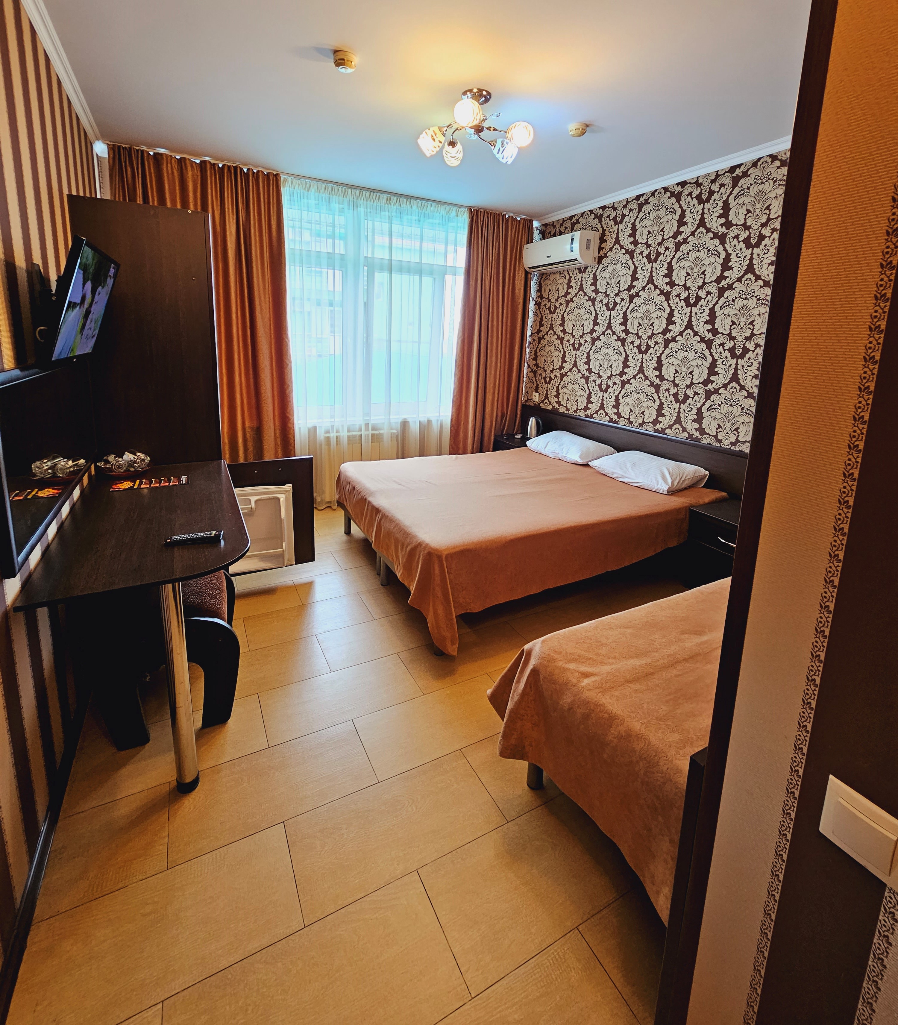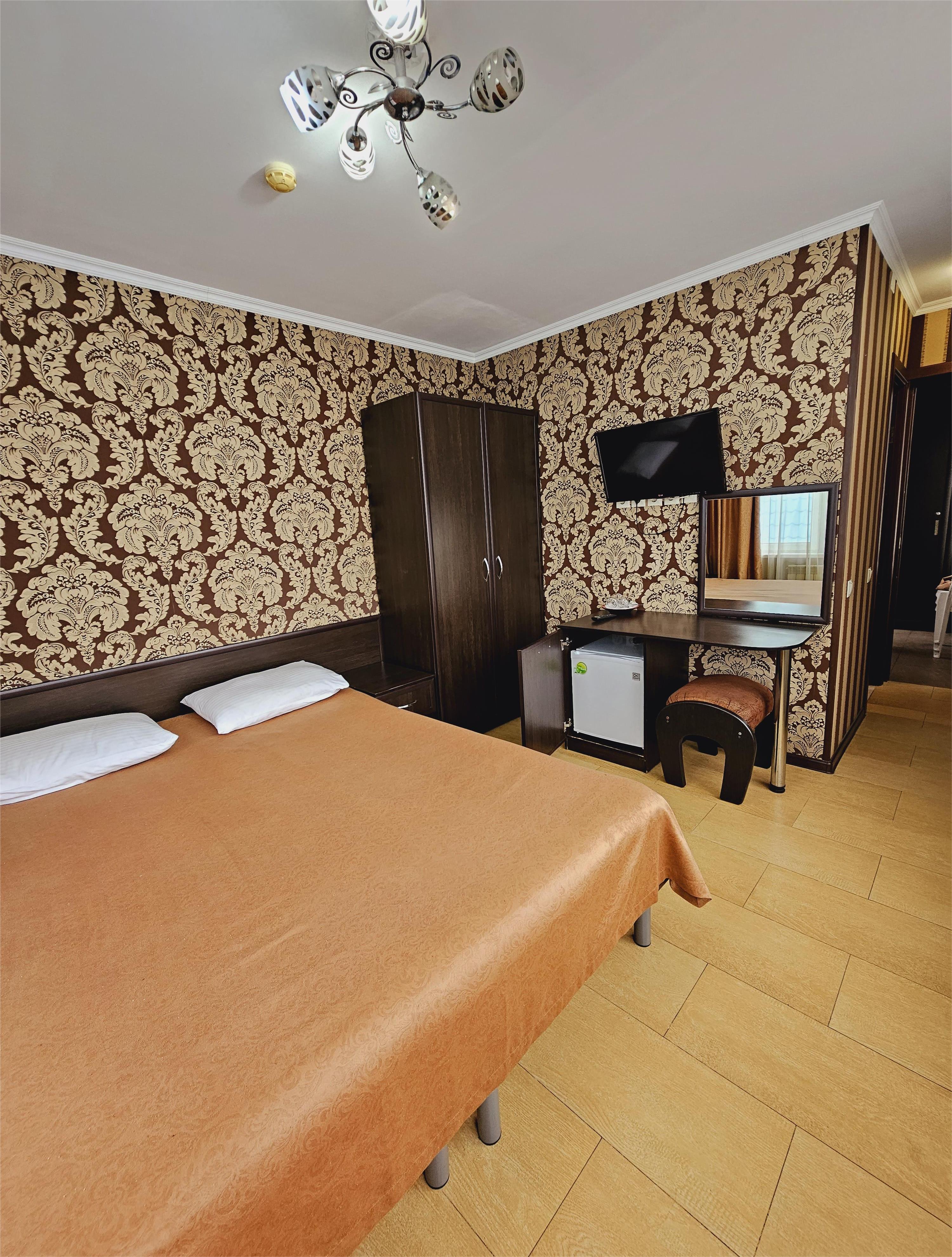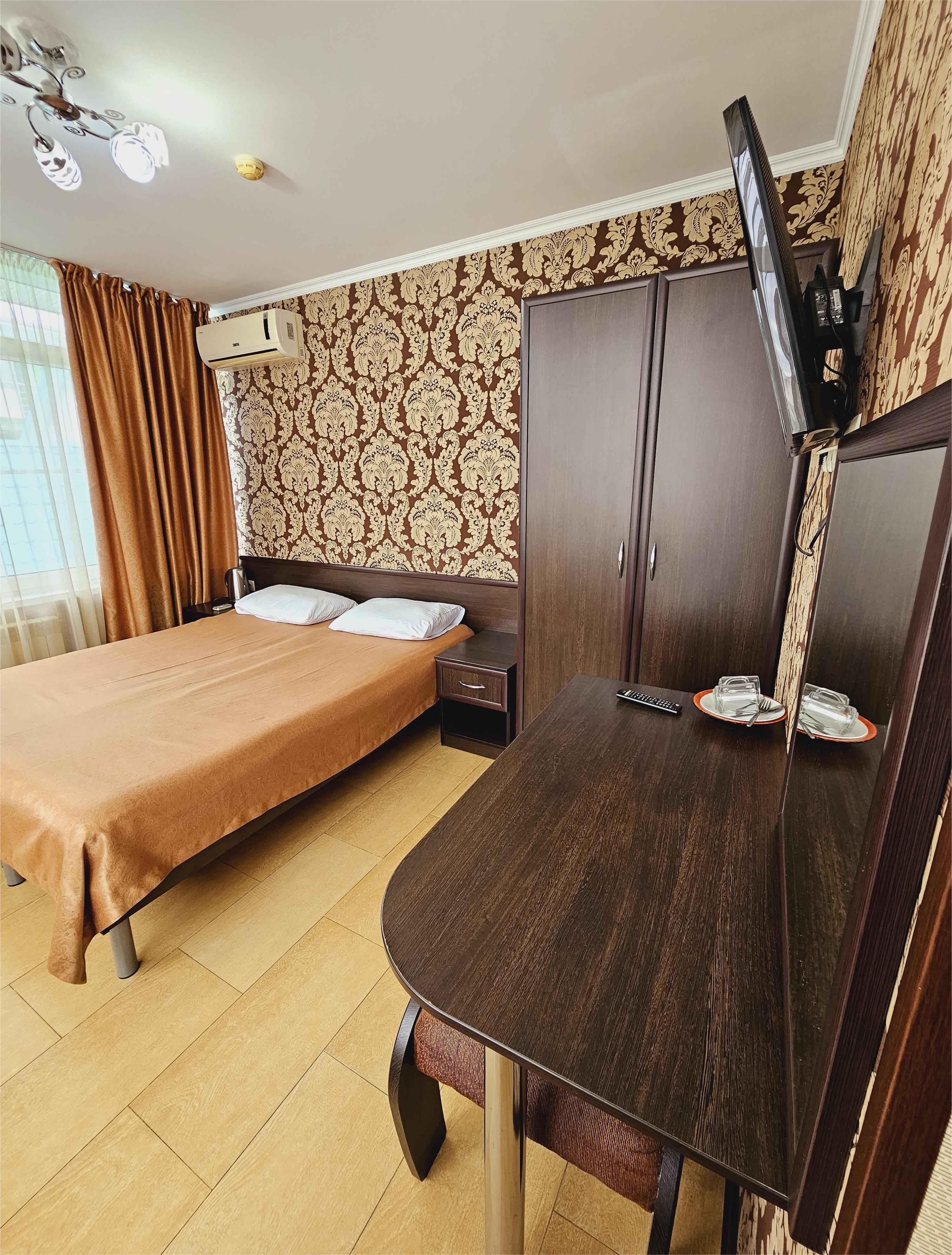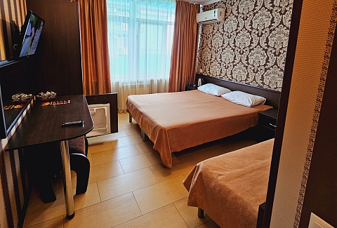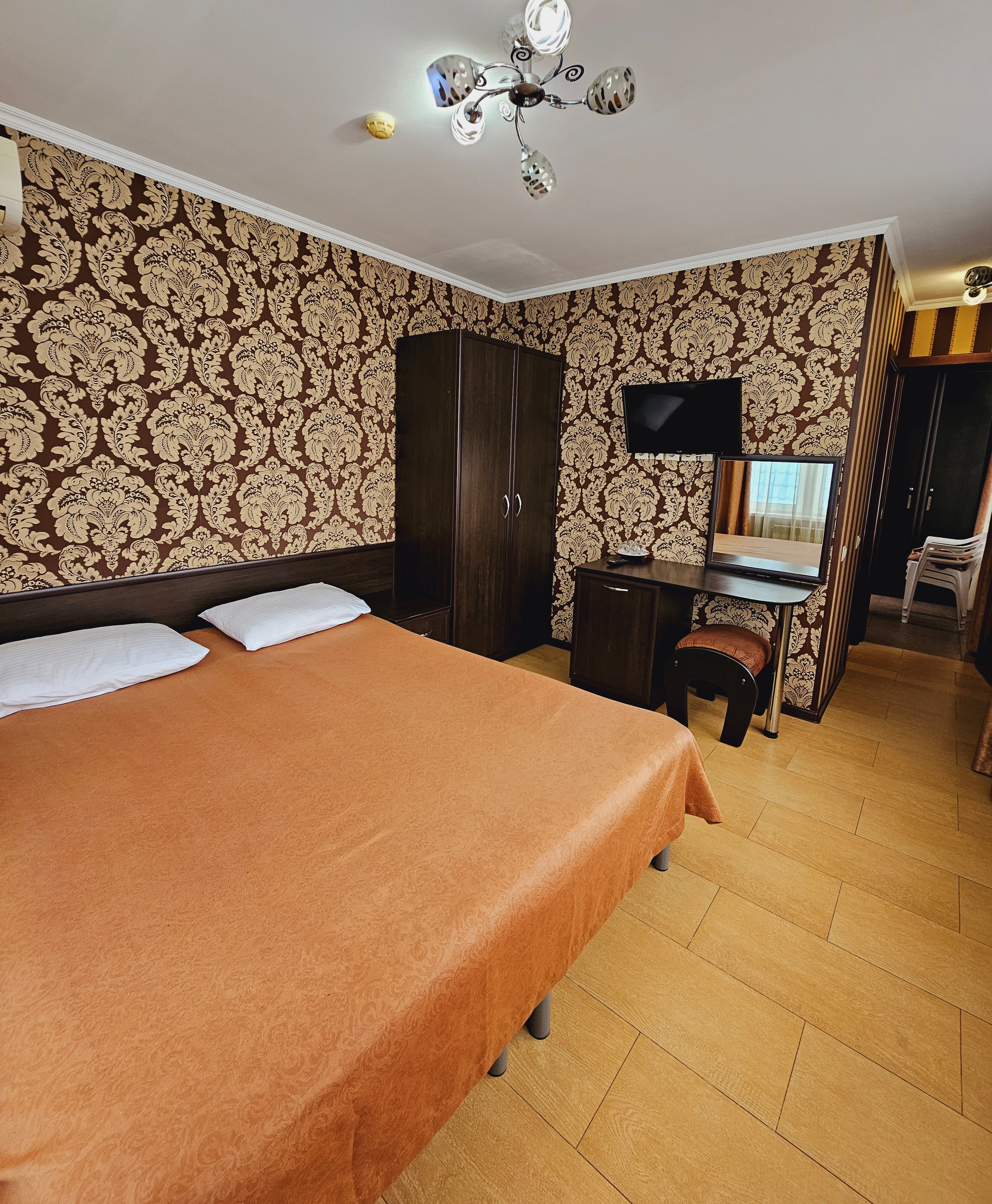 В номере: вешалка, зеркало, кровать двуспальная, кровать односпальная, прикроватные тумбочки, стол, стул, шкаф, кондиционер, мини-холодильник, сейф, телевизор ЖК, утюг, электрочайник
