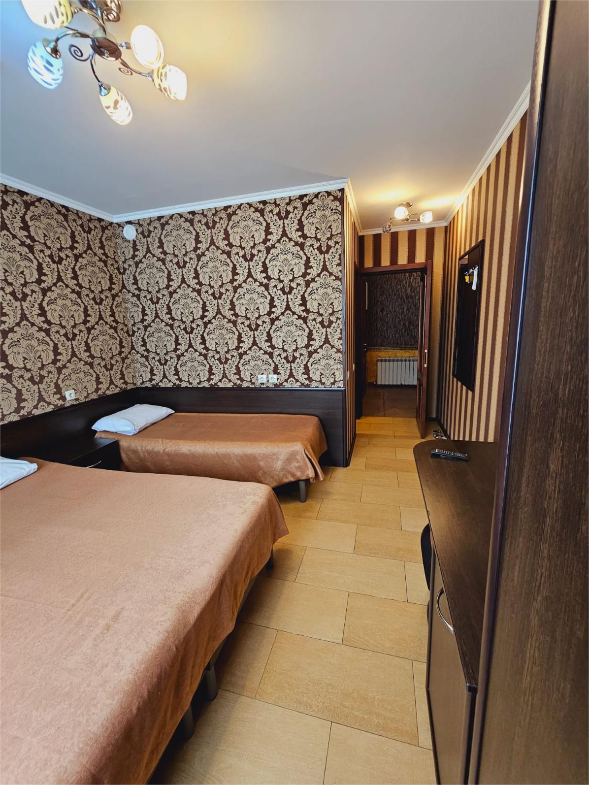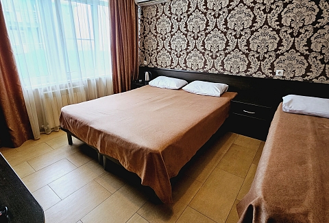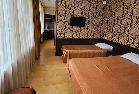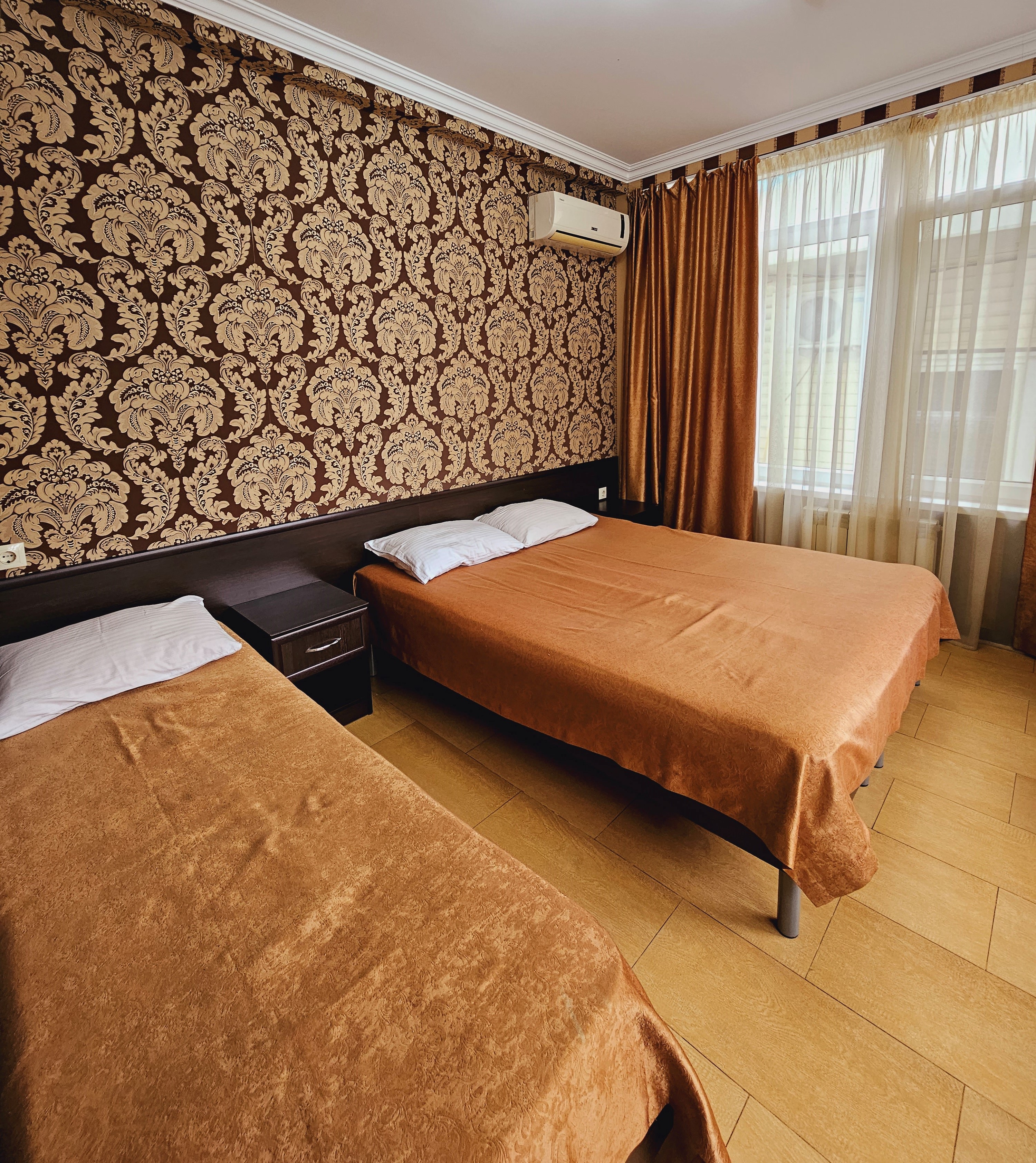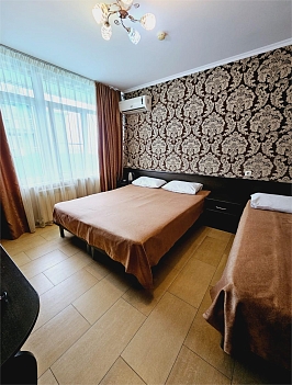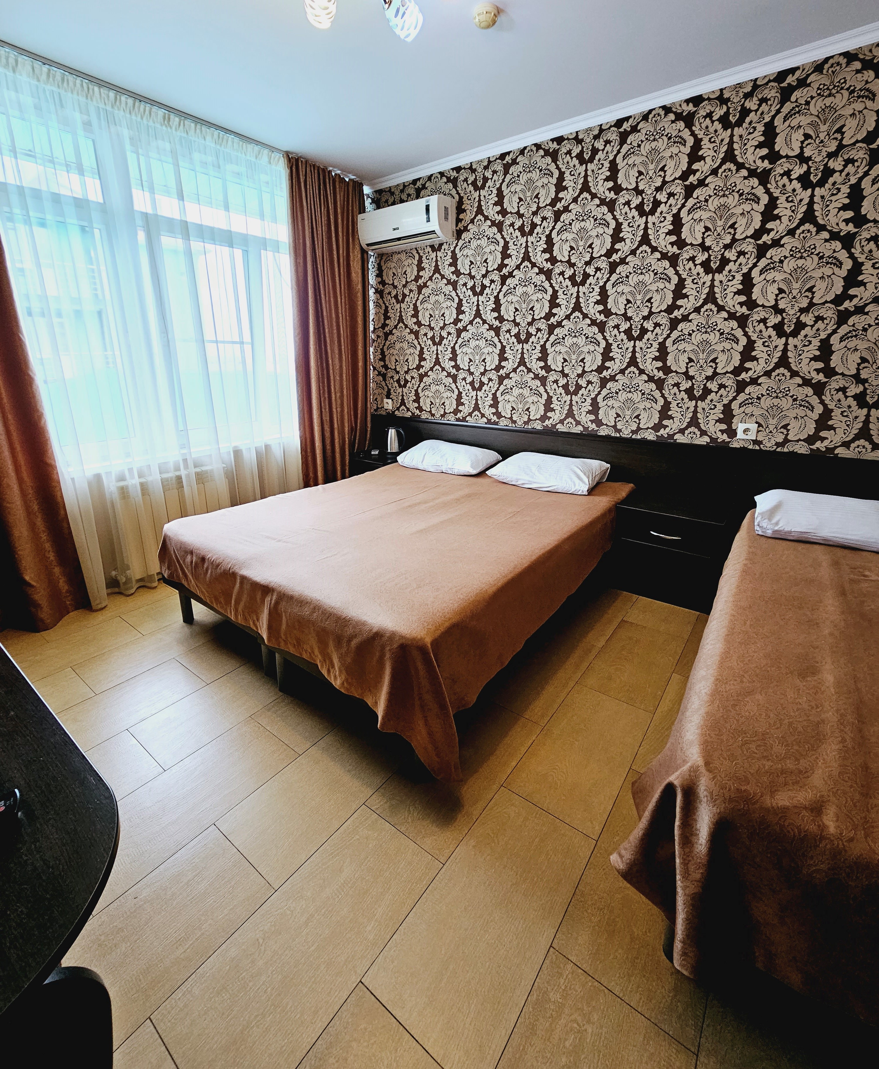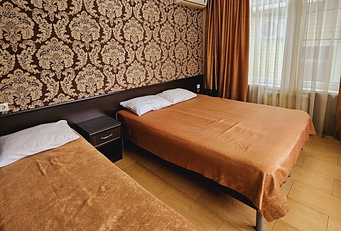 В номере: вешалка, зеркало, кровать двуспальная, кровать односпальная, прикроватные тумбочки, стол, стул, шкаф, кондиционер, мини-холодильник, сейф, телевизор ЖК, утюг, электрочайник