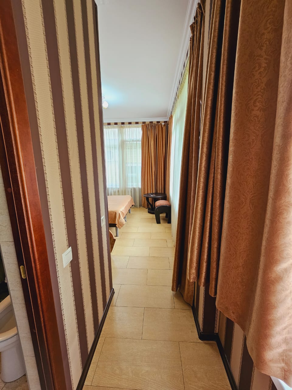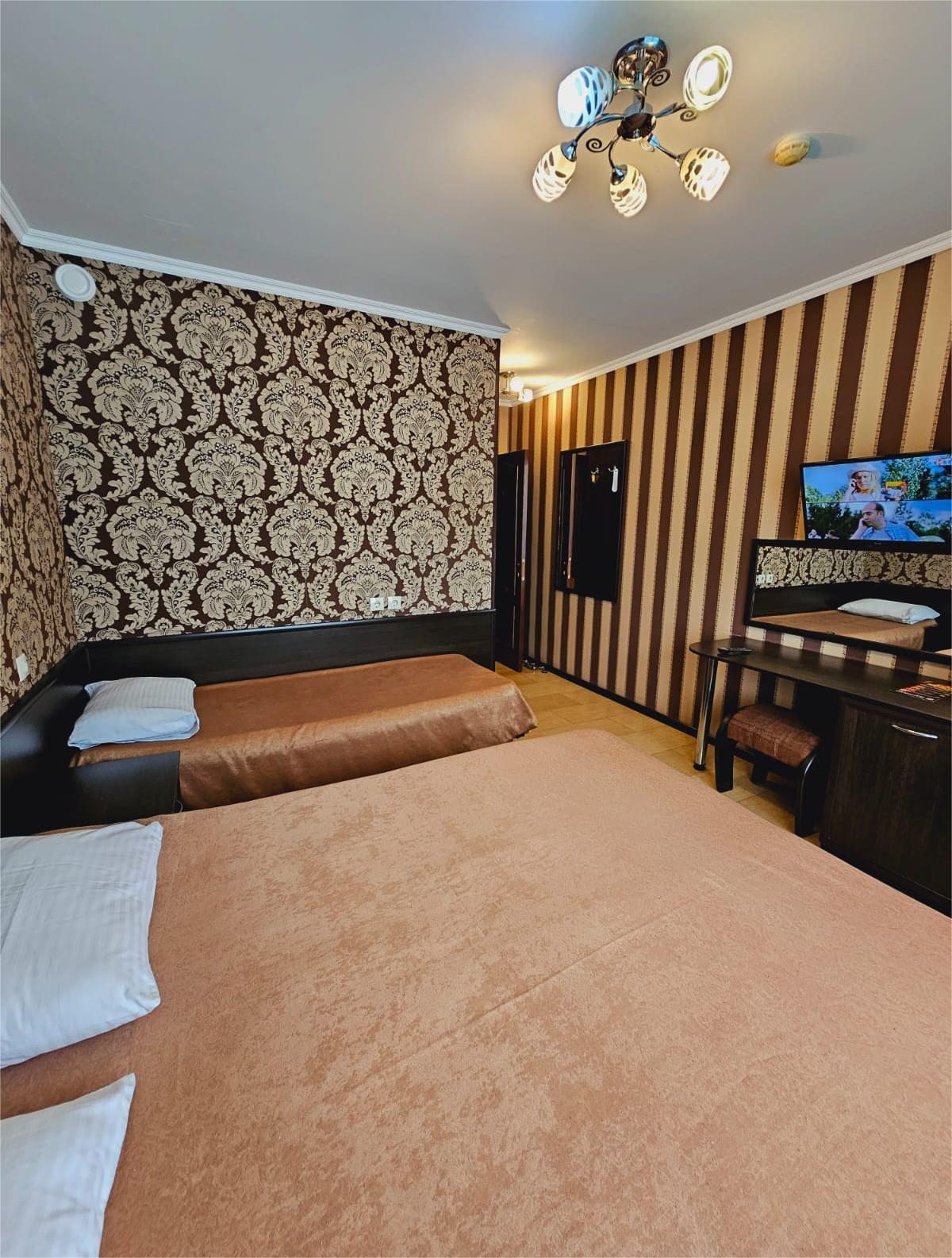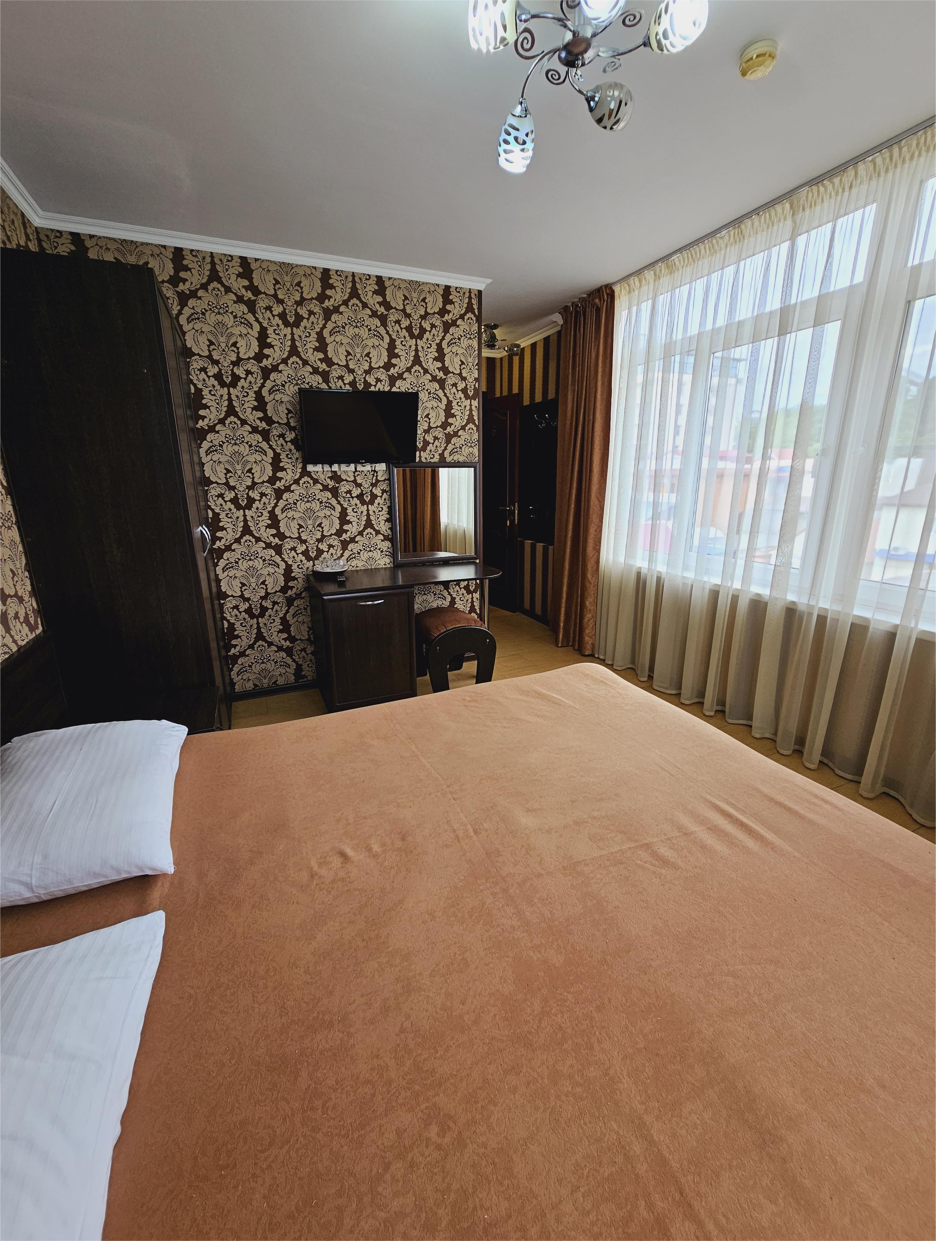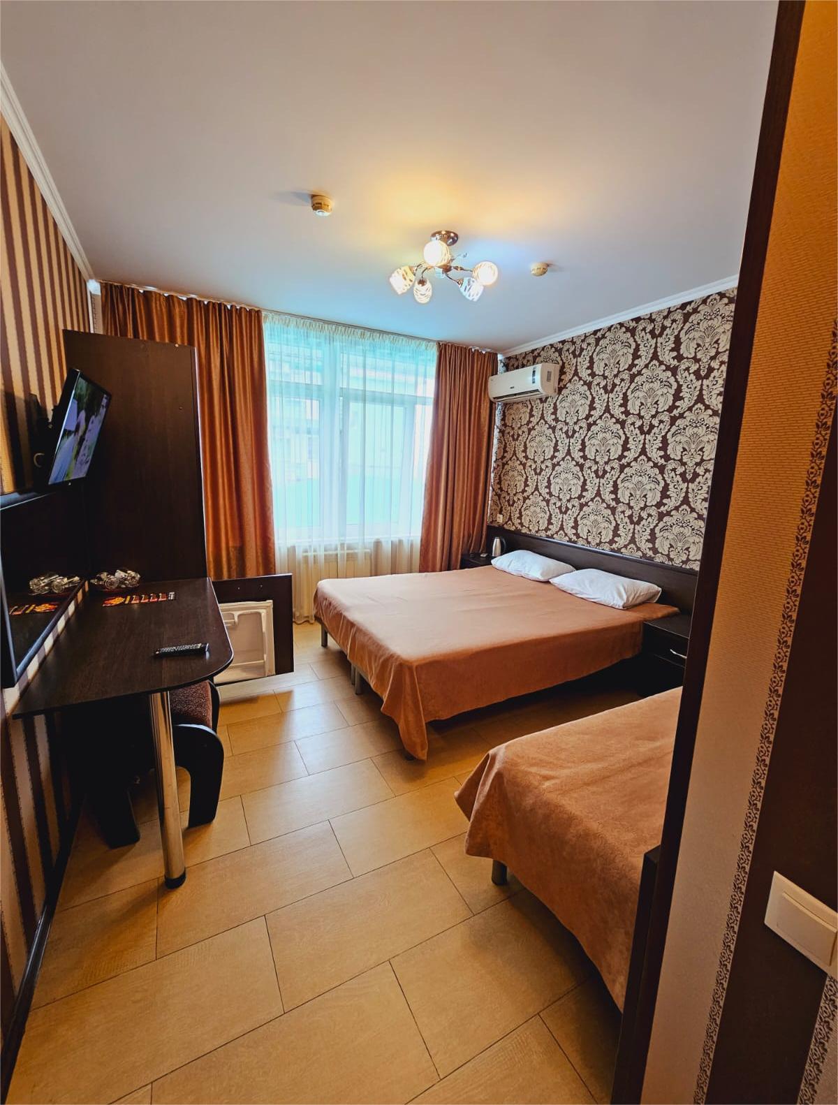 В номере: вешалка, зеркало, кровать двуспальная, кровать односпальная, прикроватные тумбочки, стол, стул, шкаф, кондиционер, мини-холодильник, сейф, телевизор ЖК, утюг, электрочайник