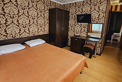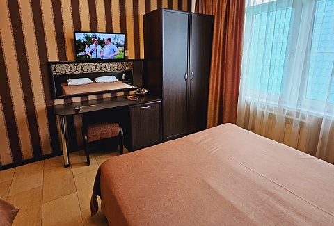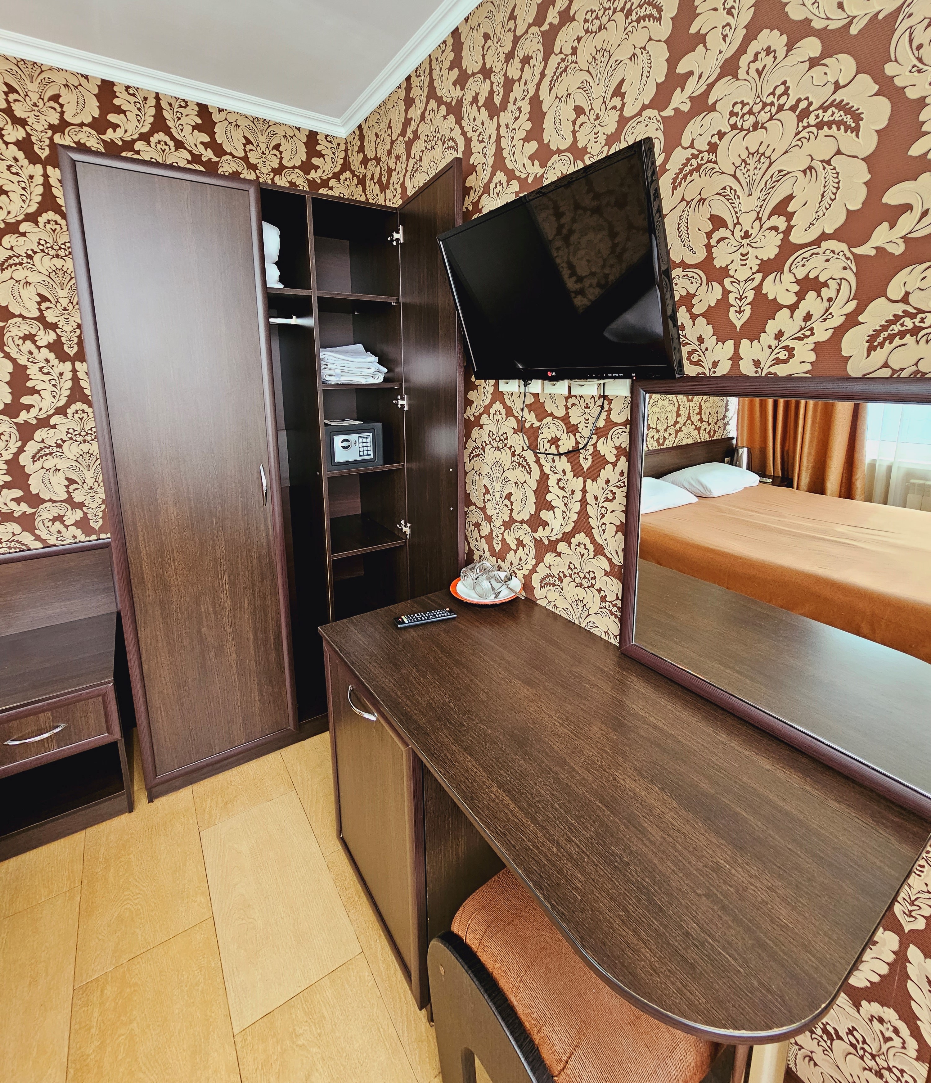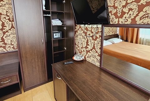 В номере: вешалка, зеркало, кровати односпальные /одна двуспальная кровать, прикроватные тумбочки, стол, стул, шкаф, кондиционер, мини-холодильник, сейф, телевизор ЖК, утюг, электрочайник