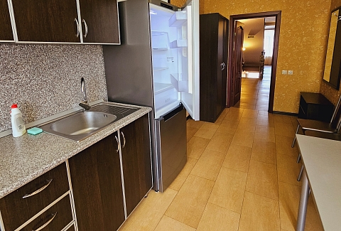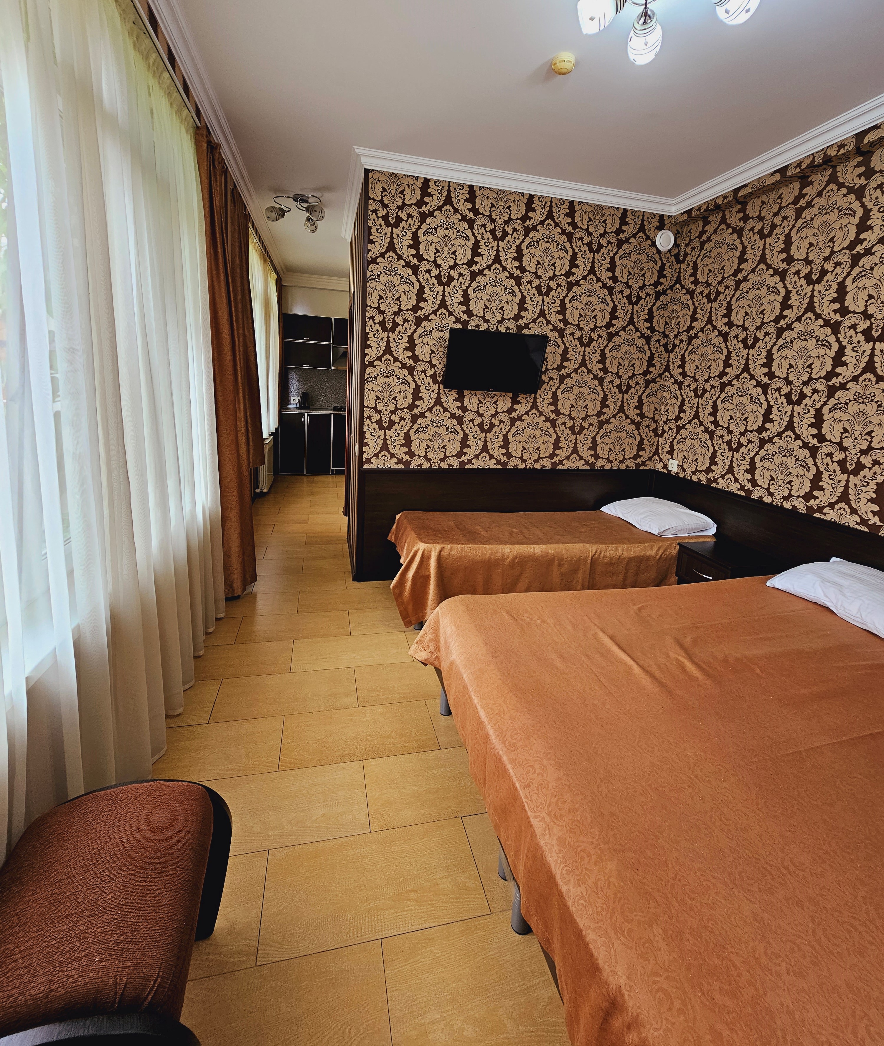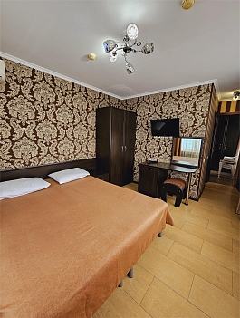 В номере: вешалка, зеркало, кровать двуспальная, кровать односпальная, прикроватные тумбочки, стол, стулья, шкаф, кондиционер, набор посуды, сейф, телевизор ЖК, утюг, электрочайник