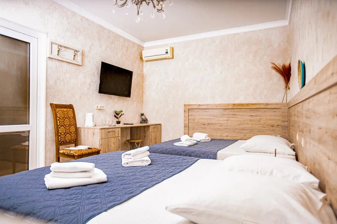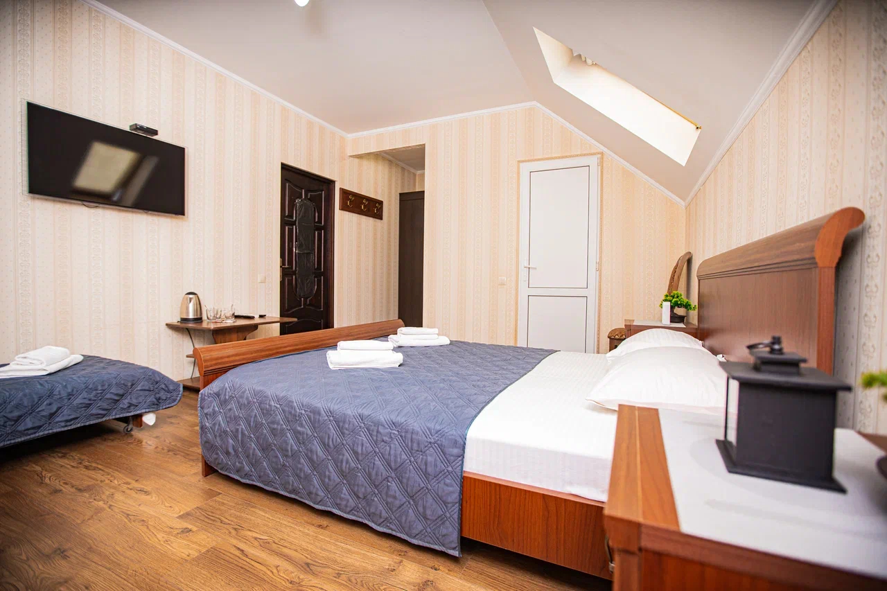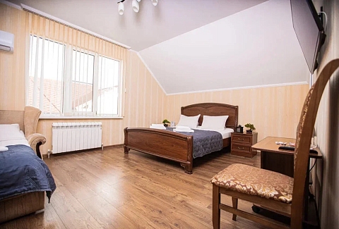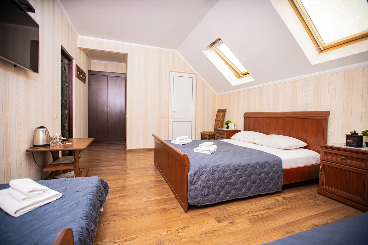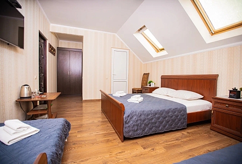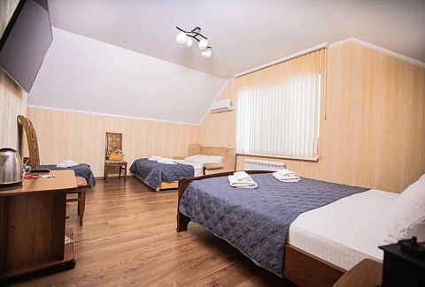 В номере: вешалка, диван раскладной, зеркало, кровать двуспальная, кровать односпальная, прикроватные тумбочки, стол, стулья, шкаф, кондиционер, мини-холодильник, телевизор, электрочайник