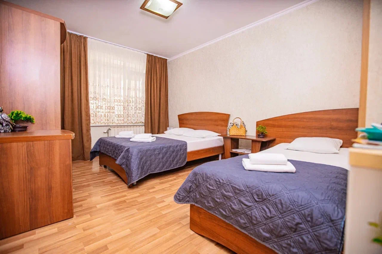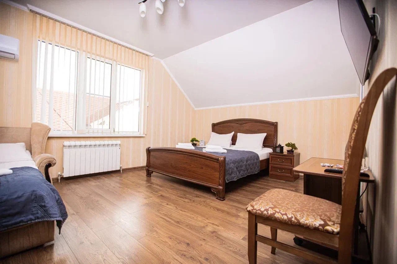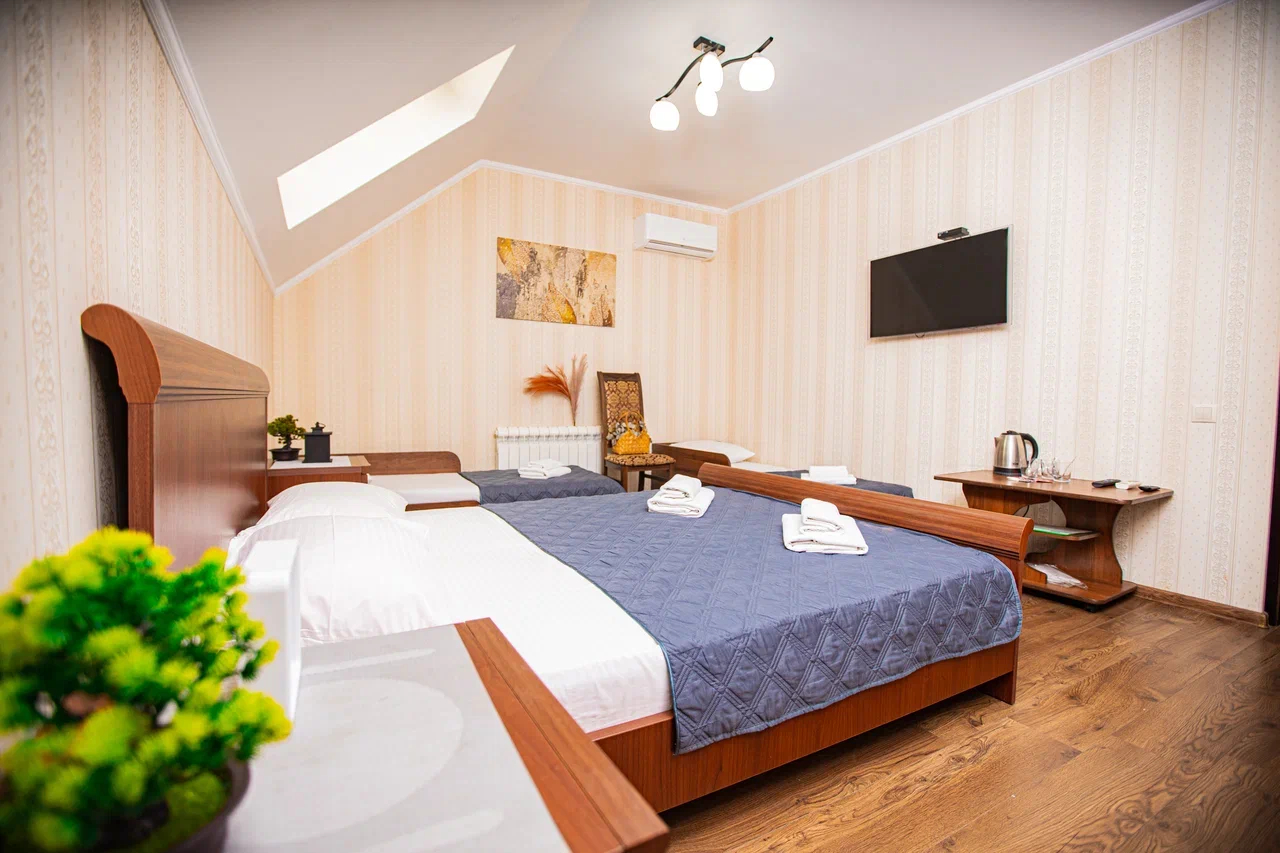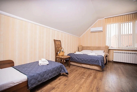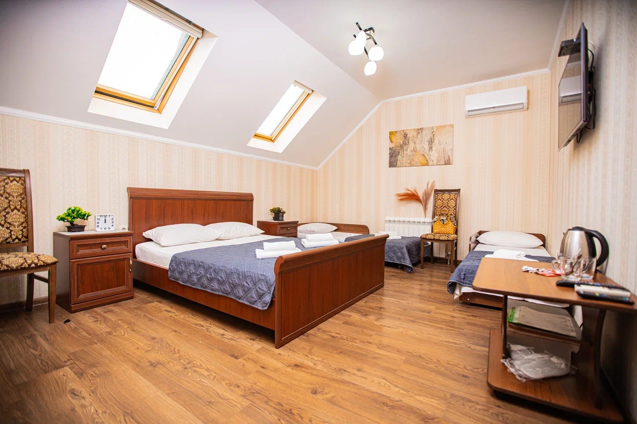 В номере: вешалка, диван раскладной, зеркало, кровать двуспальная, кровать односпальная, прикроватные тумбочки, стол, стулья, шкаф, кондиционер, мини-холодильник, телевизор, электрочайник