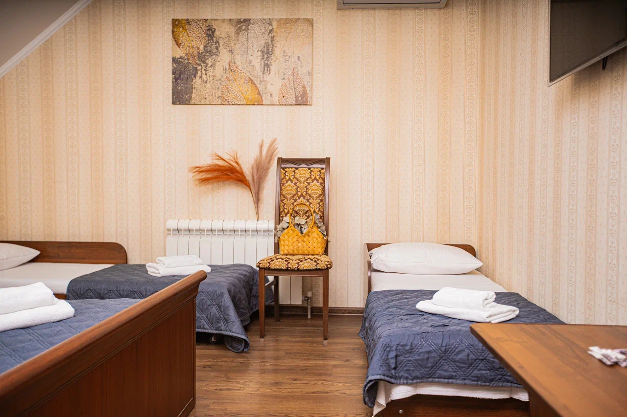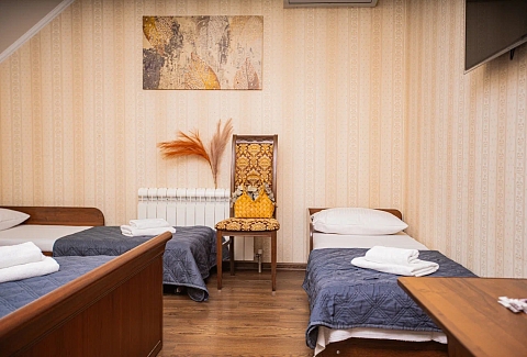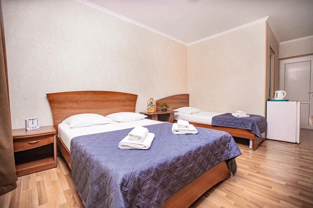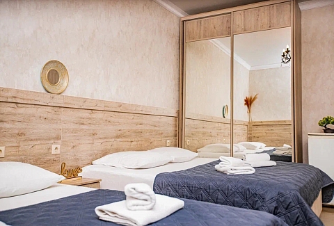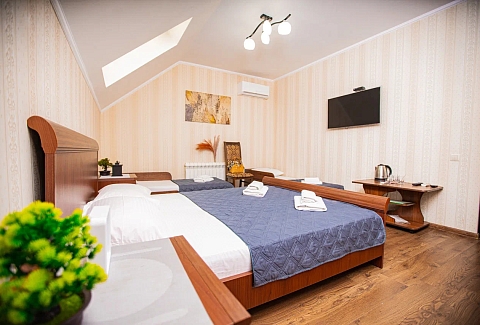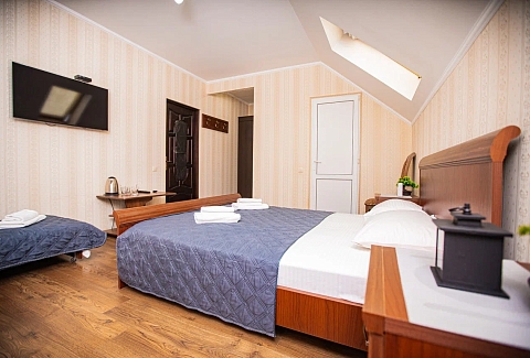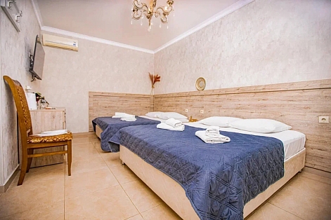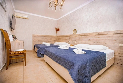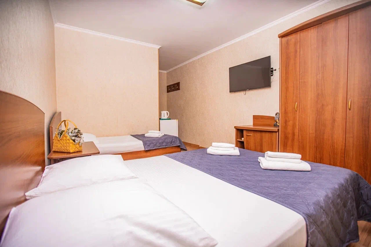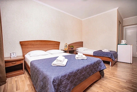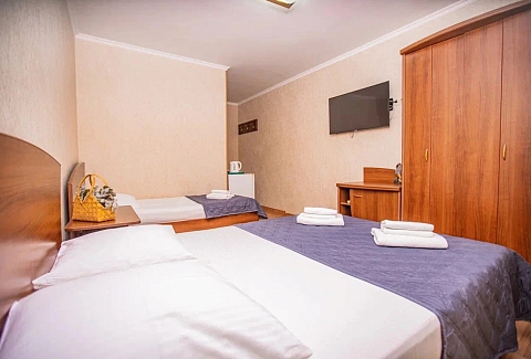 В номере: вешалка, зеркало, кровать двуспальная, кровать односпальная, прикроватные тумбочки, стол, стулья, шкаф, кондиционер, мини-холодильник, телевизор, электрочайник