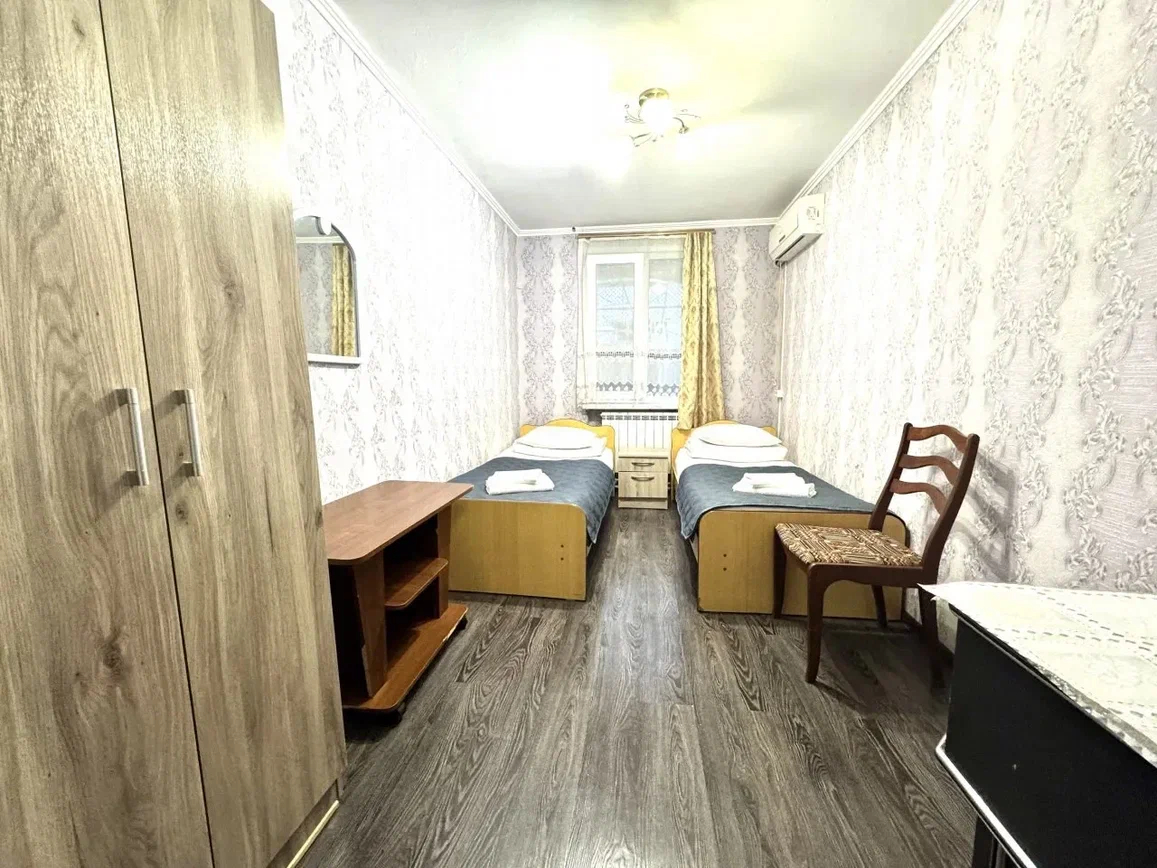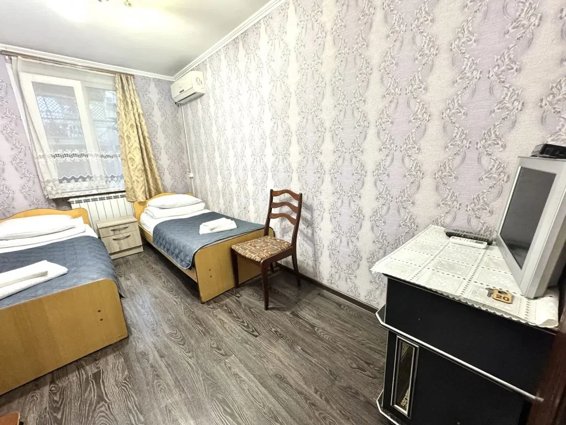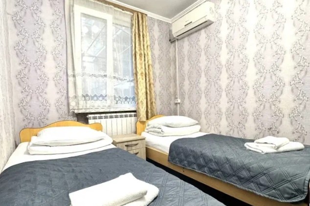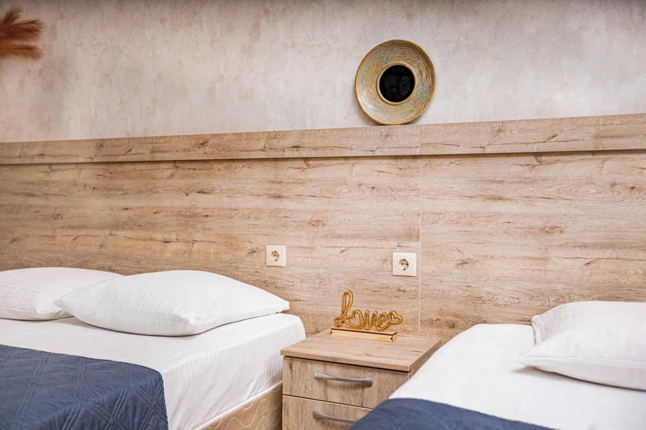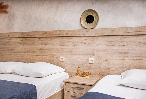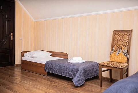 В номере: вешалка, зеркало, кровать двуспальная, кровать односпальная, прикроватные тумбочки, стол, стулья, шкаф, кондиционер, мини-холодильник, телевизор, электрочайник