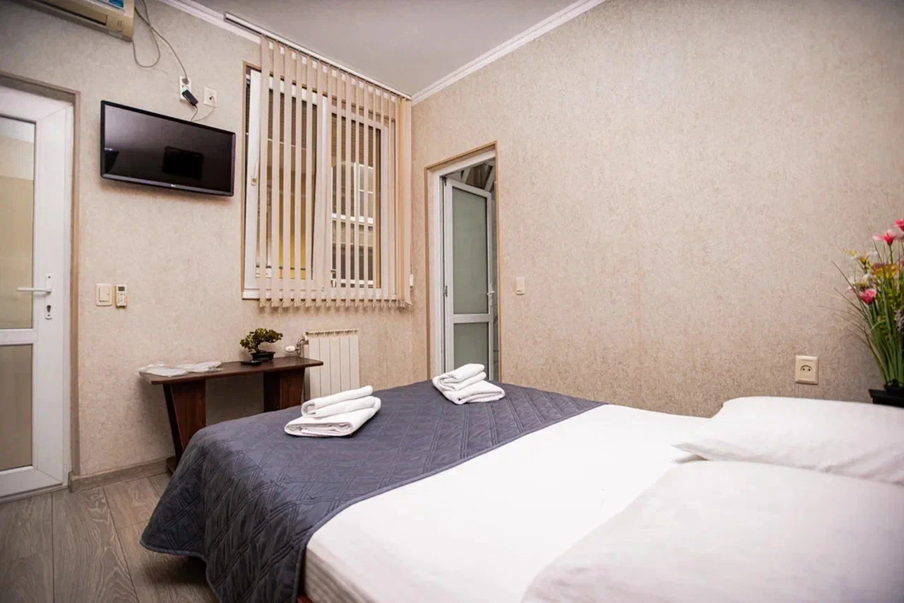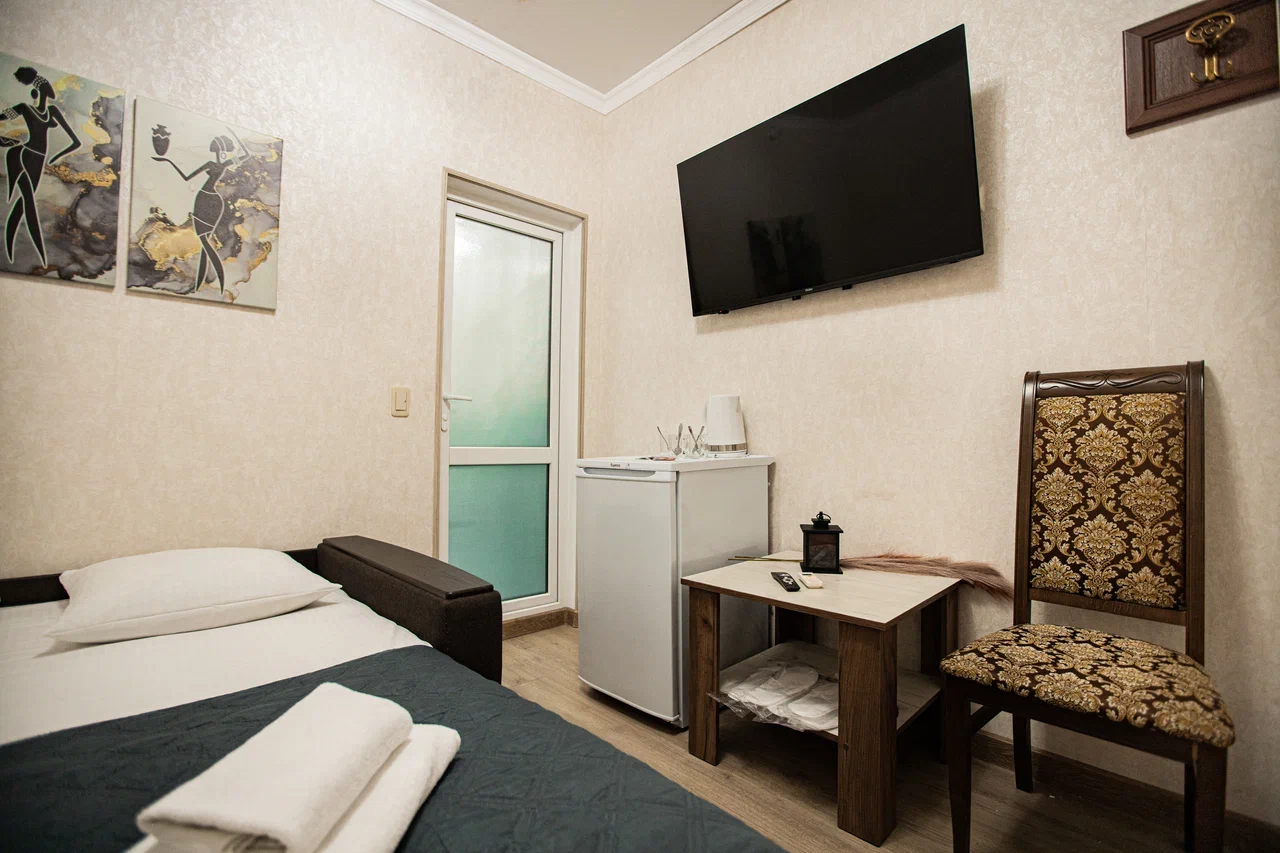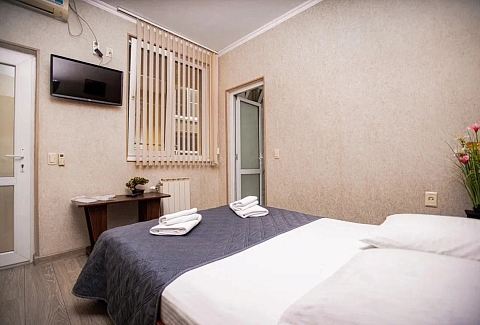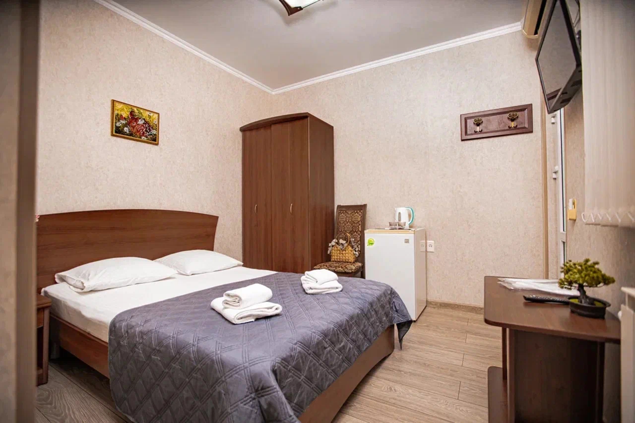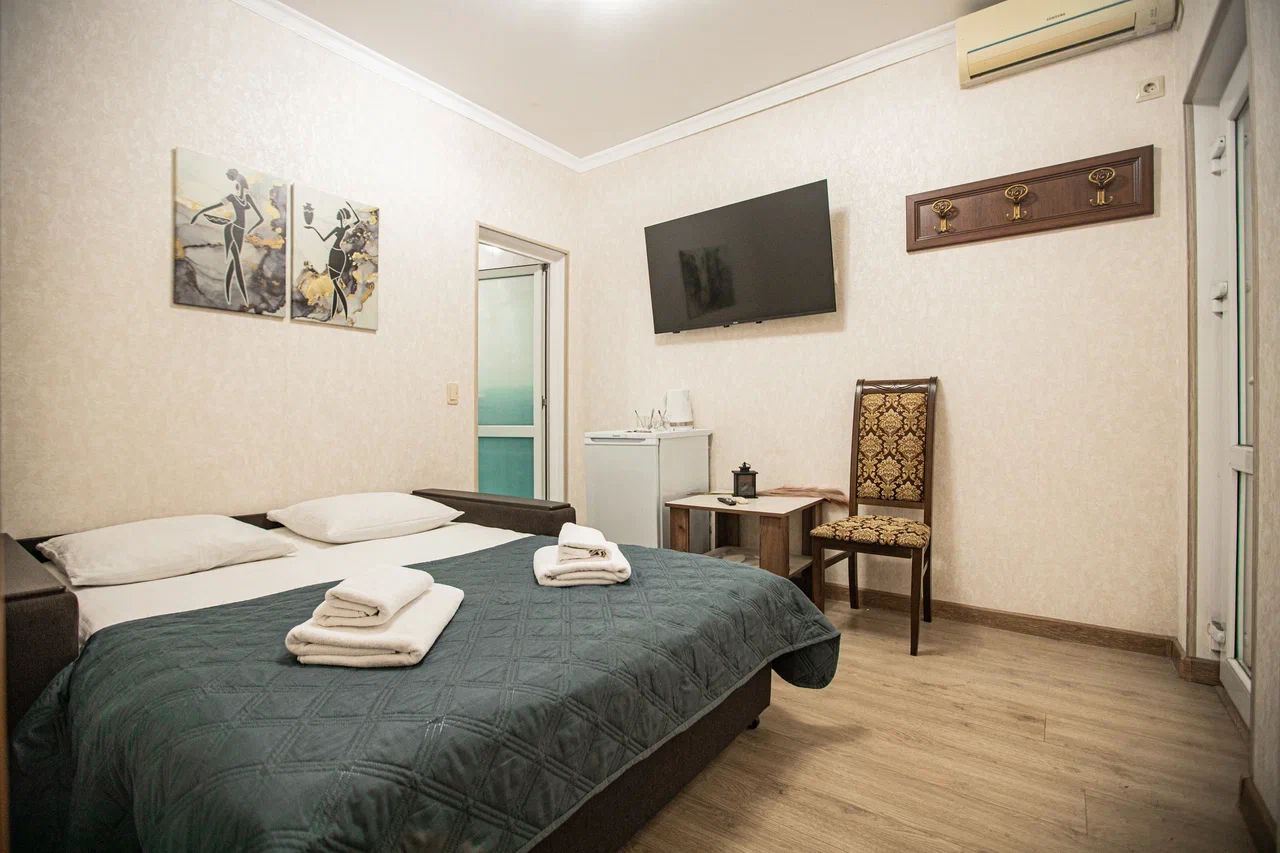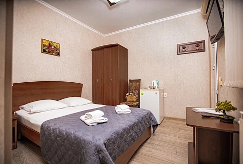 В номере: вешалка, диван раскладной, зеркало, кровать двуспальная, прикроватная тумбочка, стол, стулья, шкаф, кондиционер, мини-холодильник, телевизор, электрочайник