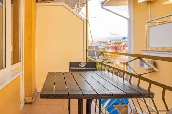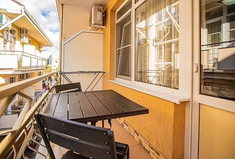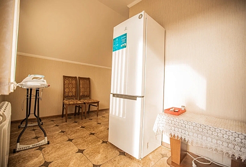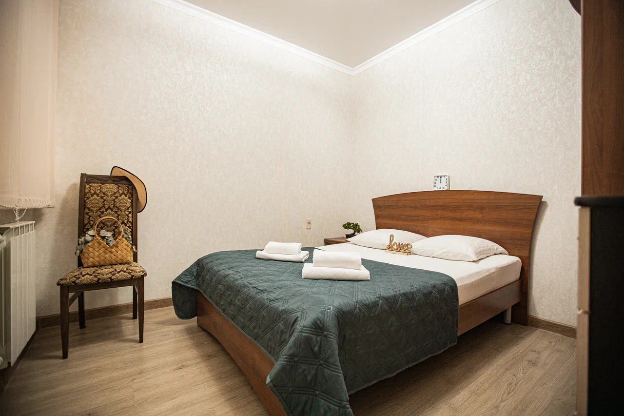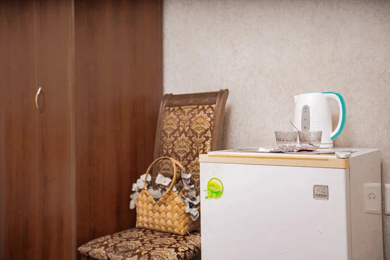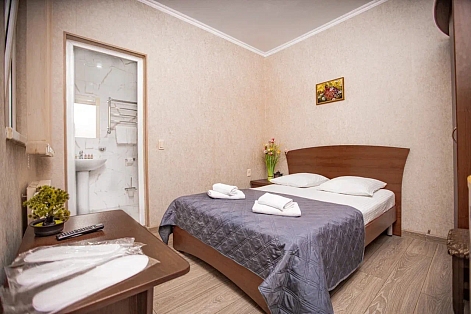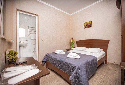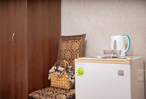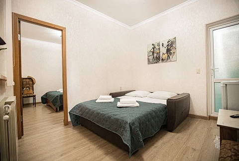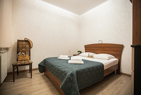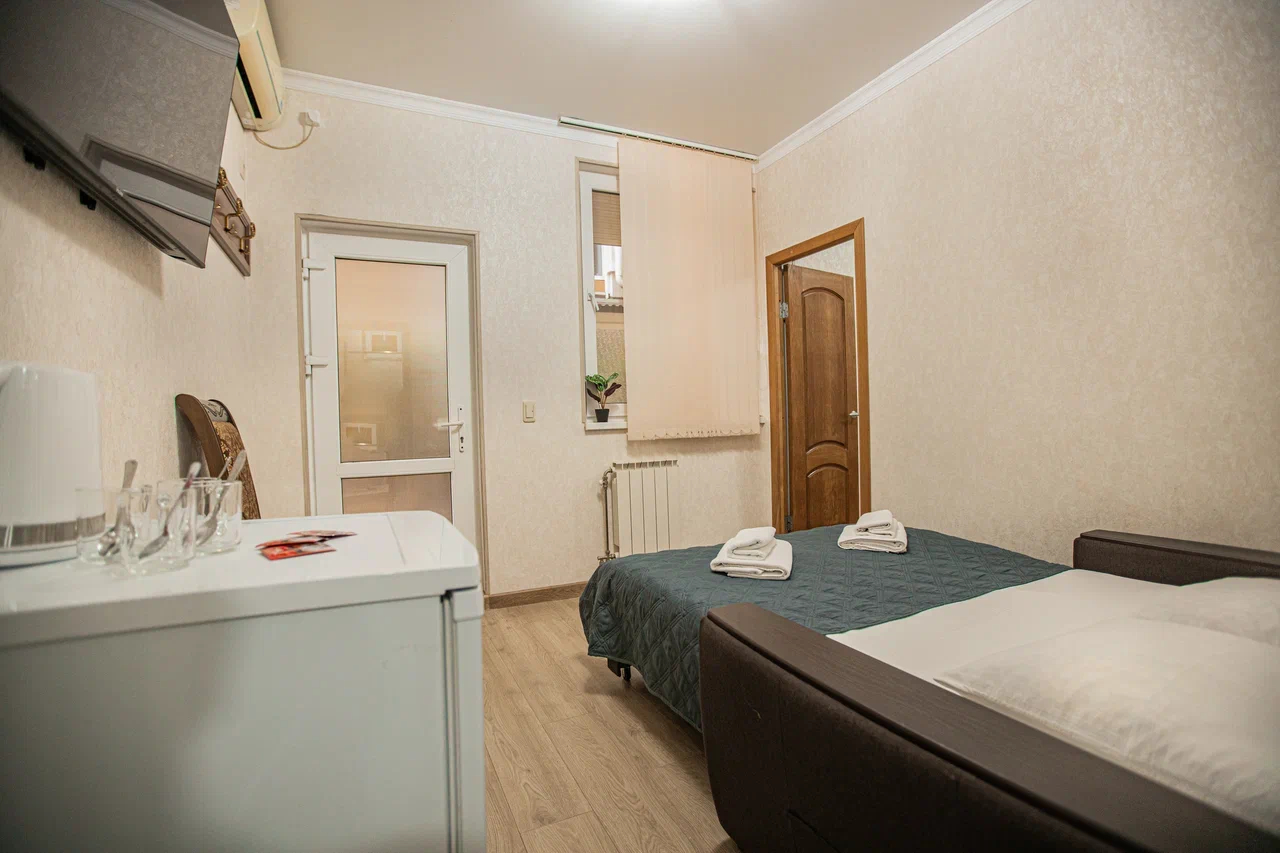 В номере: вешалка, диван раскладной, зеркало, кровать двуспальная, прикроватная тумбочка, стол, стулья, шкаф, кондиционер, мини-холодильник, телевизор, электрочайник