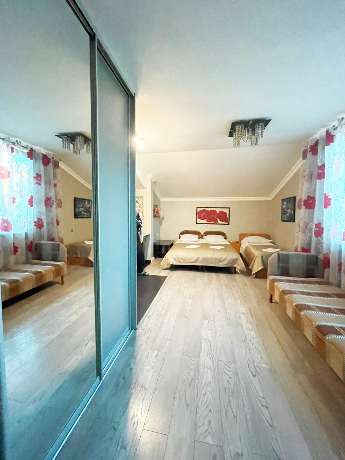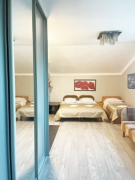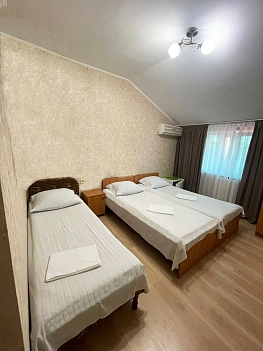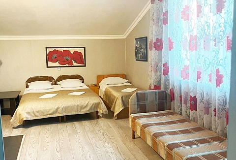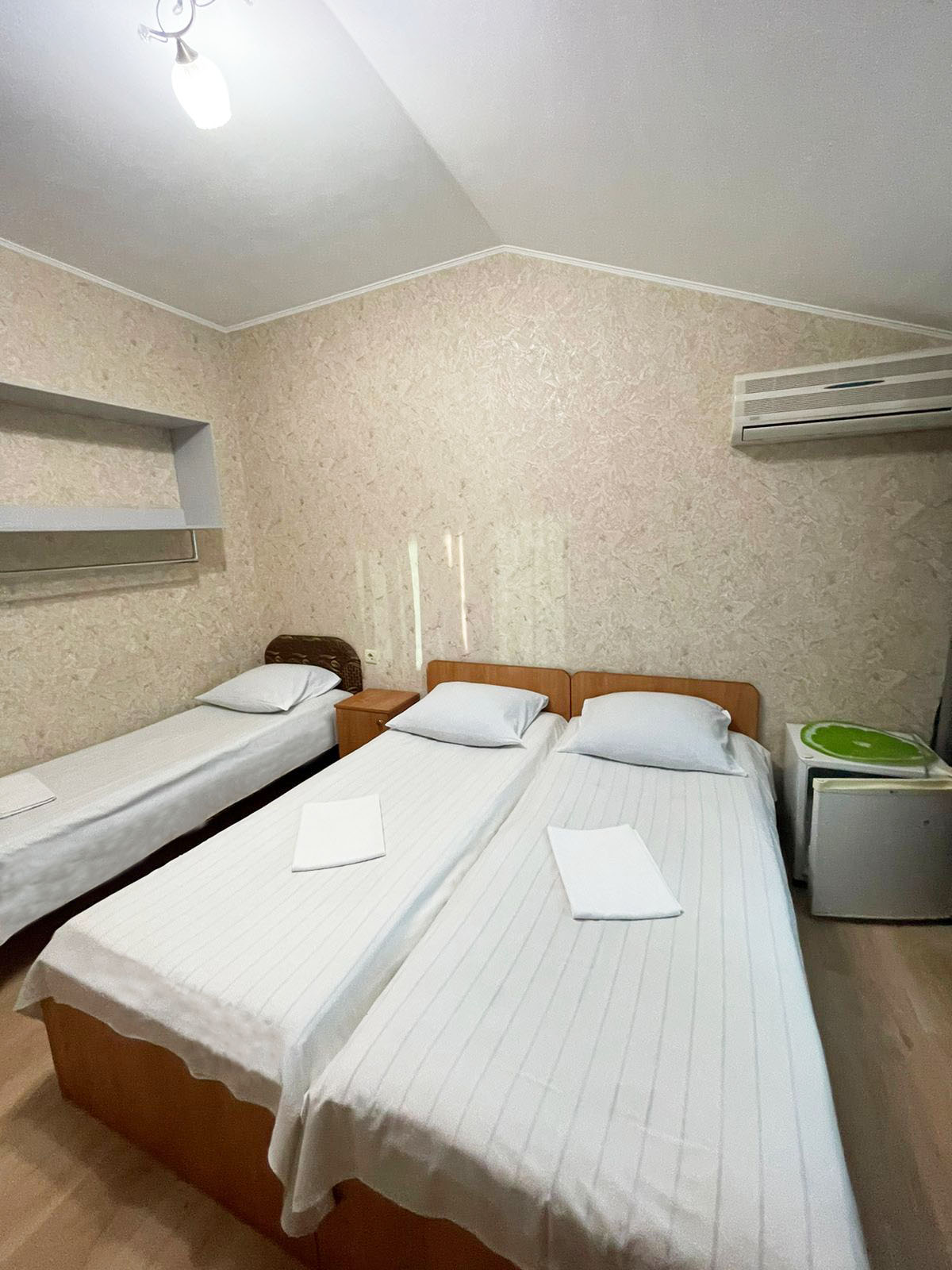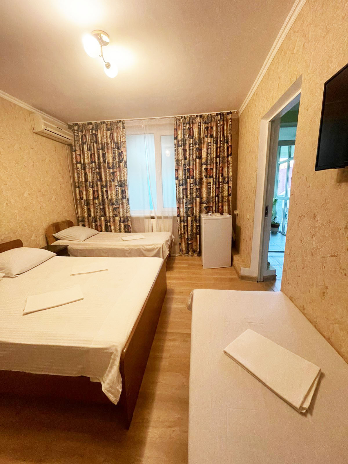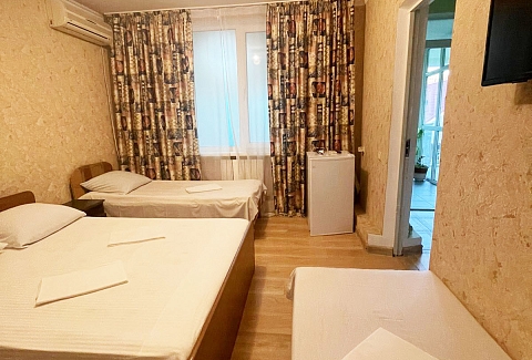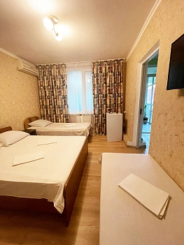 В номере: кровати односпальные, кровать двуспальная, стол, стулья, шкаф, кондиционер, мини-холодильник, телевизор