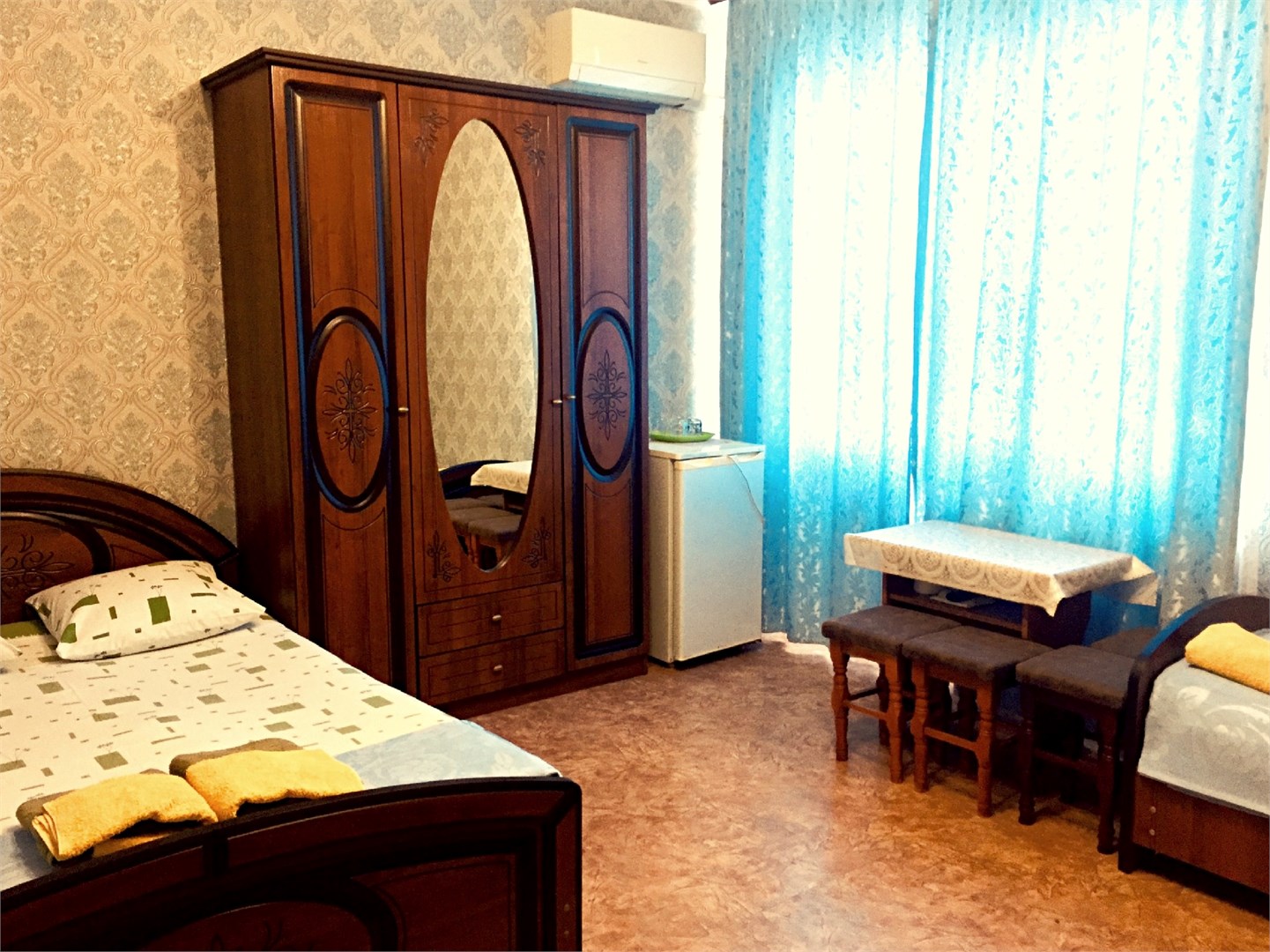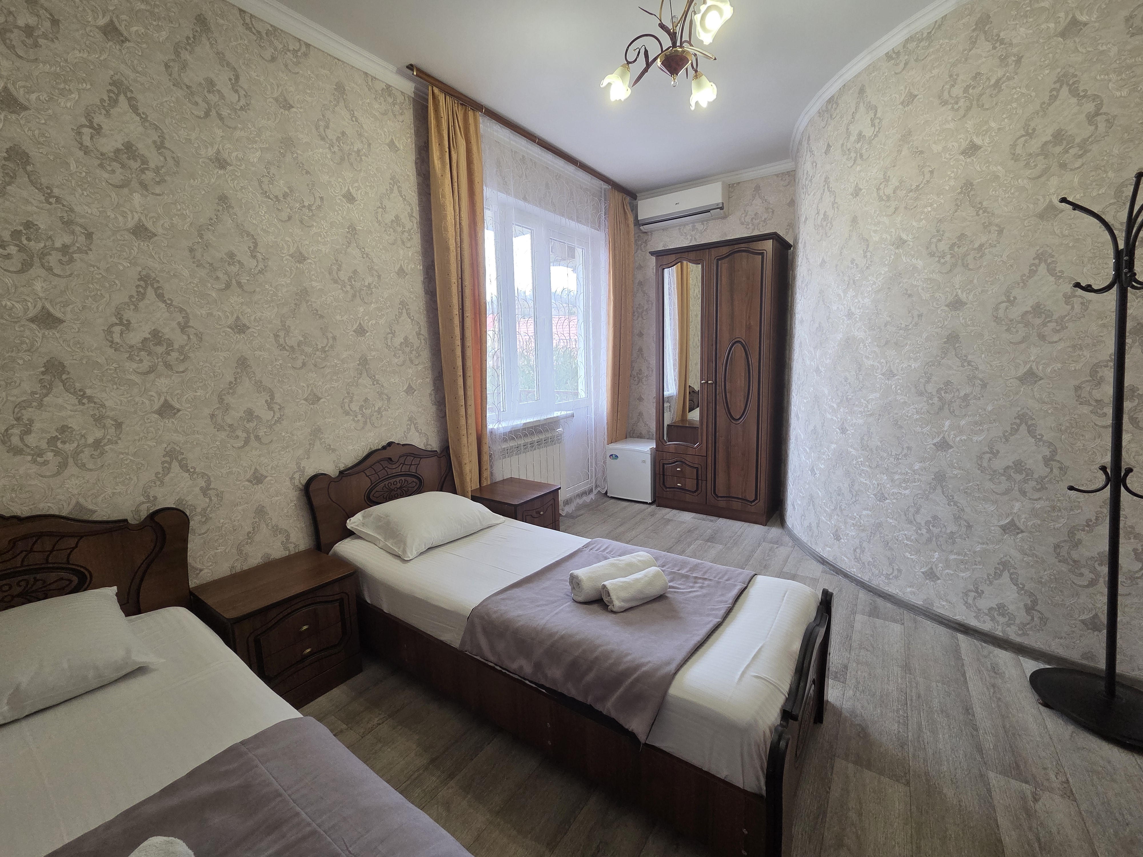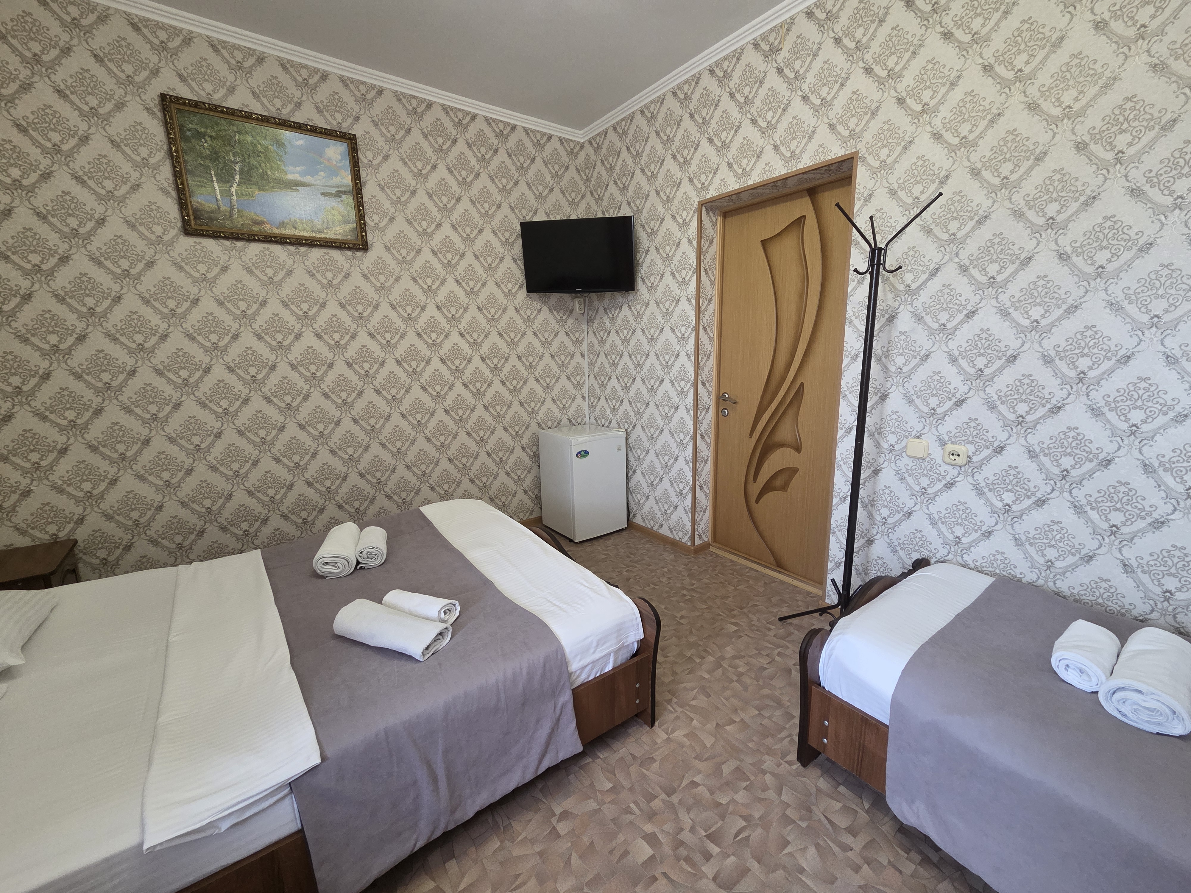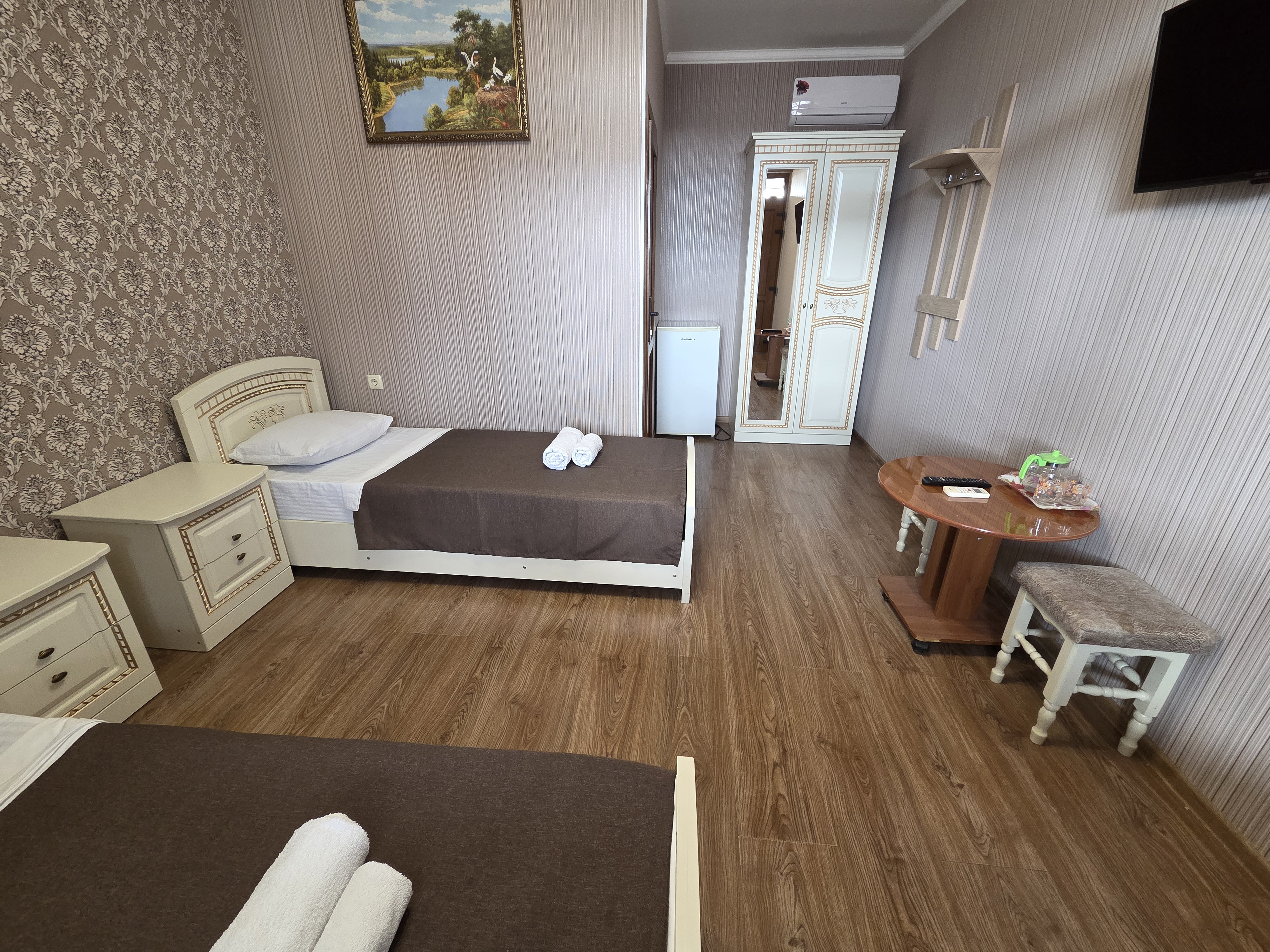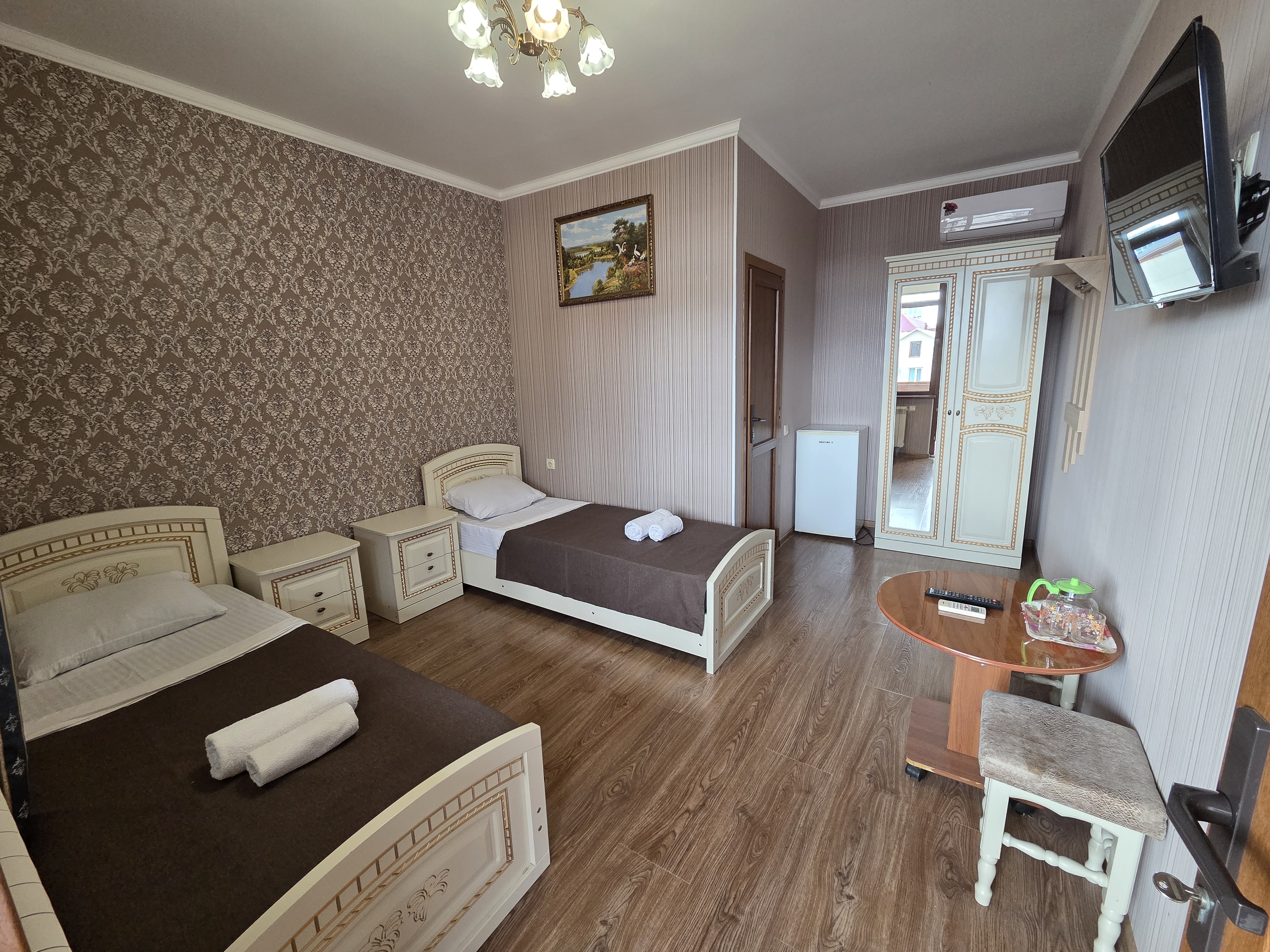 В номере: зеркало, кровать двуспальная, кровать односпальная, прикроватные тумбочки, стулья, шкаф, кондиционер, телевизор ЖК, холодильник