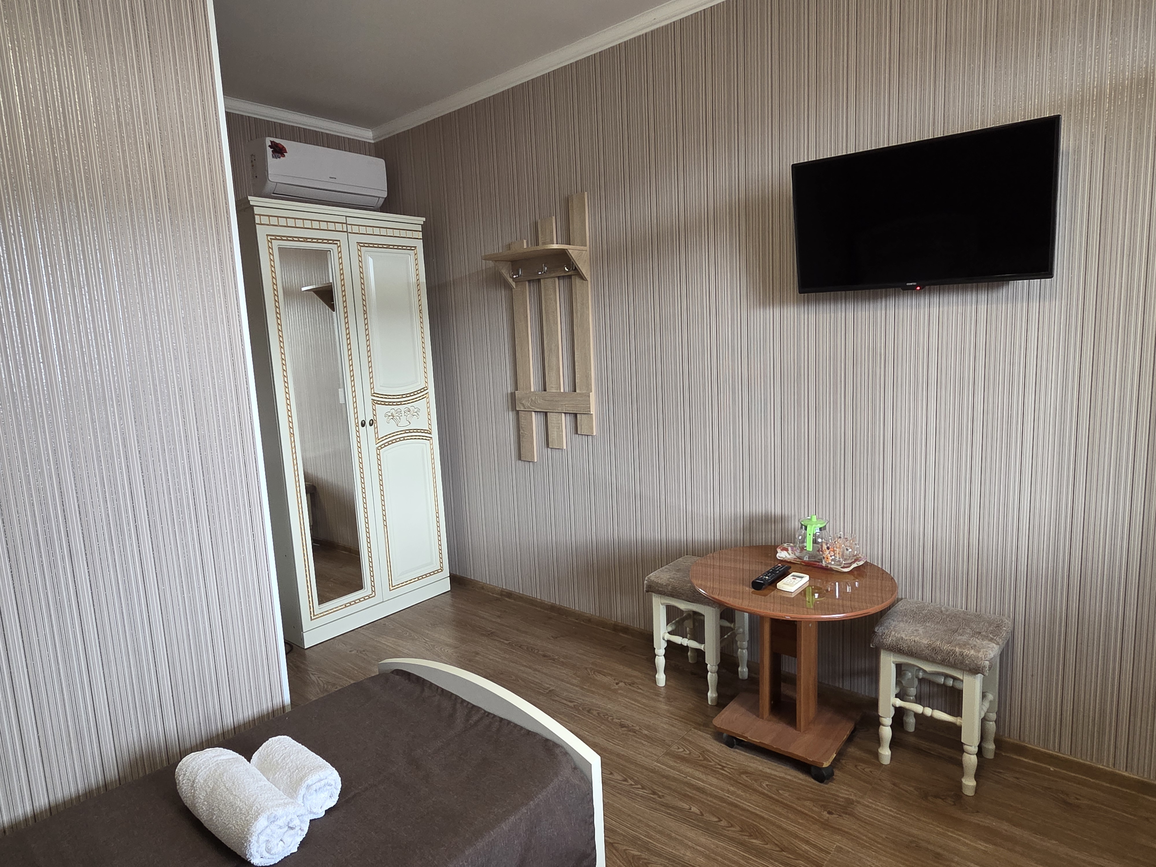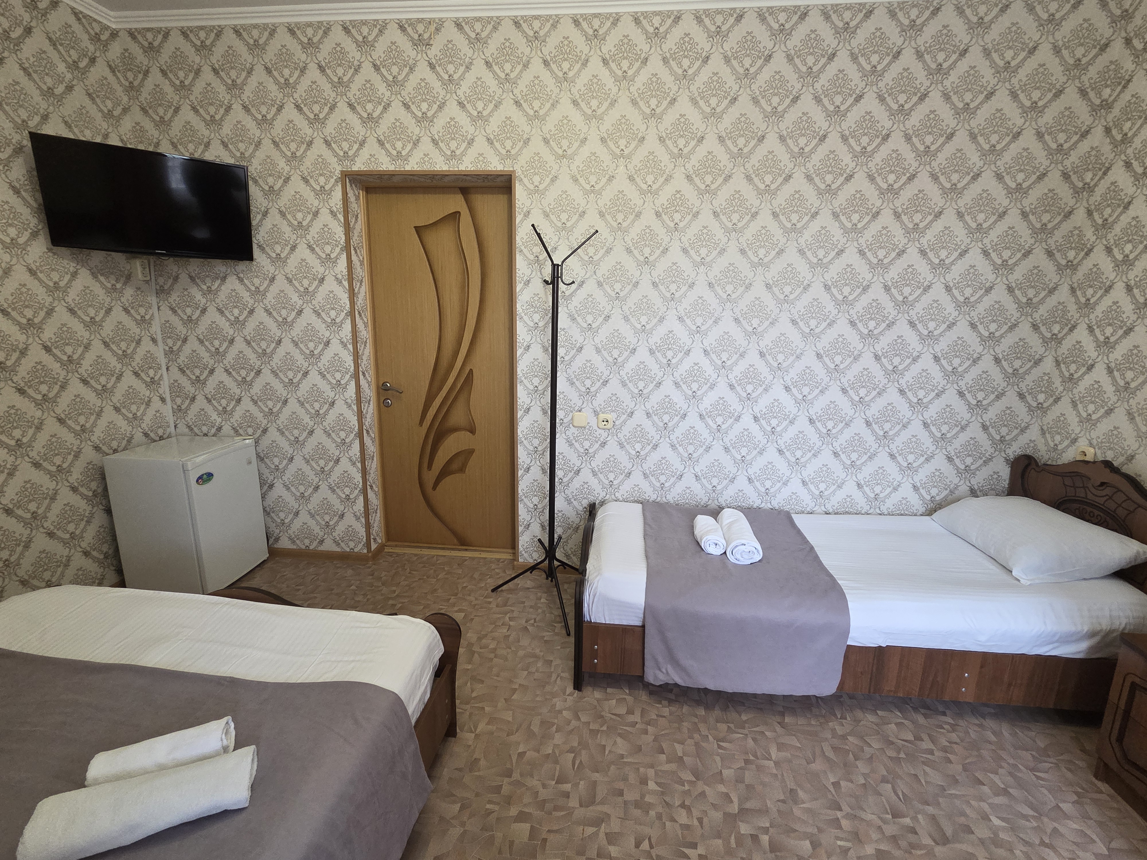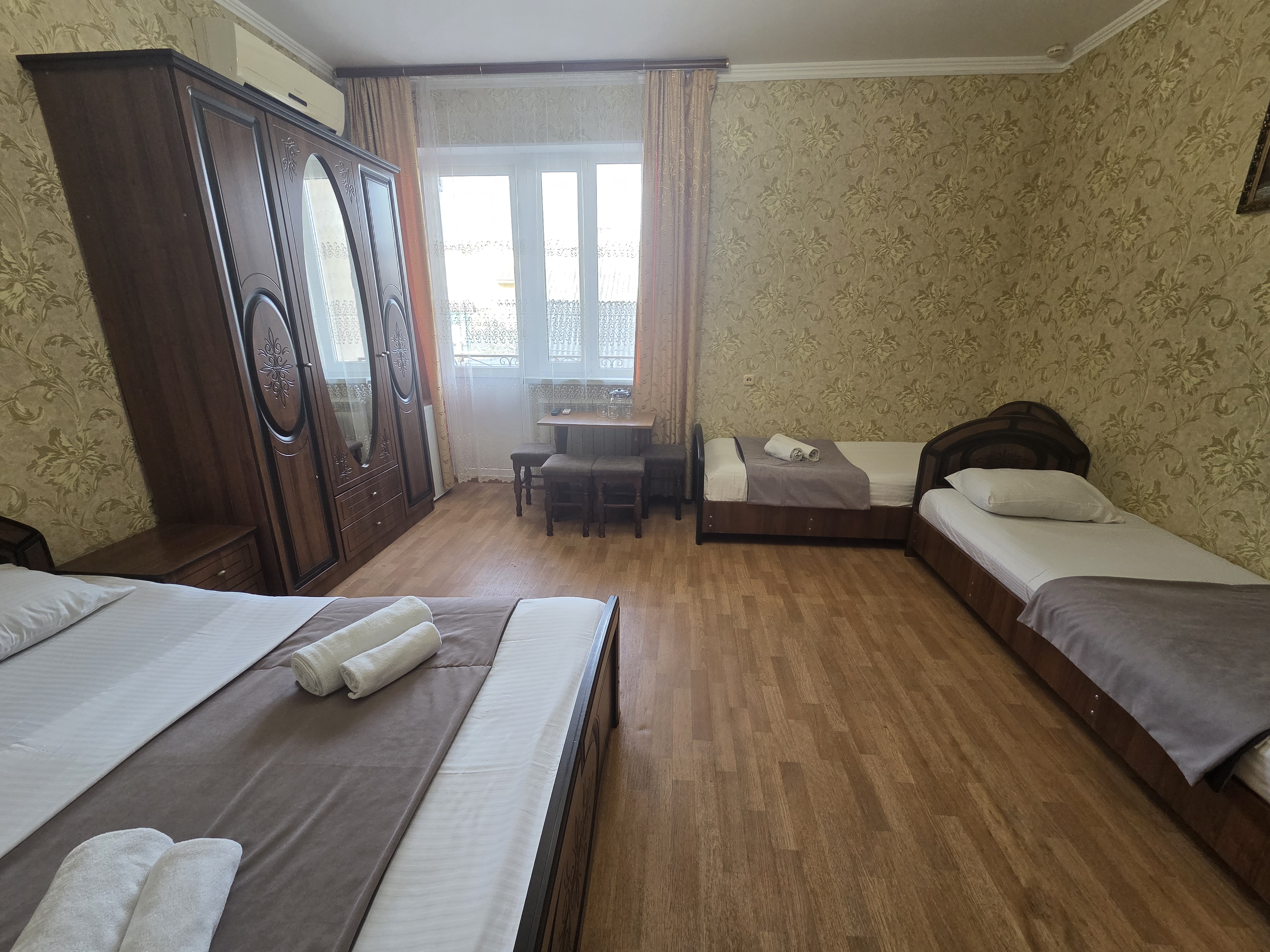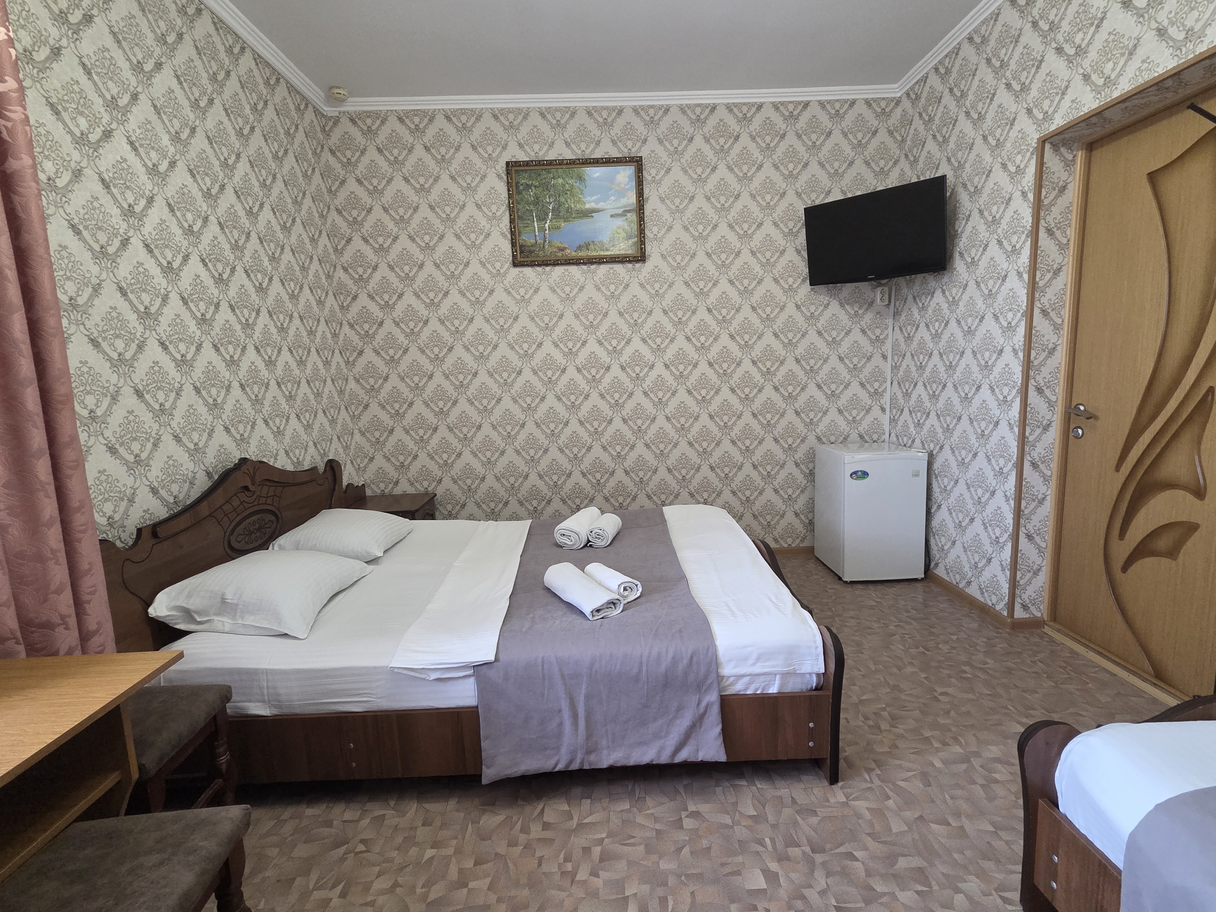 В номере: зеркало, кровать двуспальная, кровать односпальная, прикроватные тумбочки, стулья, шкаф, кондиционер, телевизор ЖК, холодильник