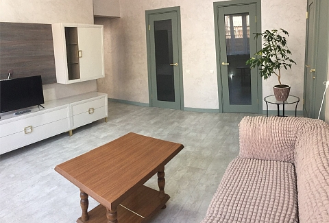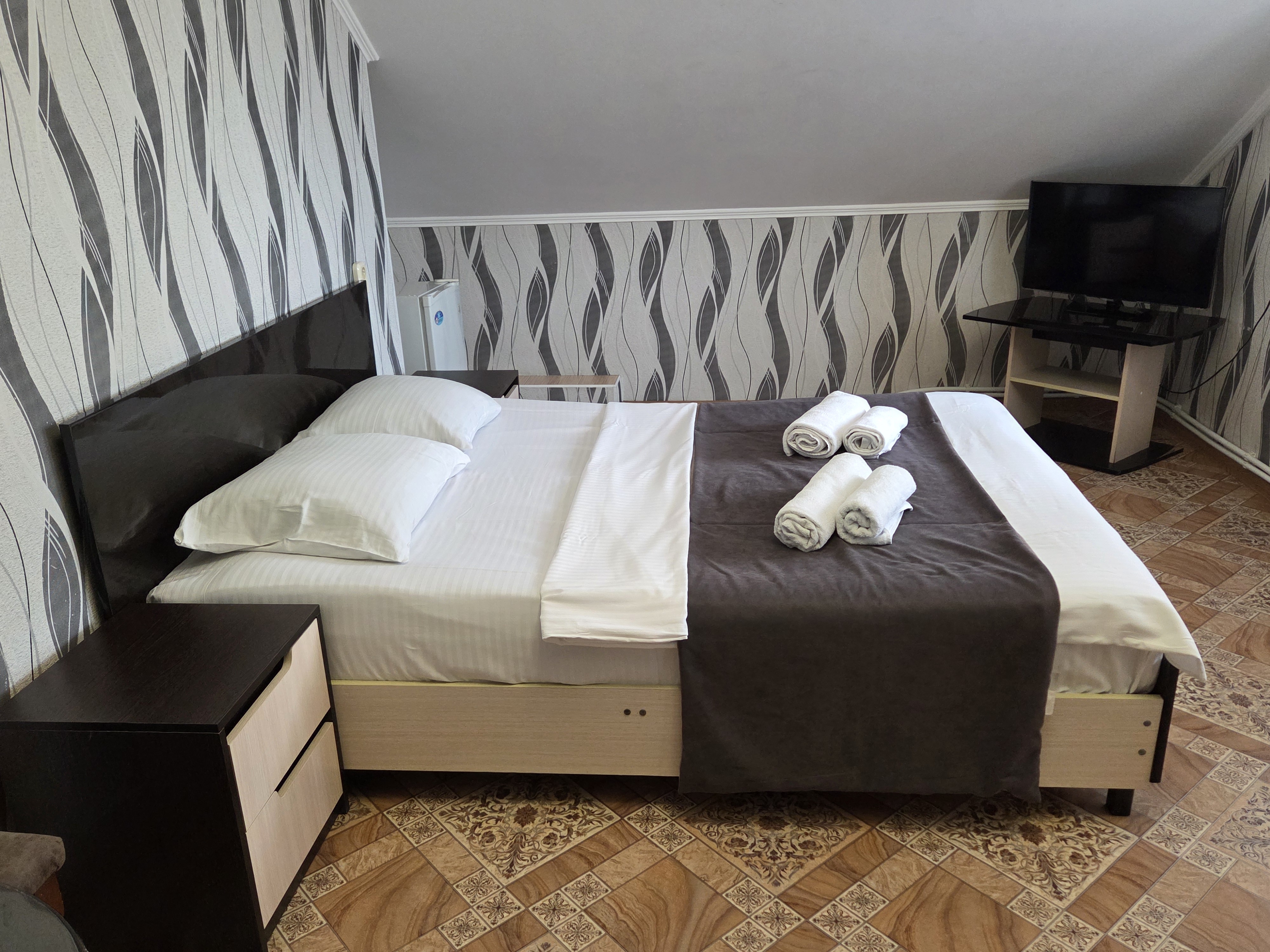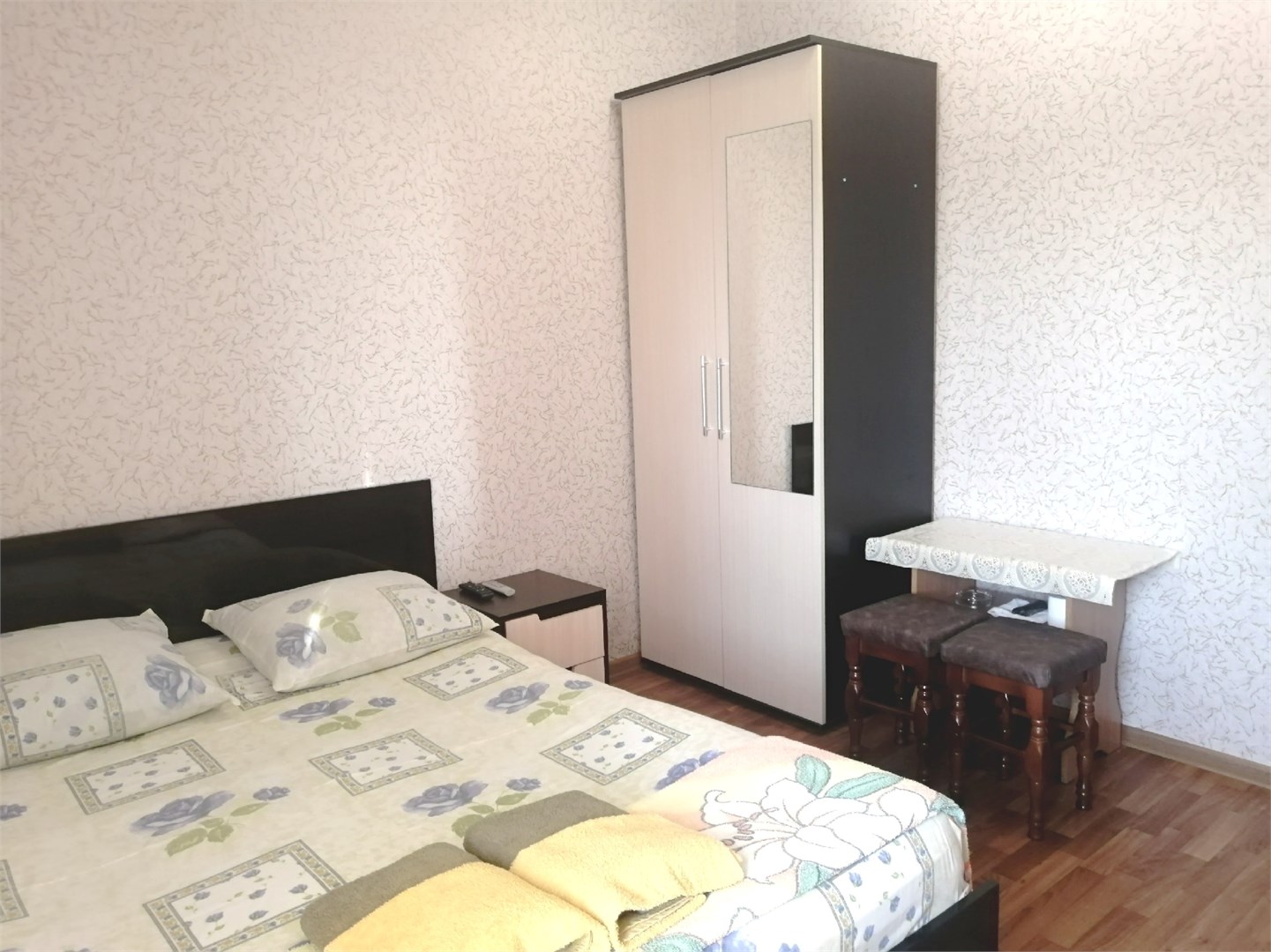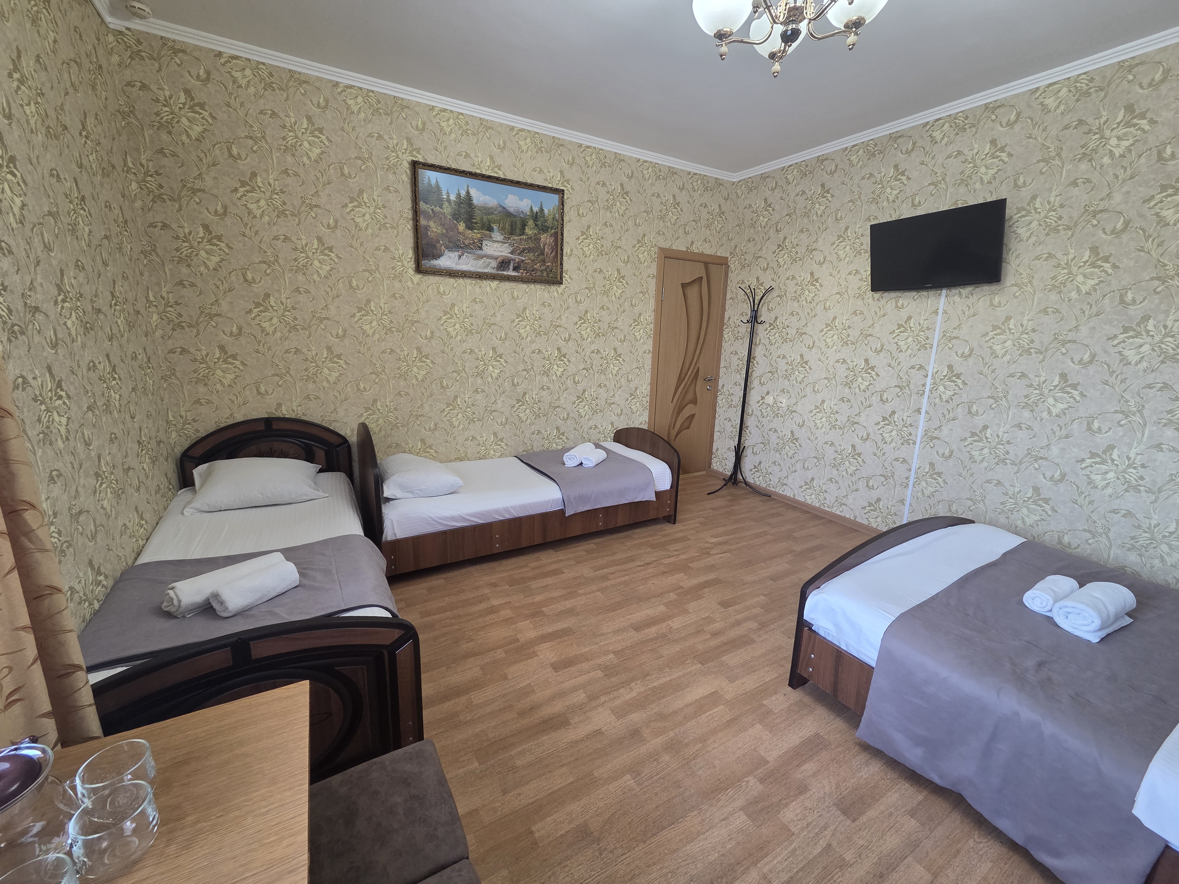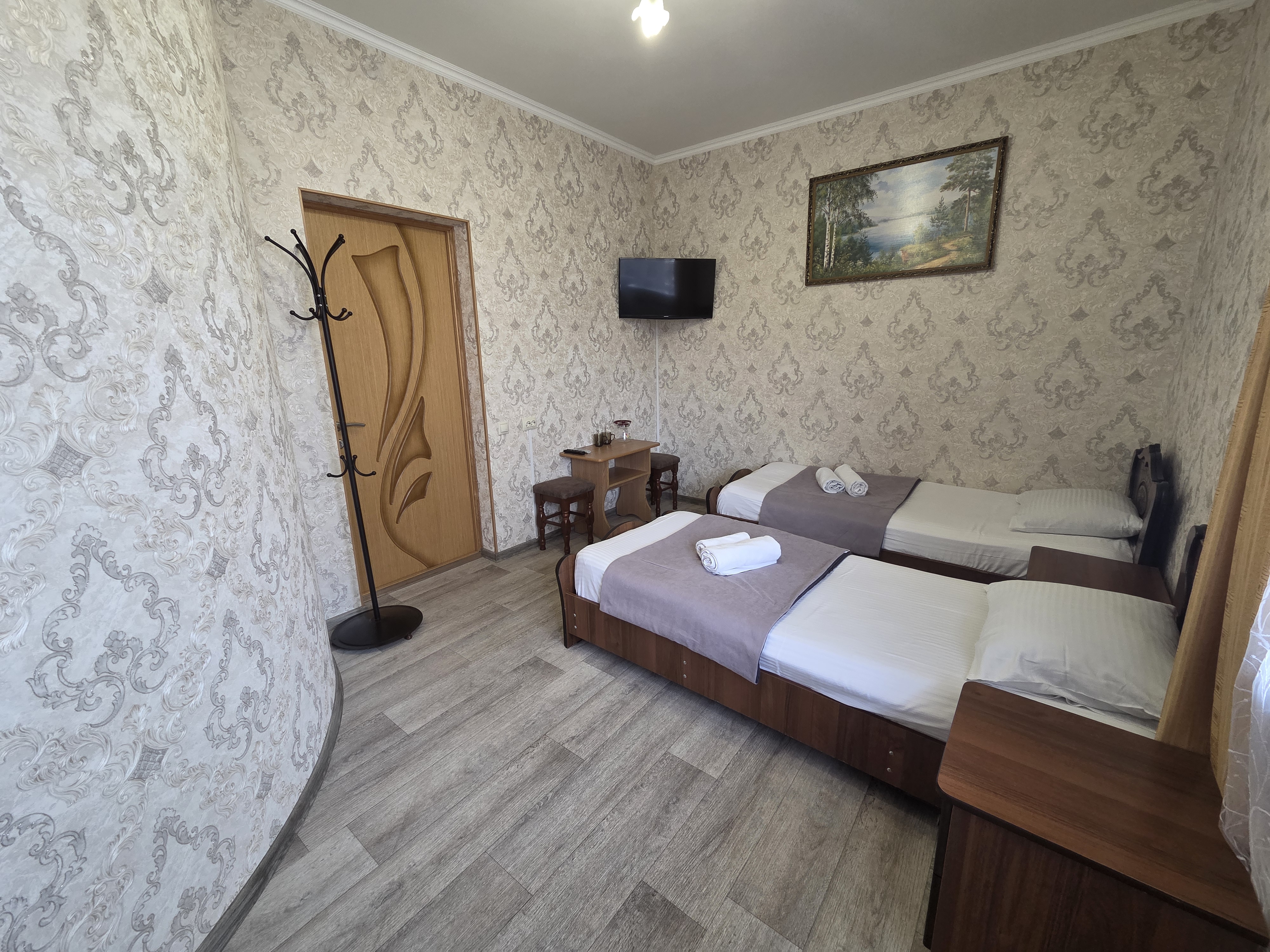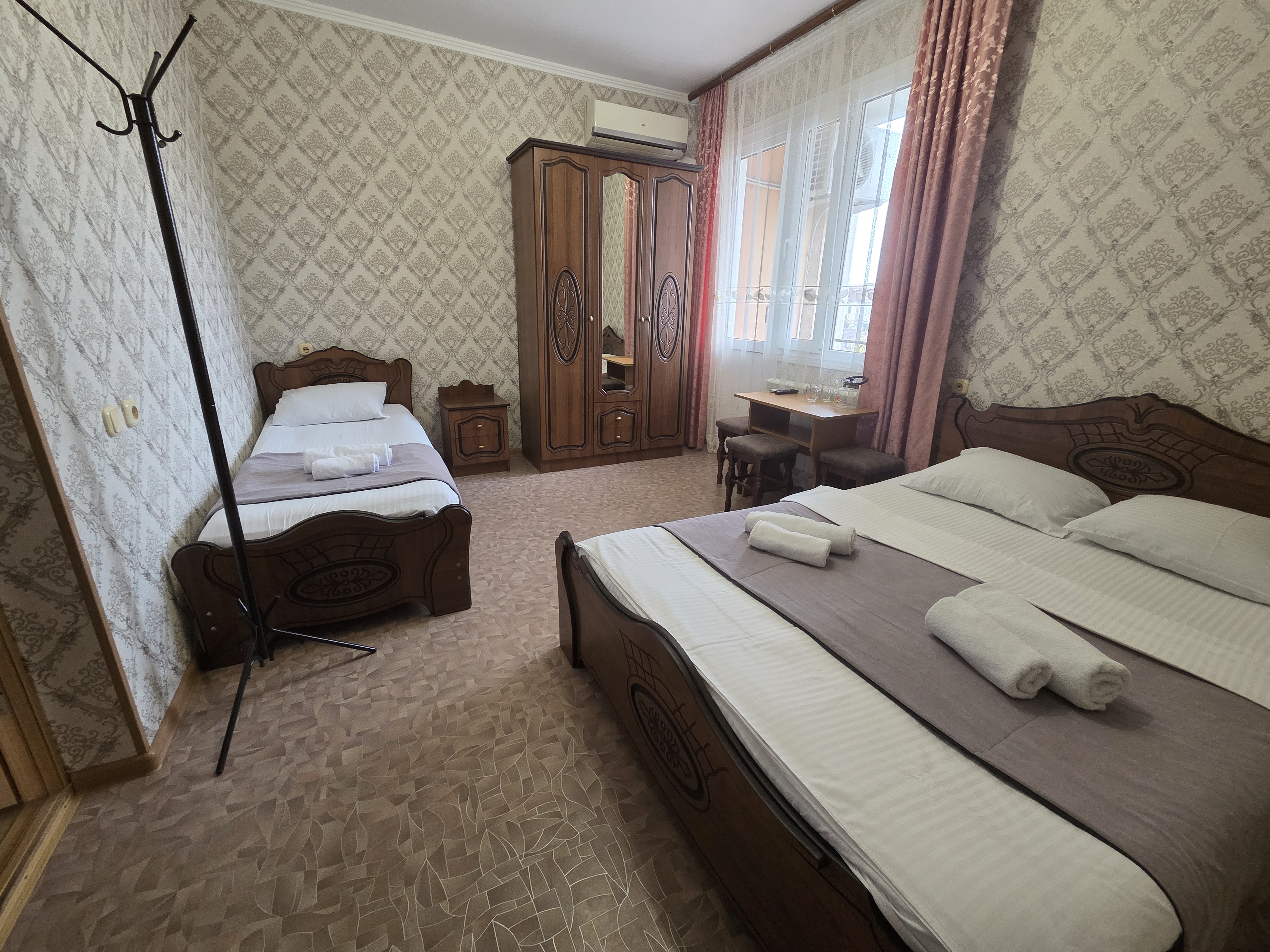 В номере: зеркало, кровать двуспальная, кровать односпальная, прикроватные тумбочки, стулья, шкаф, кондиционер, телевизор ЖК, холодильник