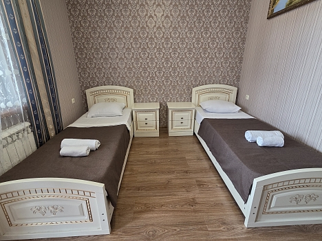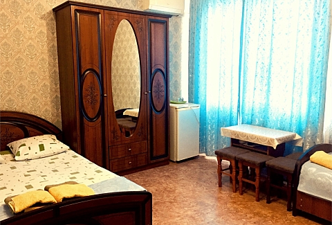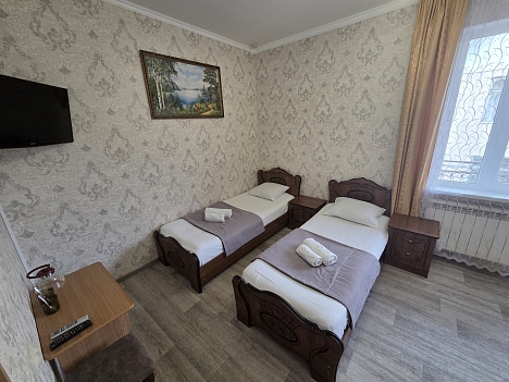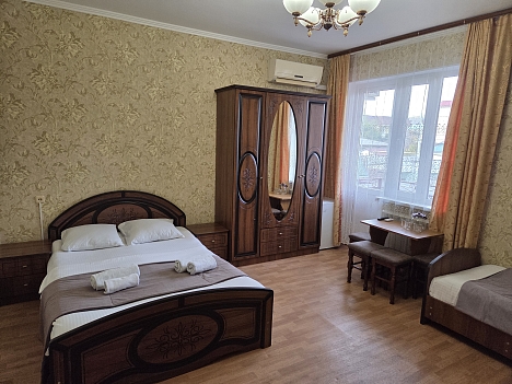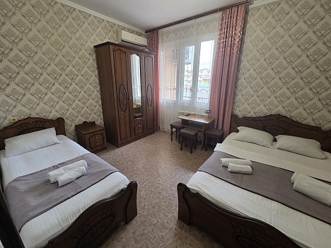 В номере: кровати односпальные, кровать двуспальная, прикроватные тумбочки, стулья, шкаф, кондиционер, телевизор ЖК, холодильник