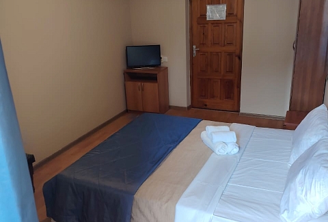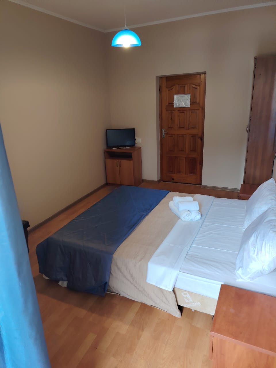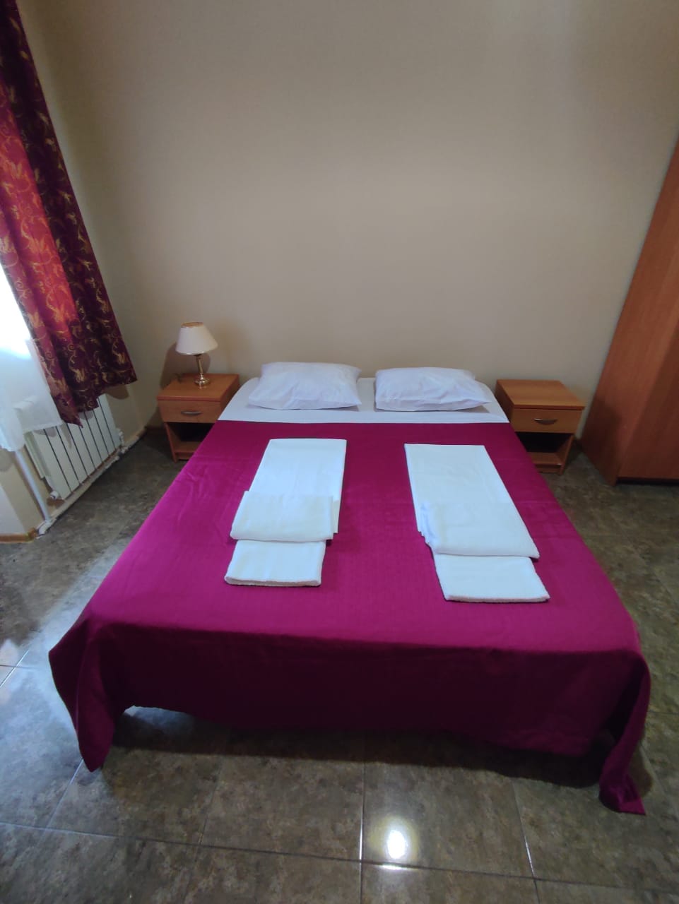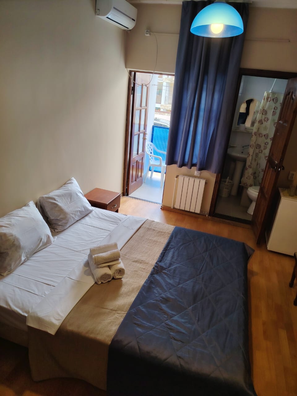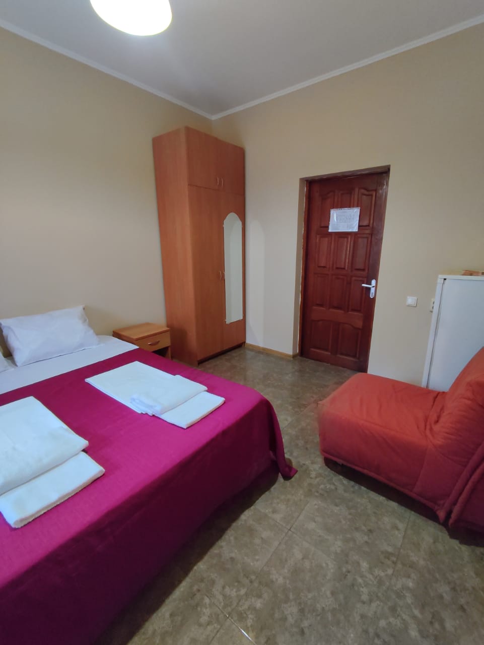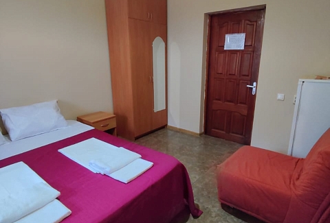 В номере: вешалка, зеркало, кресло-кровать, кровать двуспальная, прикроватные тумбочки, стол, стулья, шкаф, вентилятор, телевизор, холодильник