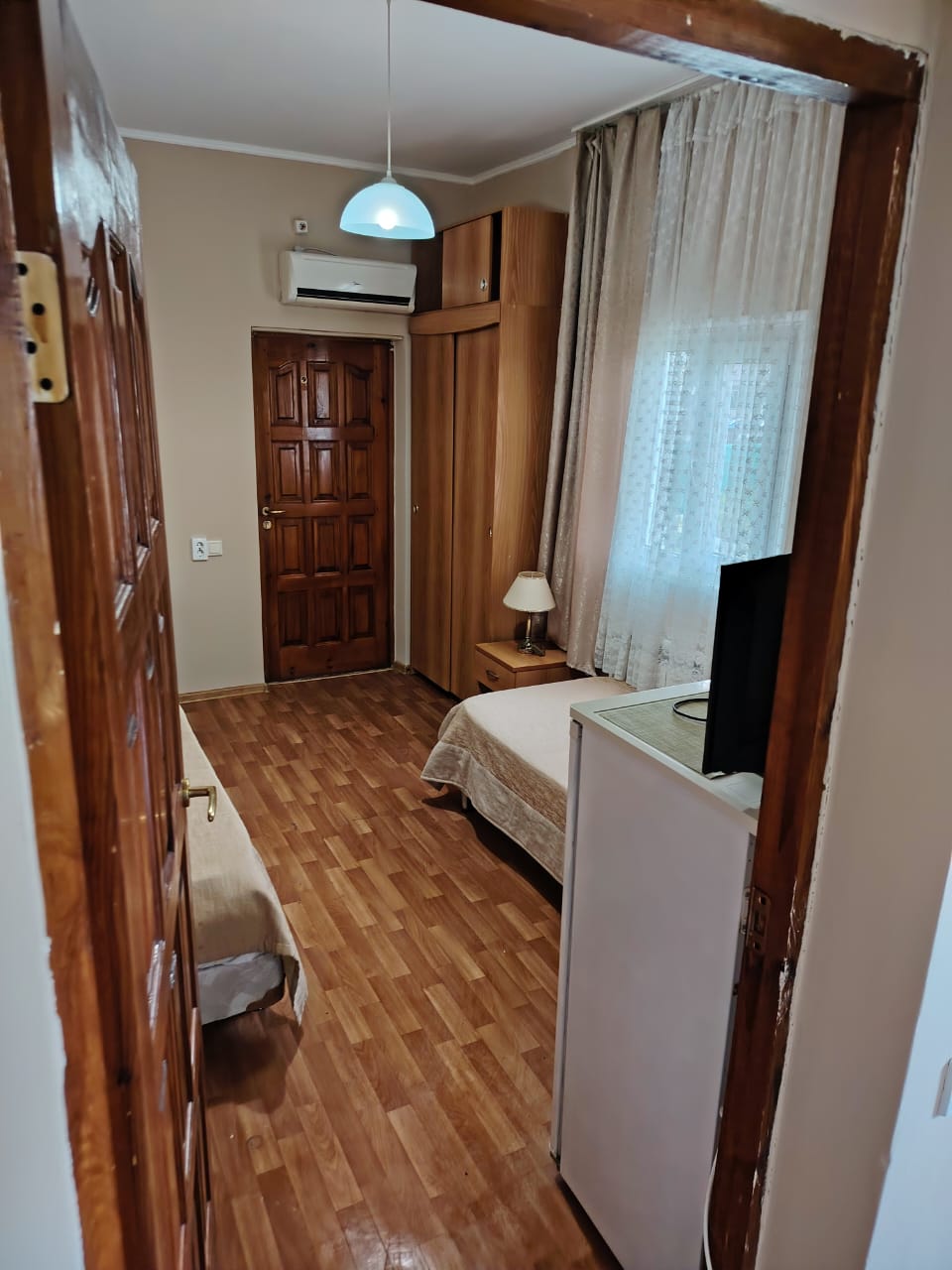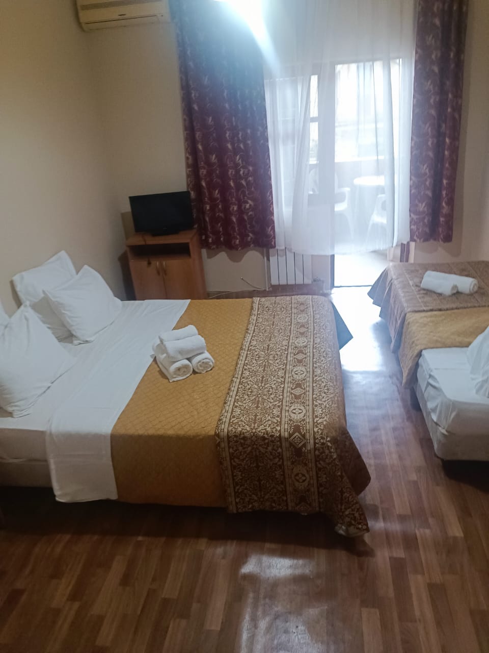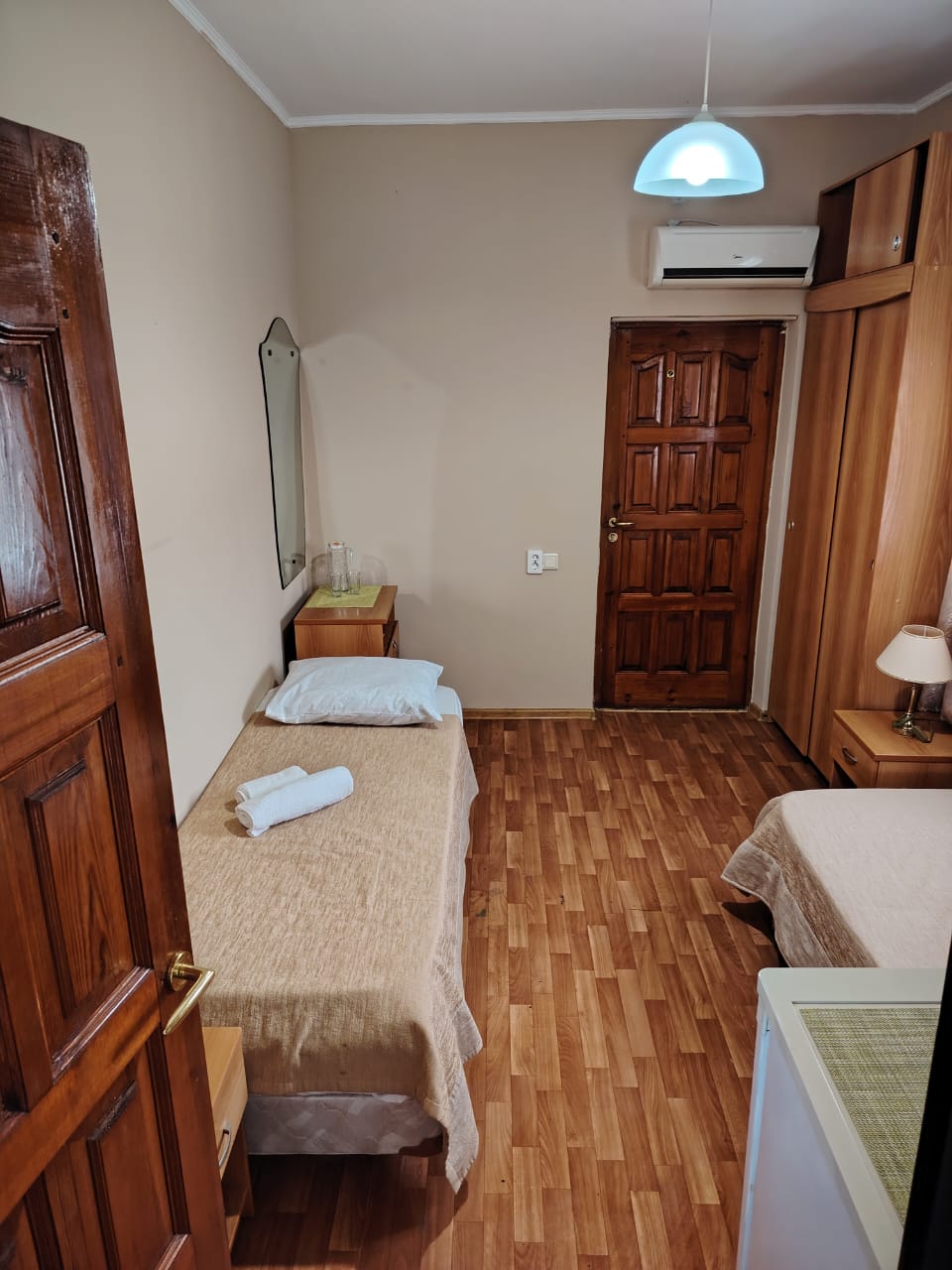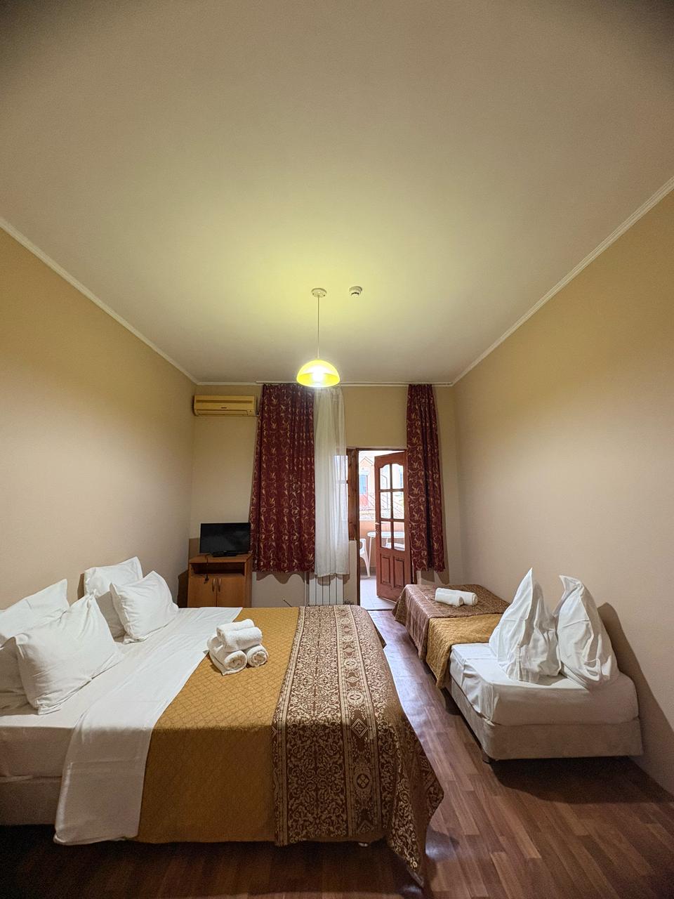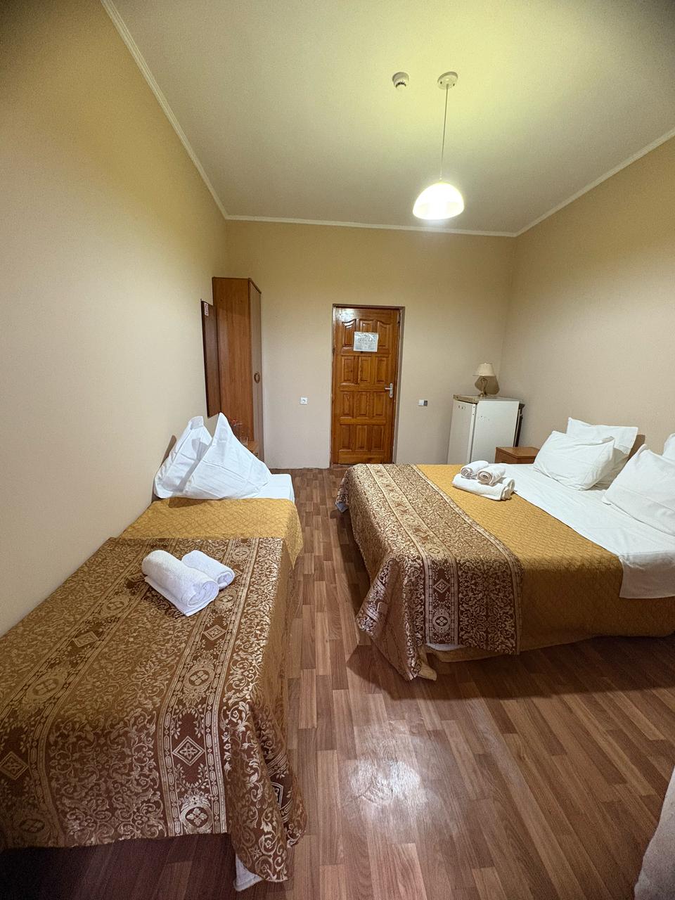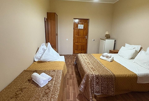 В номере: вешалка, зеркало, кровать двуспальная, кровать односпальная, прикроватные тумбочки, стол, стулья, шкаф, кондиционер, телевизор, холодильник