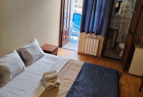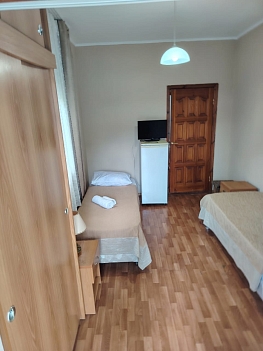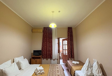 В номере: вешалка, зеркало, кровати односпальные, кровать двуспальная, прикроватные тумбочки, стол, стулья, шкаф, кондиционер, микроволновая печь, набор посуды, телевизор, холодильник, электрочайник