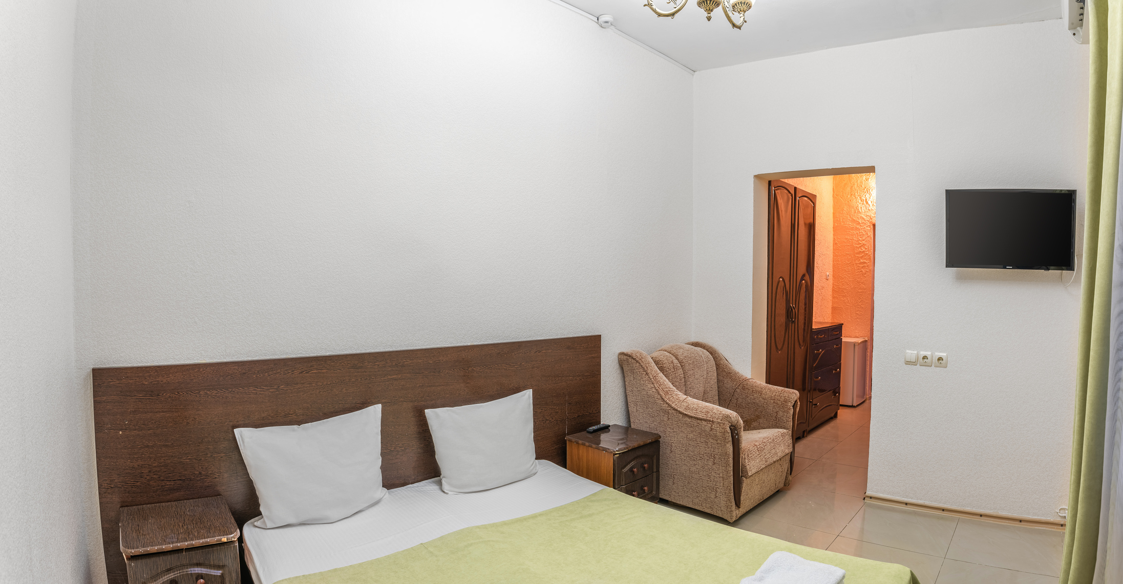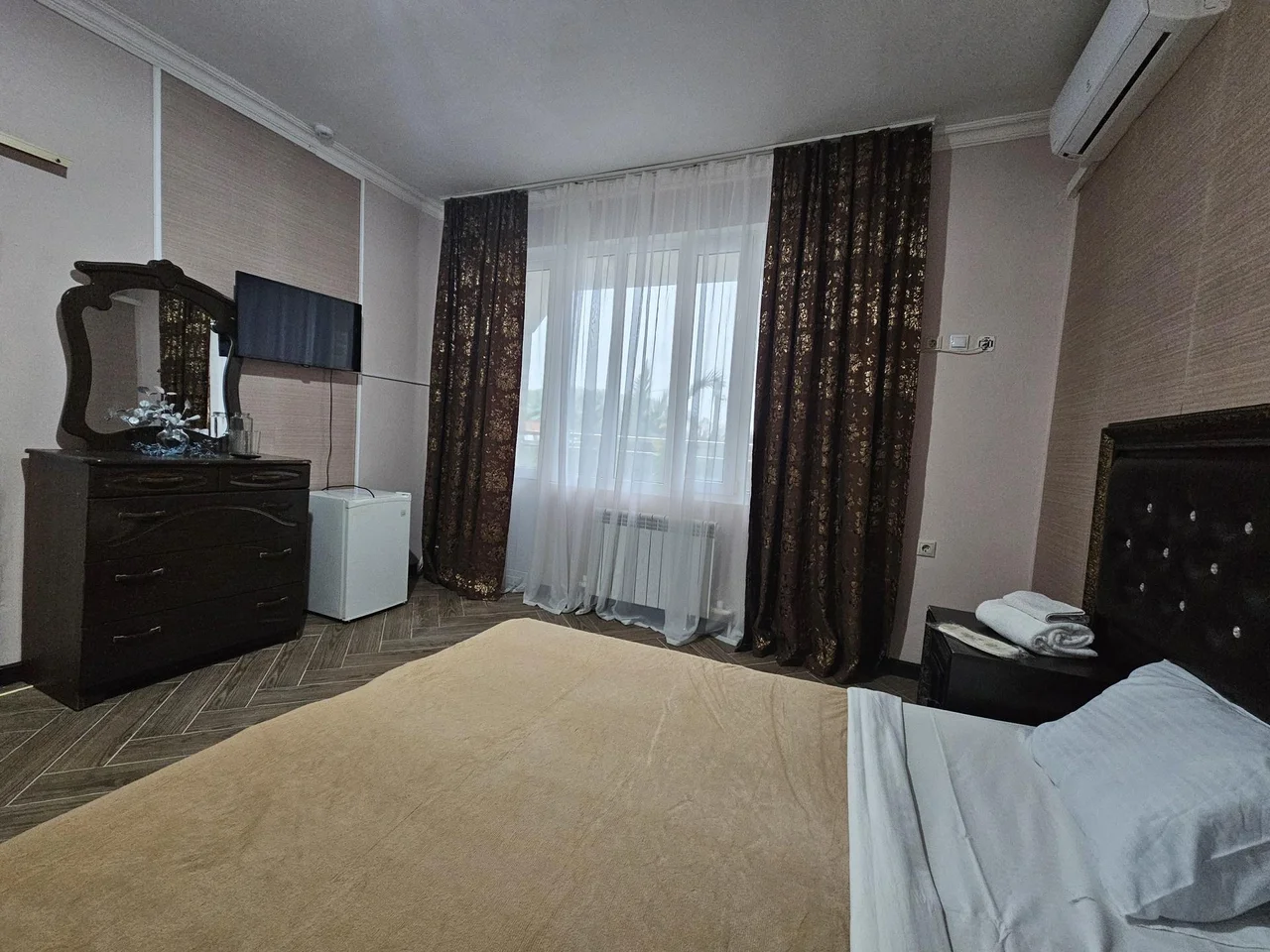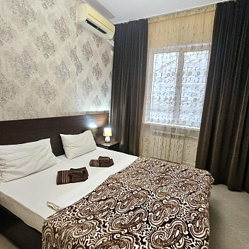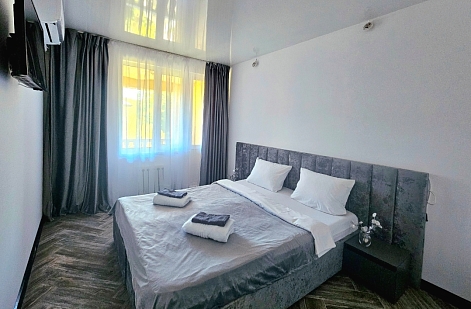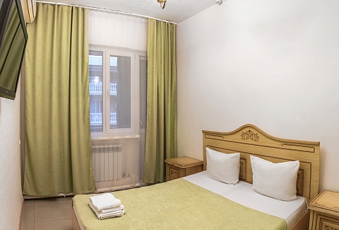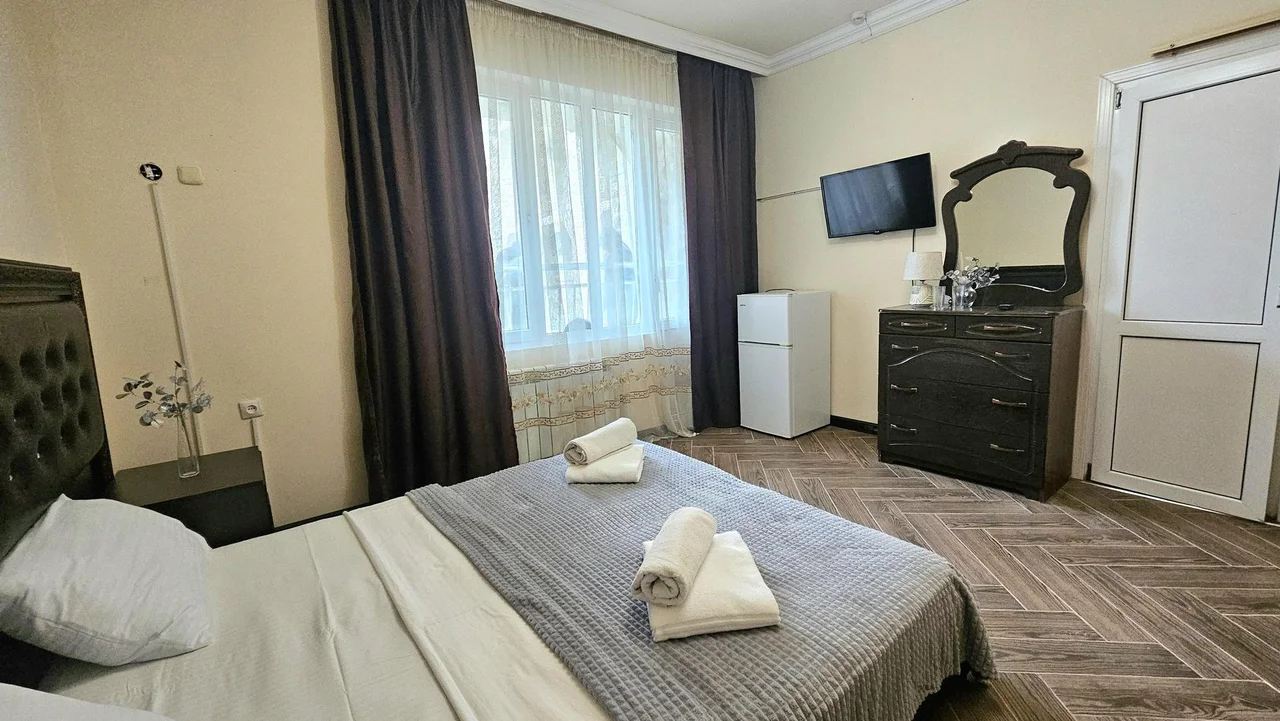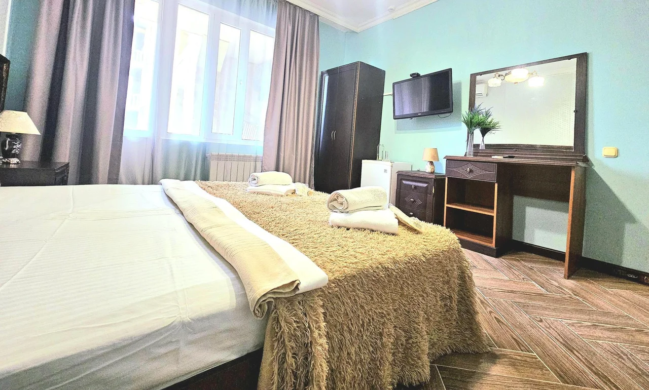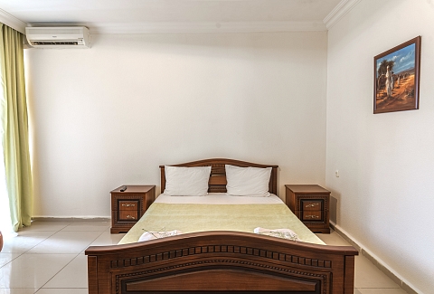 В номере: зеркало, кровать двуспальная, прикроватные тумбочки, шкаф, кондиционер, мини-холодильник, телевизор ЖК