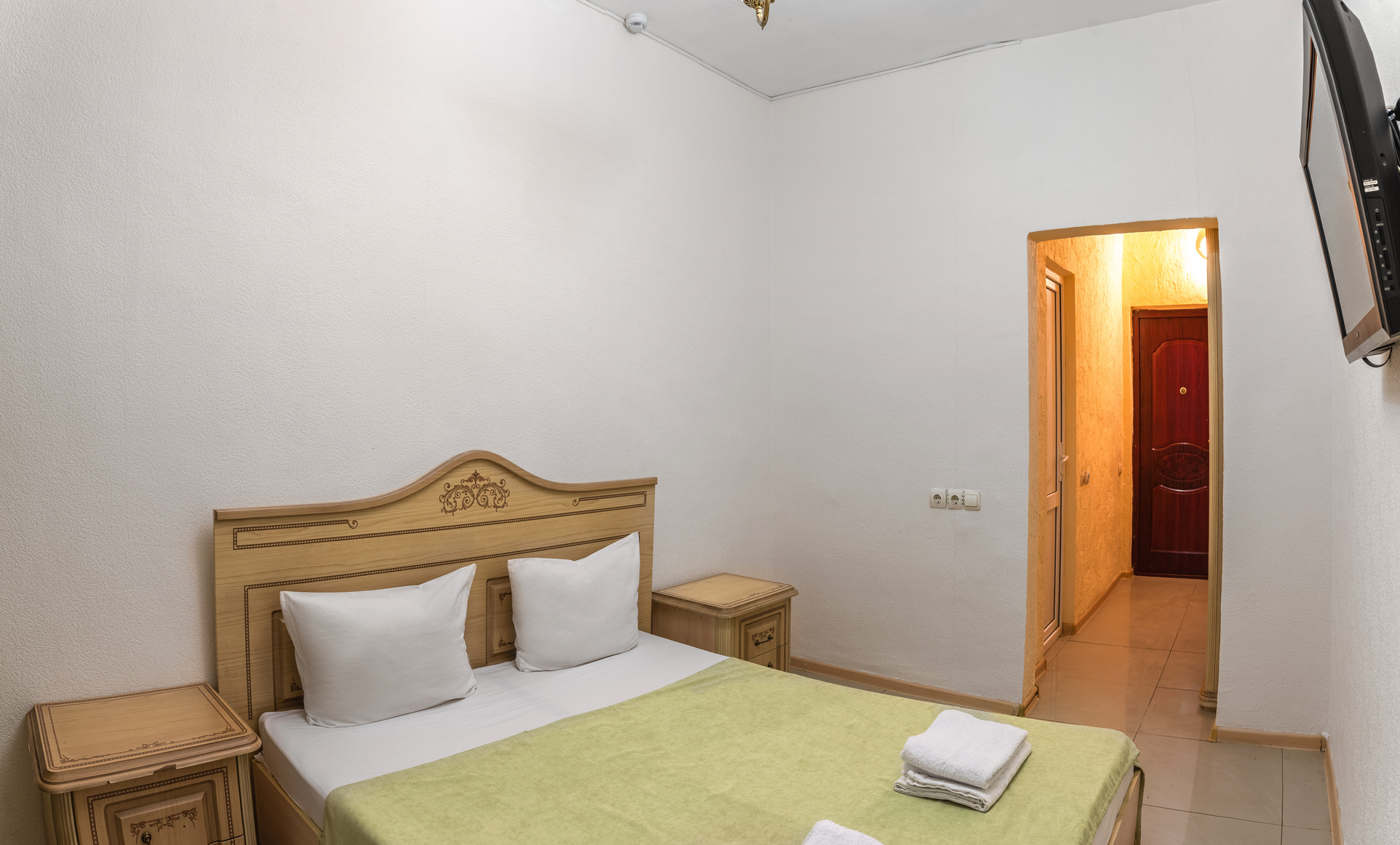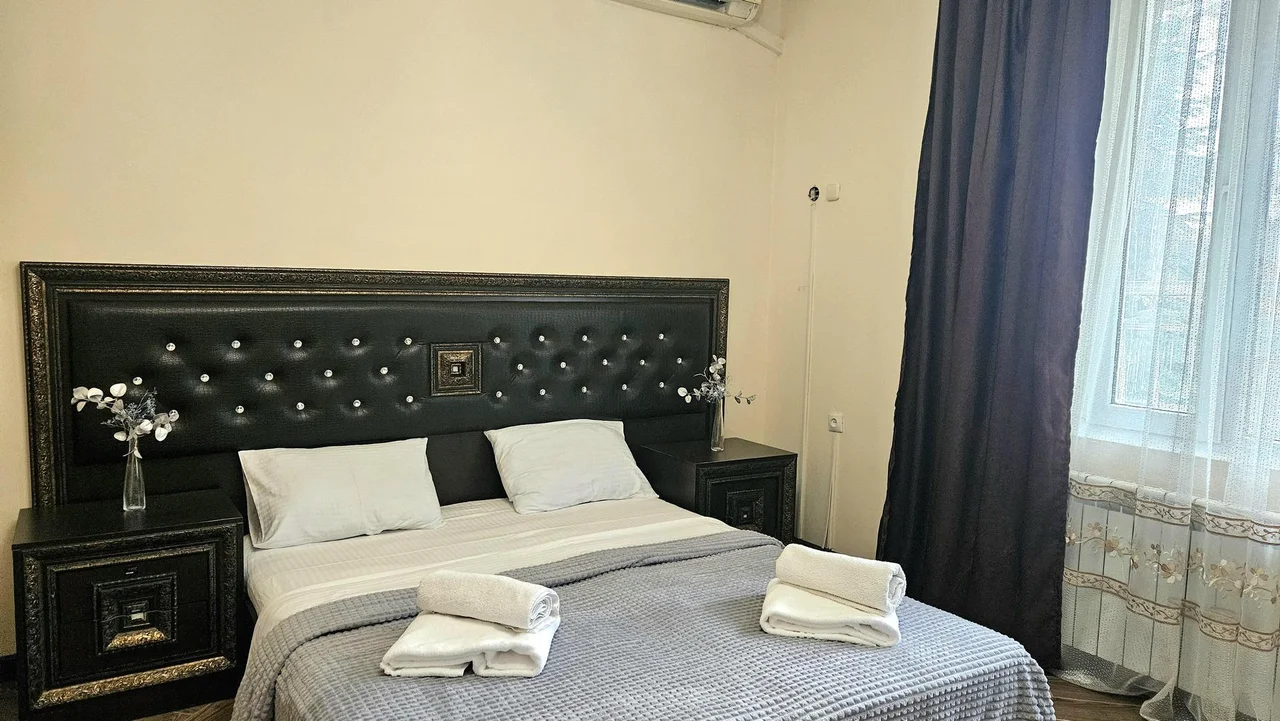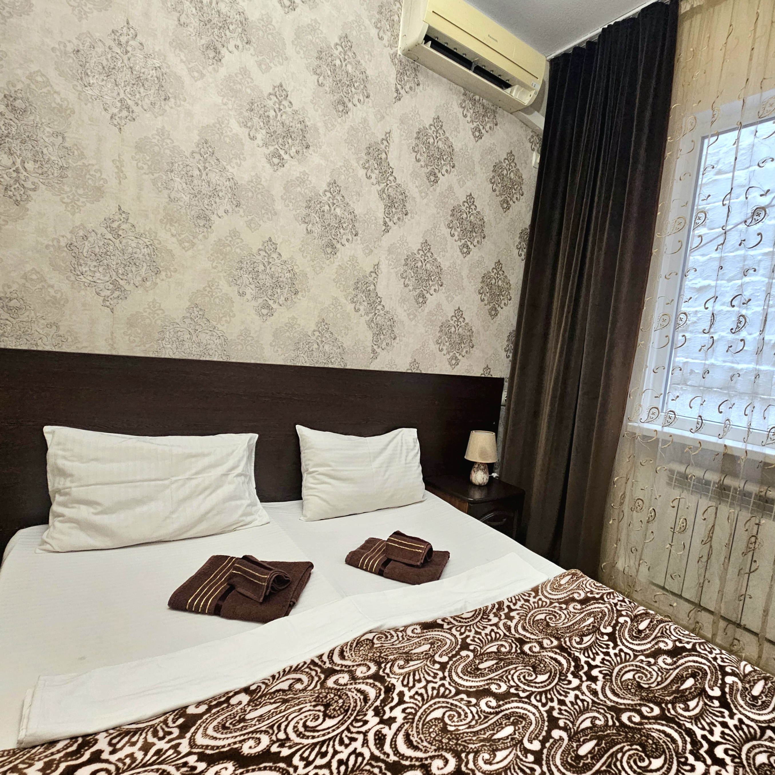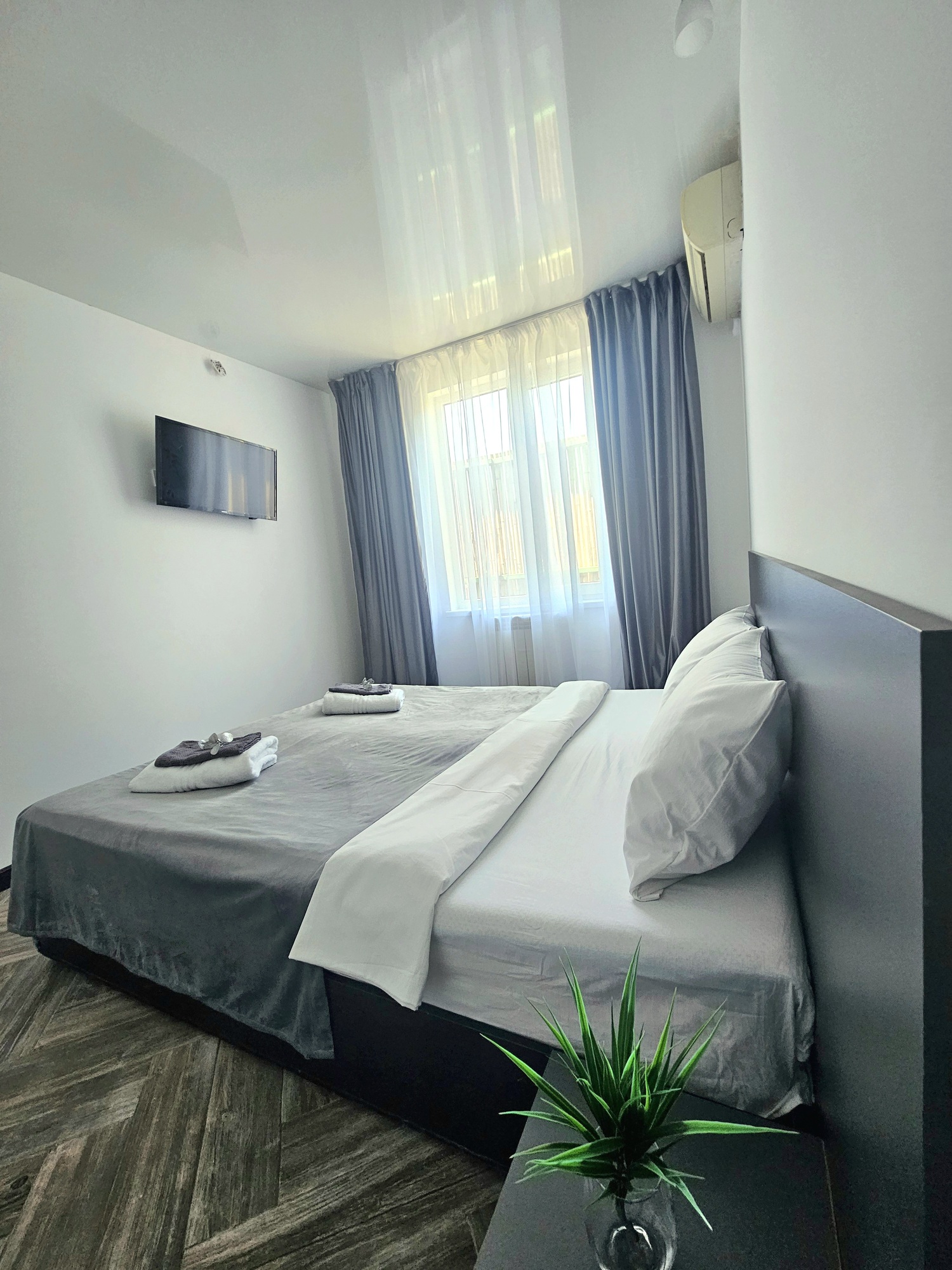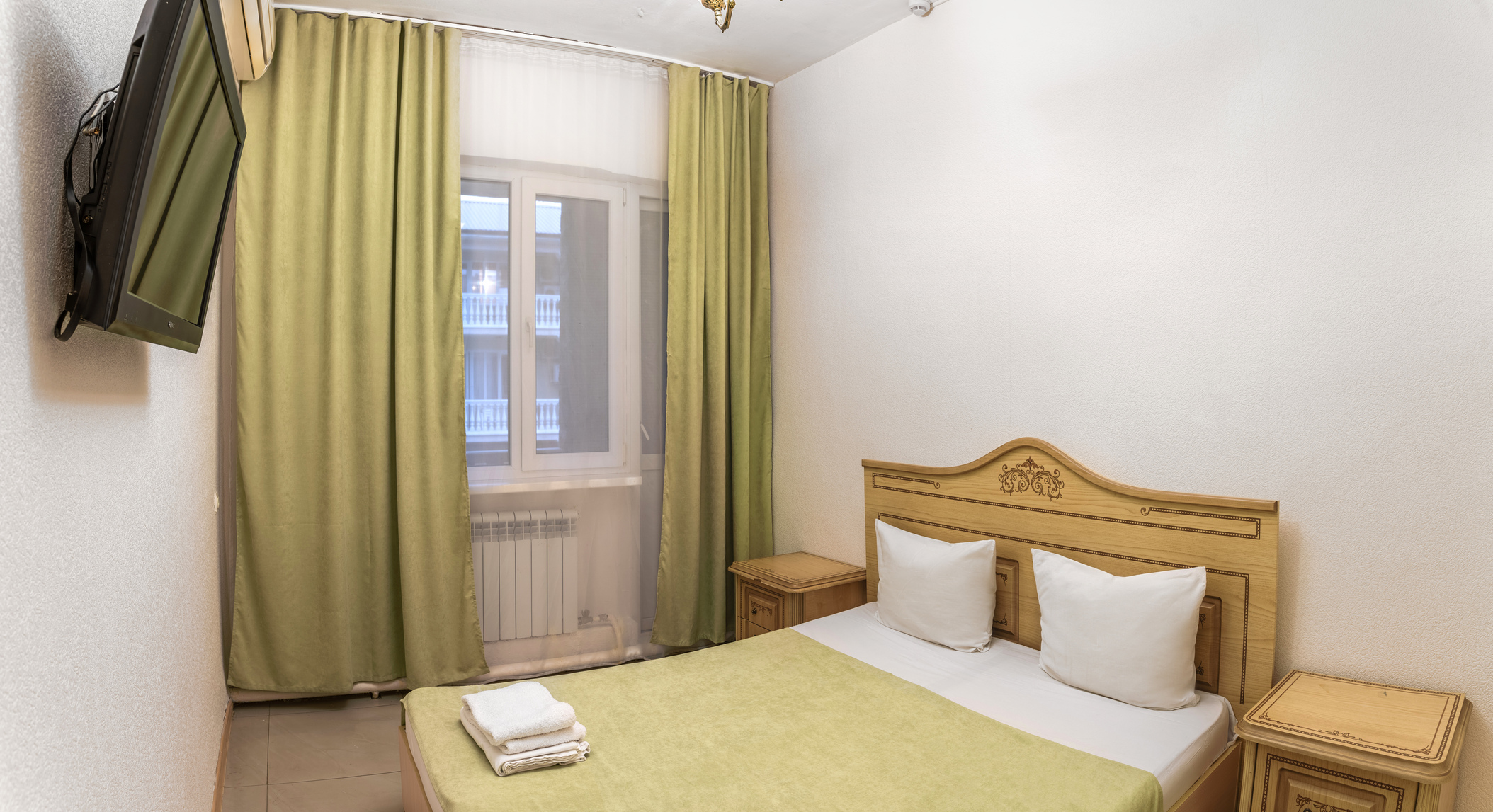 В номере: зеркало, кровать двуспальная, прикроватные тумбочки, шкаф, кондиционер, мини-холодильник, телевизор ЖК