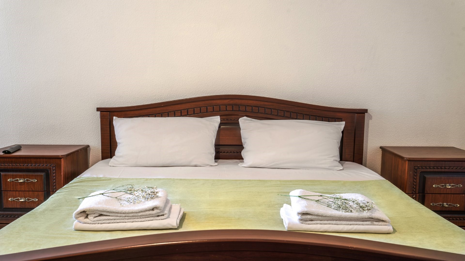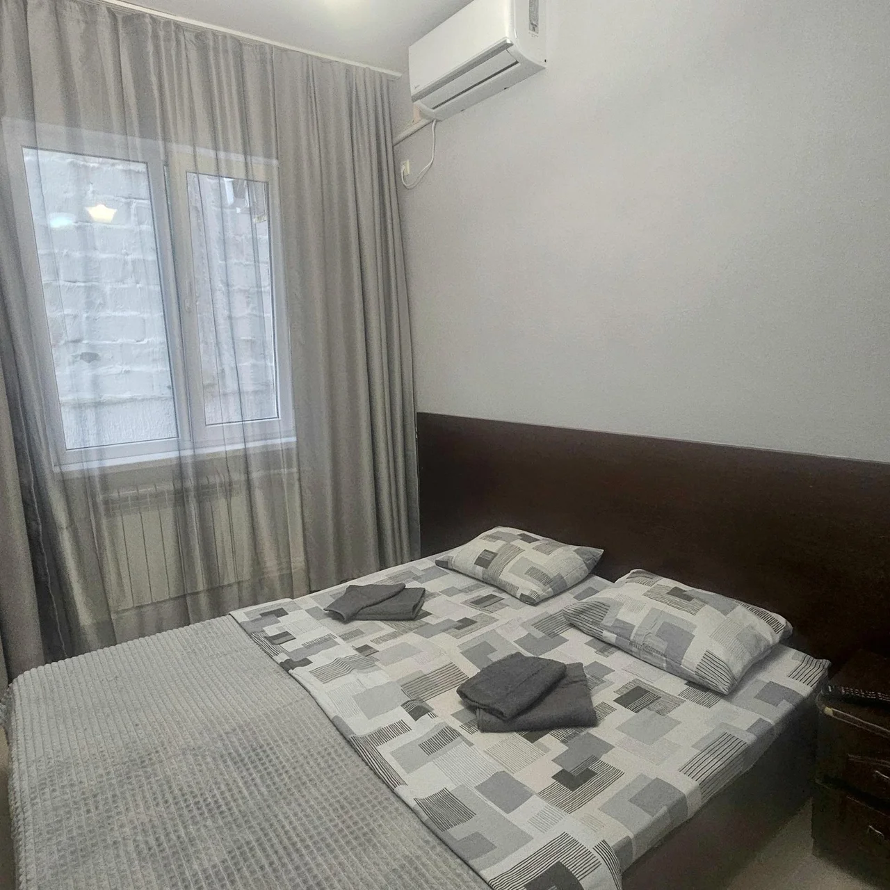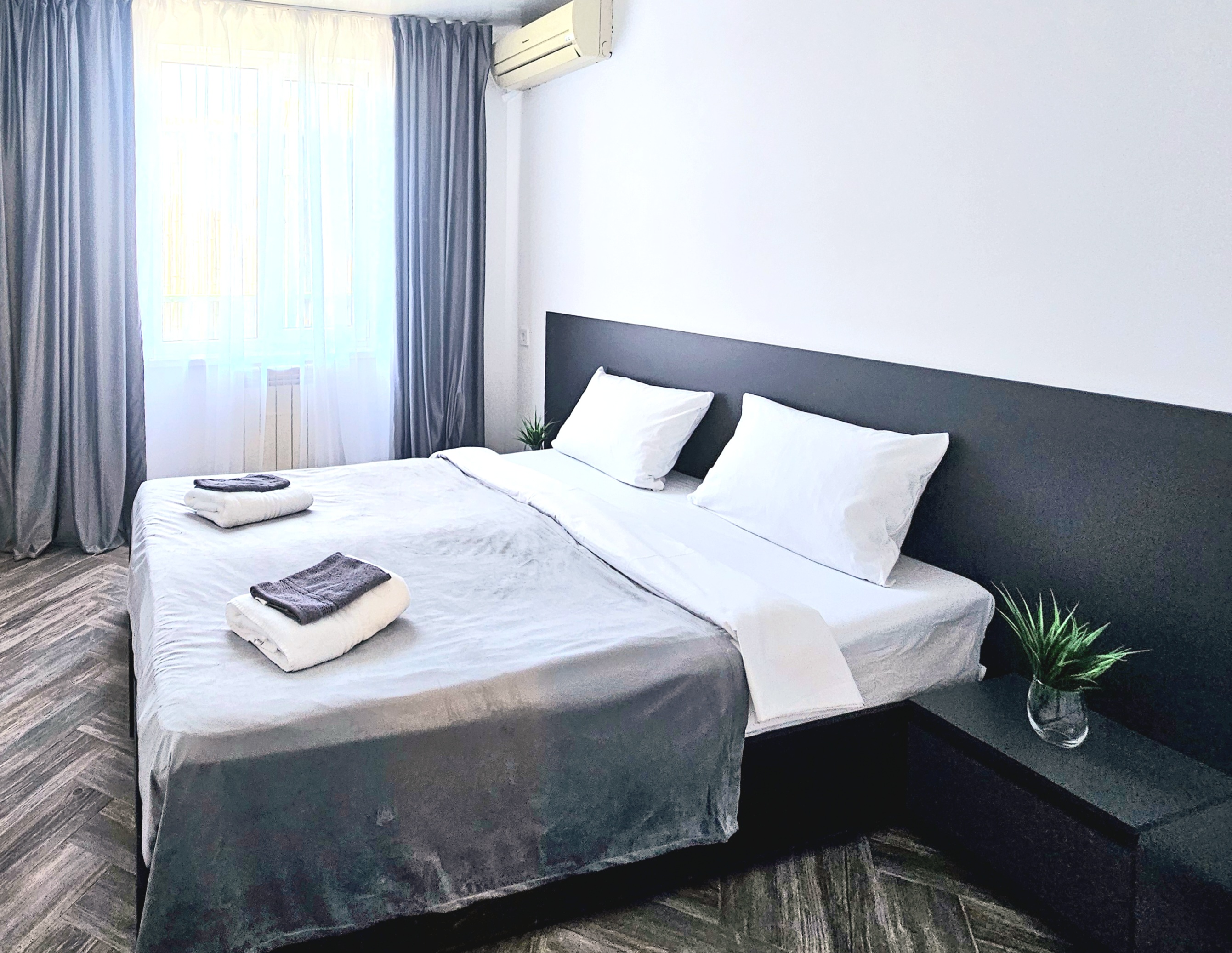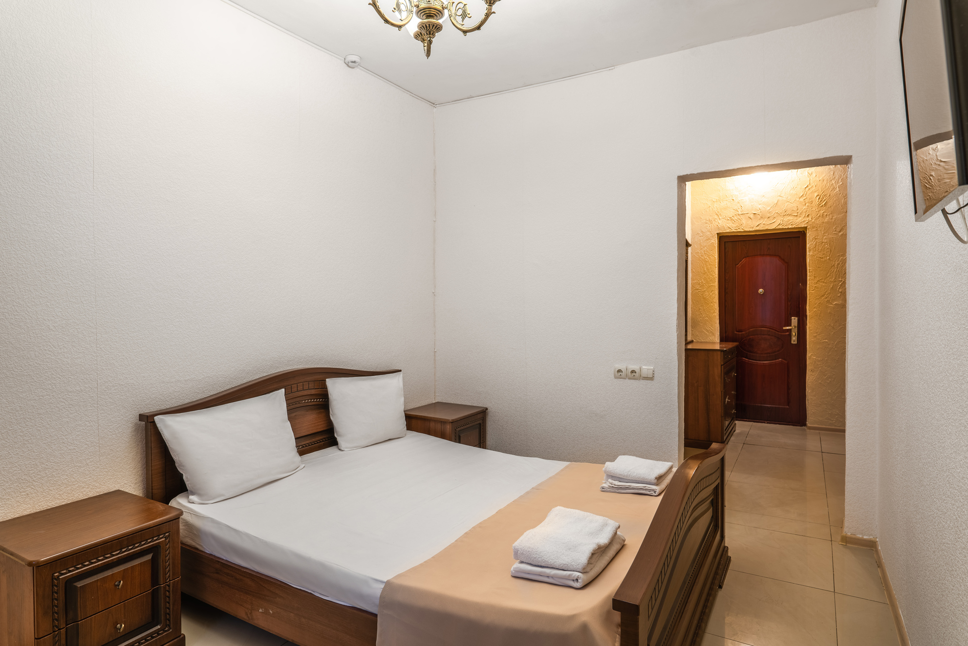 В номере: зеркало, кровать двуспальная, прикроватные тумбочки, шкаф, кондиционер, мини-холодильник, телевизор ЖК