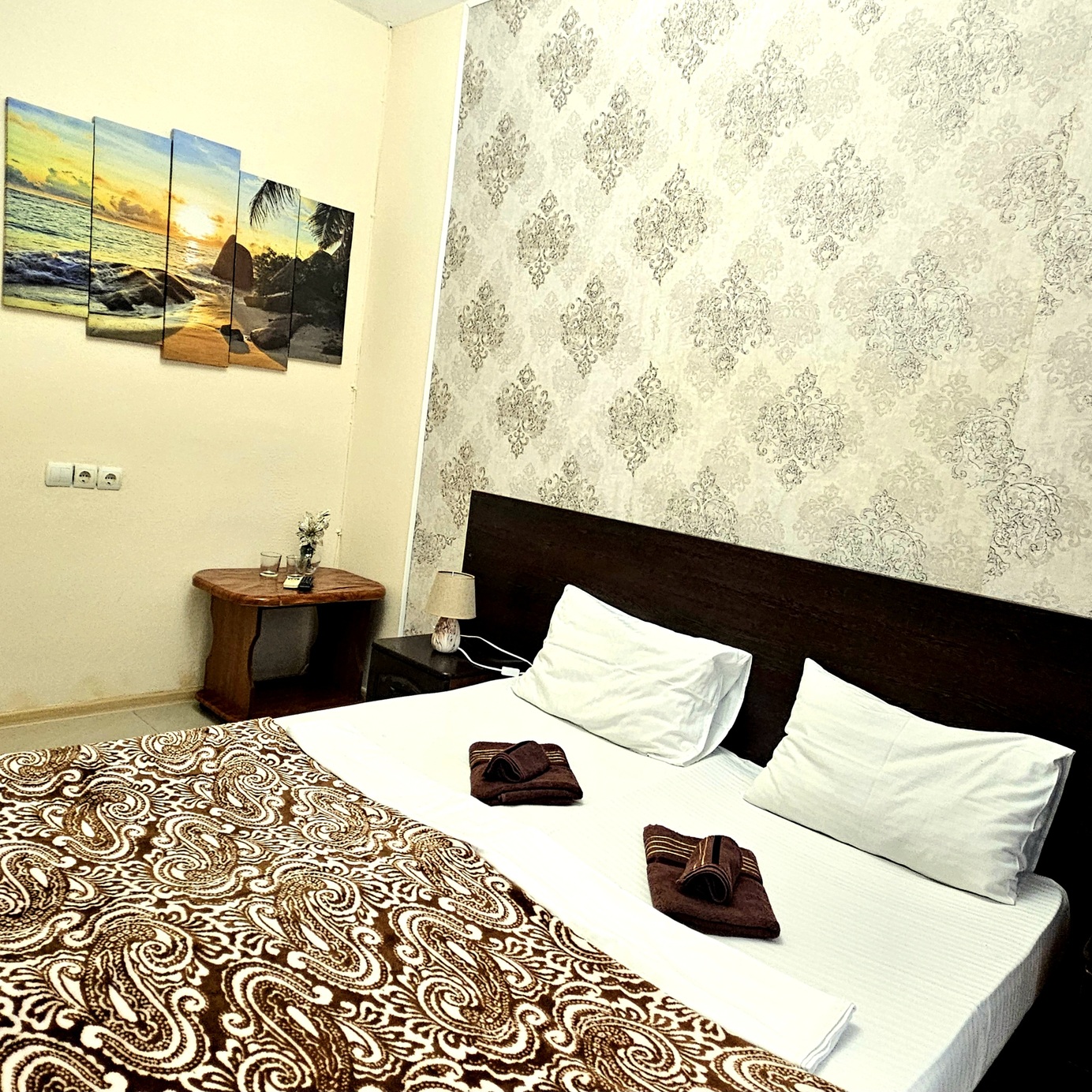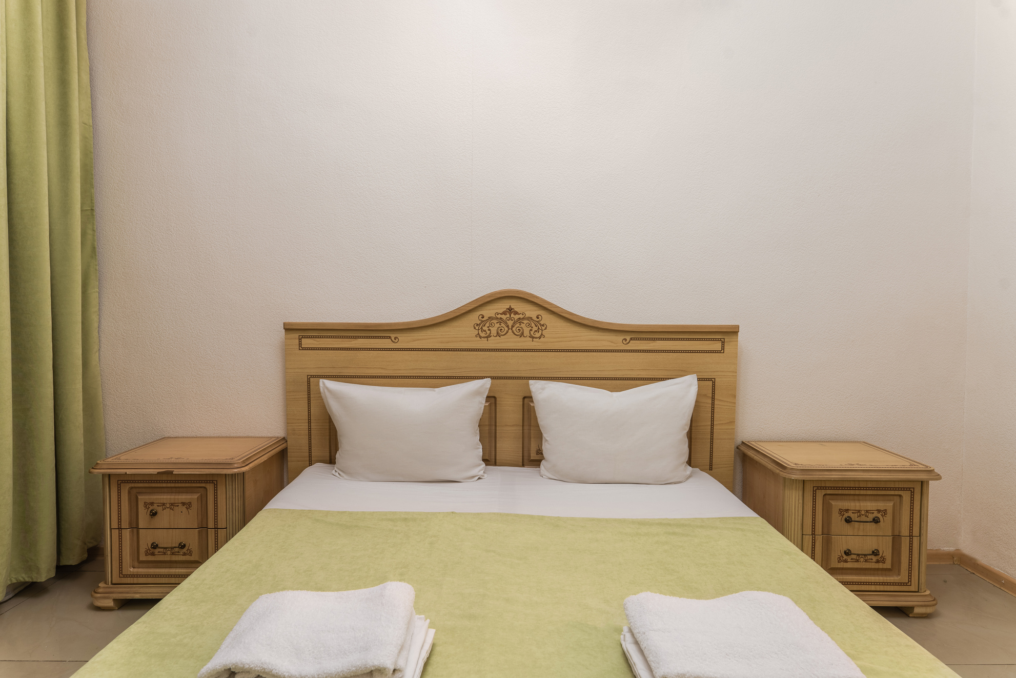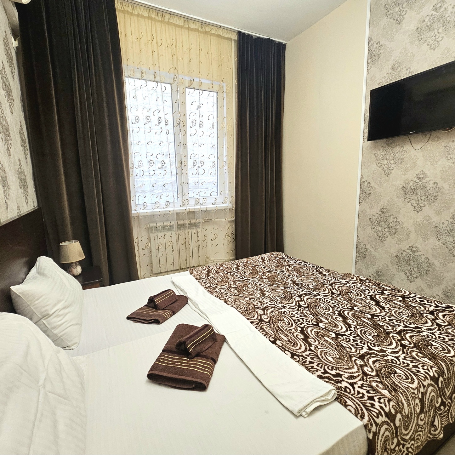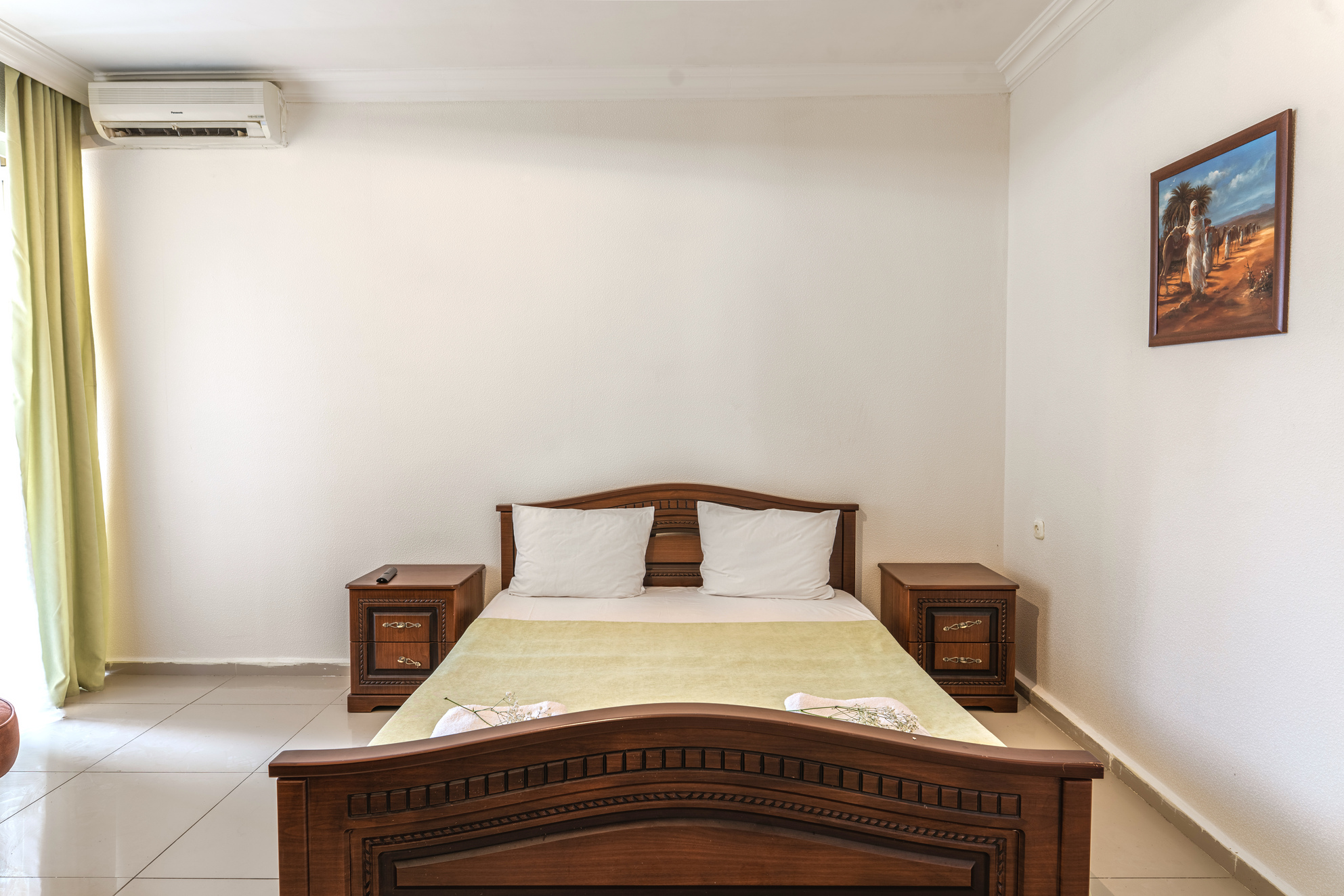 В номере: зеркало, кровать двуспальная, прикроватные тумбочки, шкаф, кондиционер, мини-холодильник, телевизор ЖК