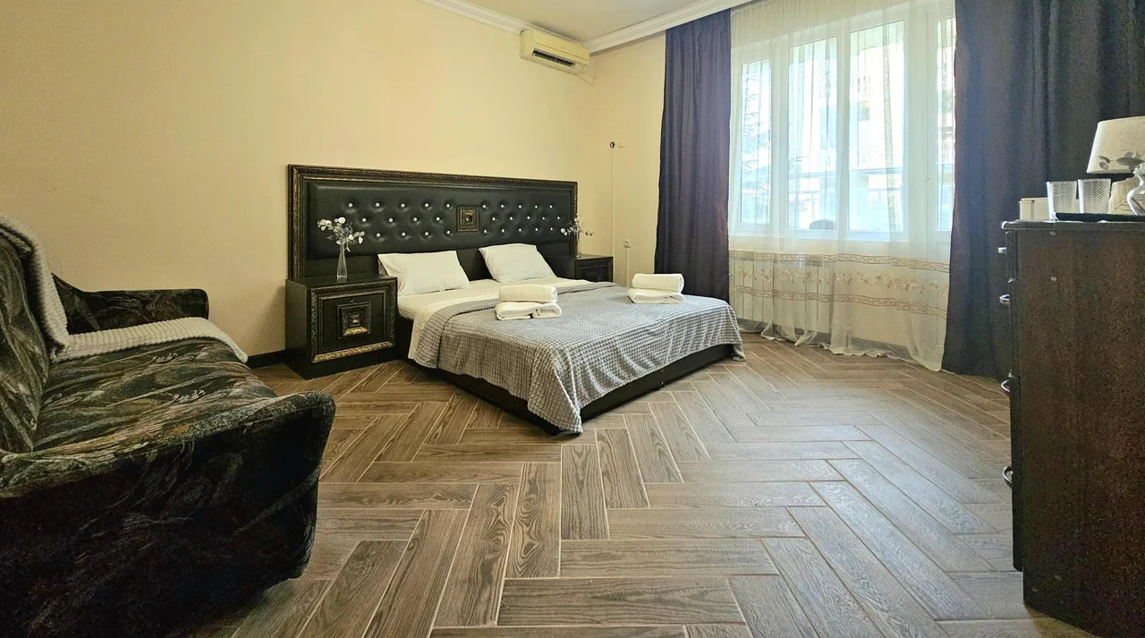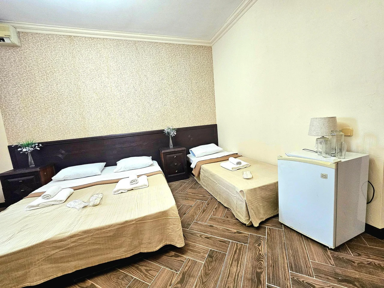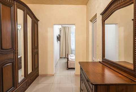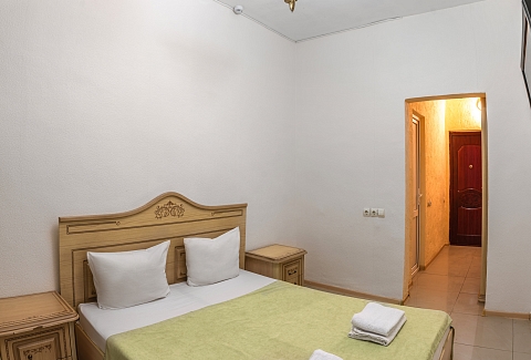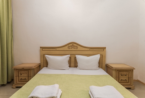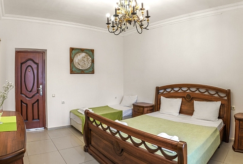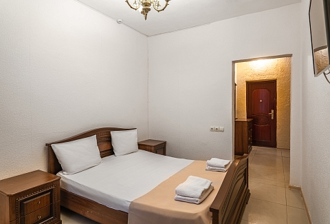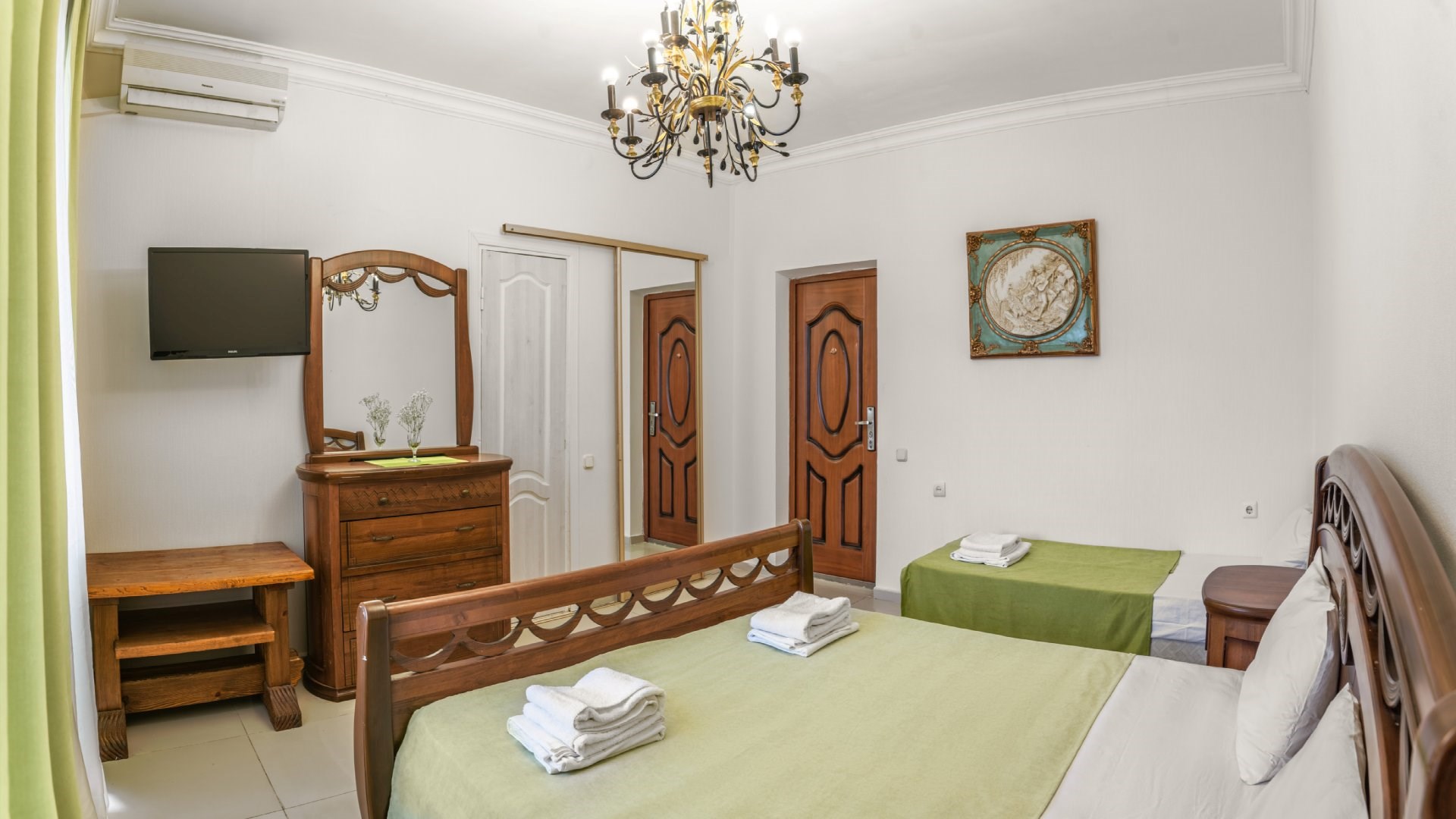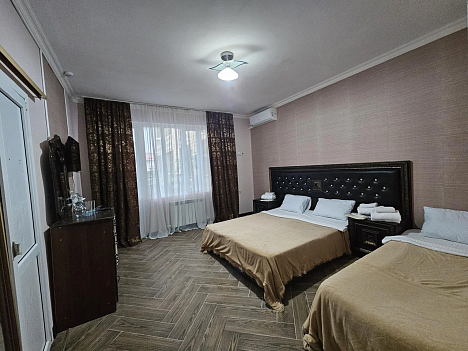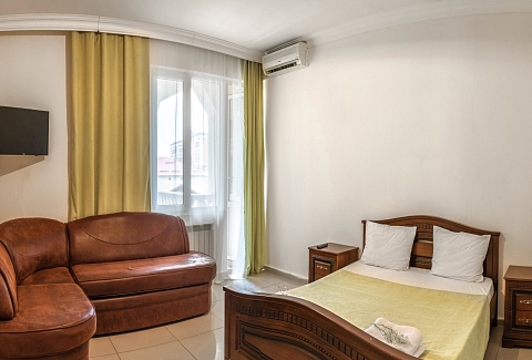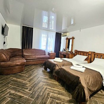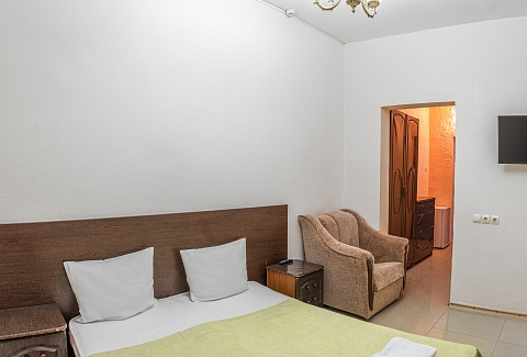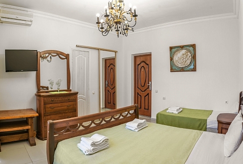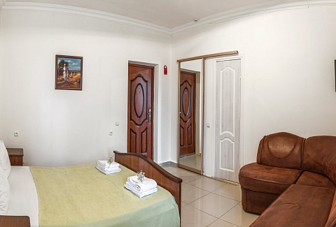 В номере: диван раскладной, зеркало, кровать двуспальная, кровать односпальная, прикроватные тумбочки, шкаф, кондиционер, мини-холодильник, телевизор ЖК