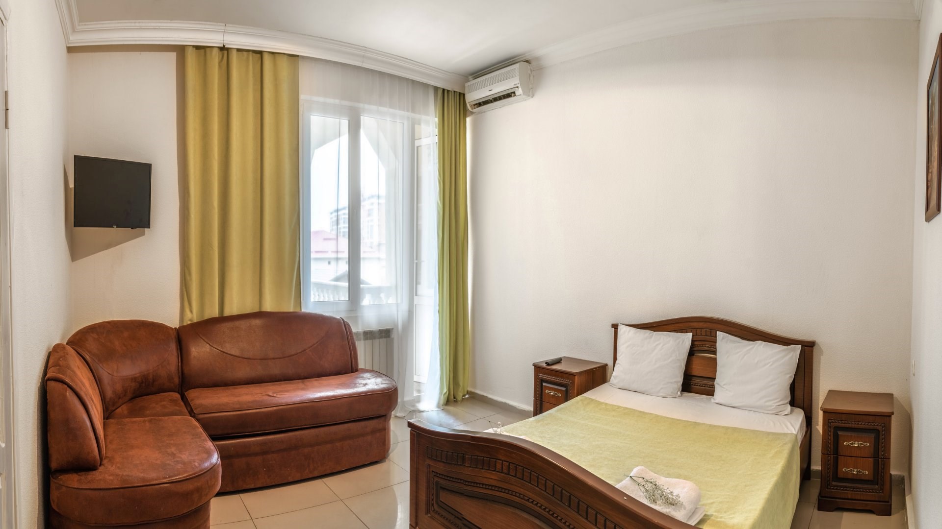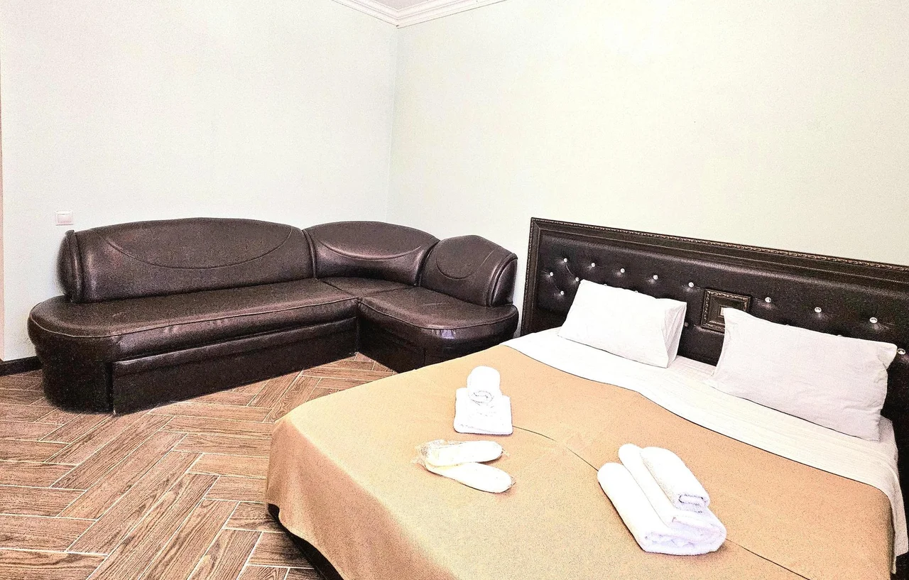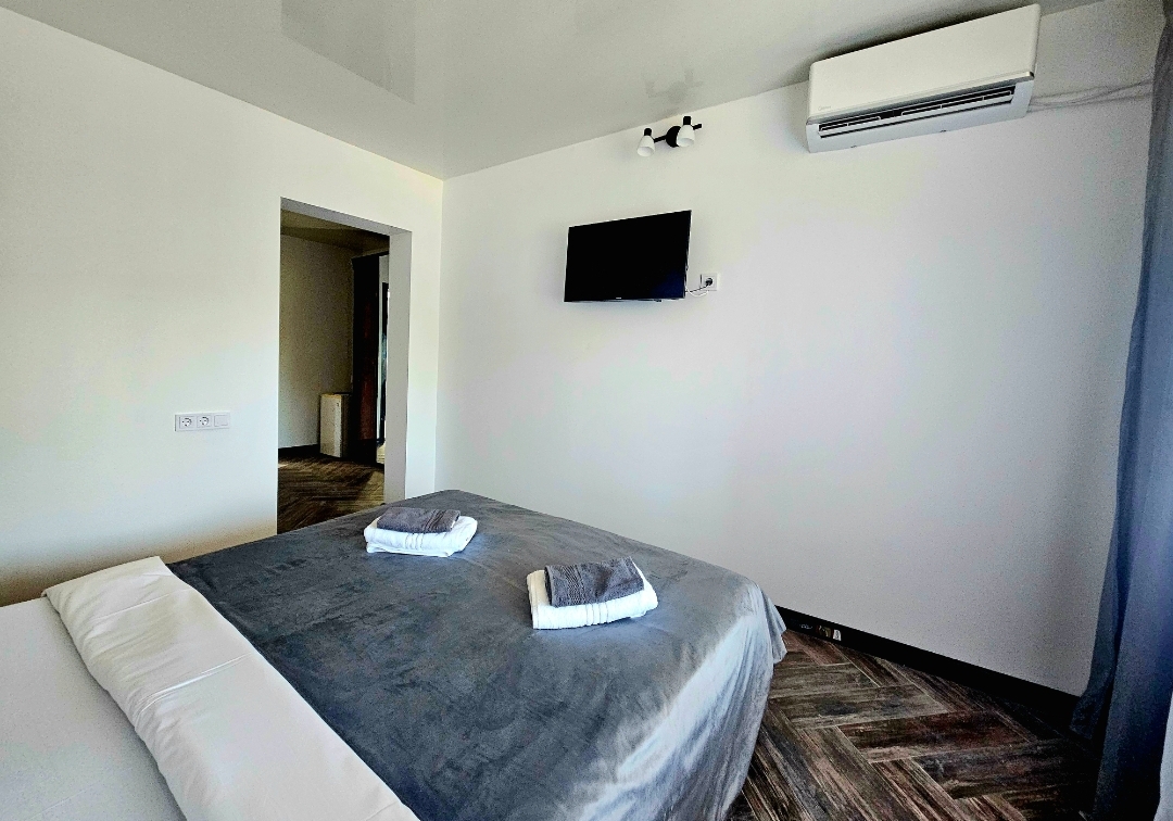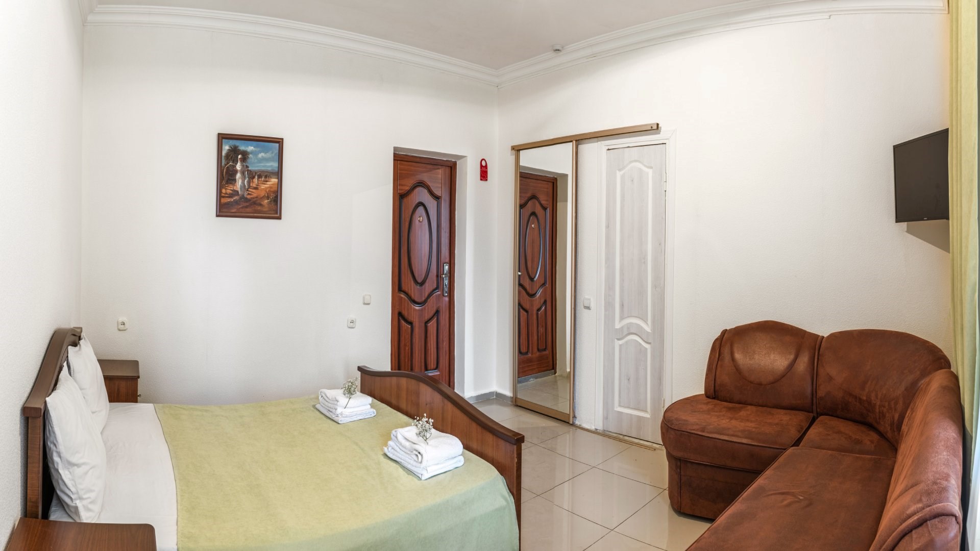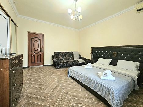 В номере: диван раскладной, зеркало, кровать двуспальная, кровать односпальная, прикроватные тумбочки, шкаф, кондиционер, мини-холодильник, телевизор ЖК