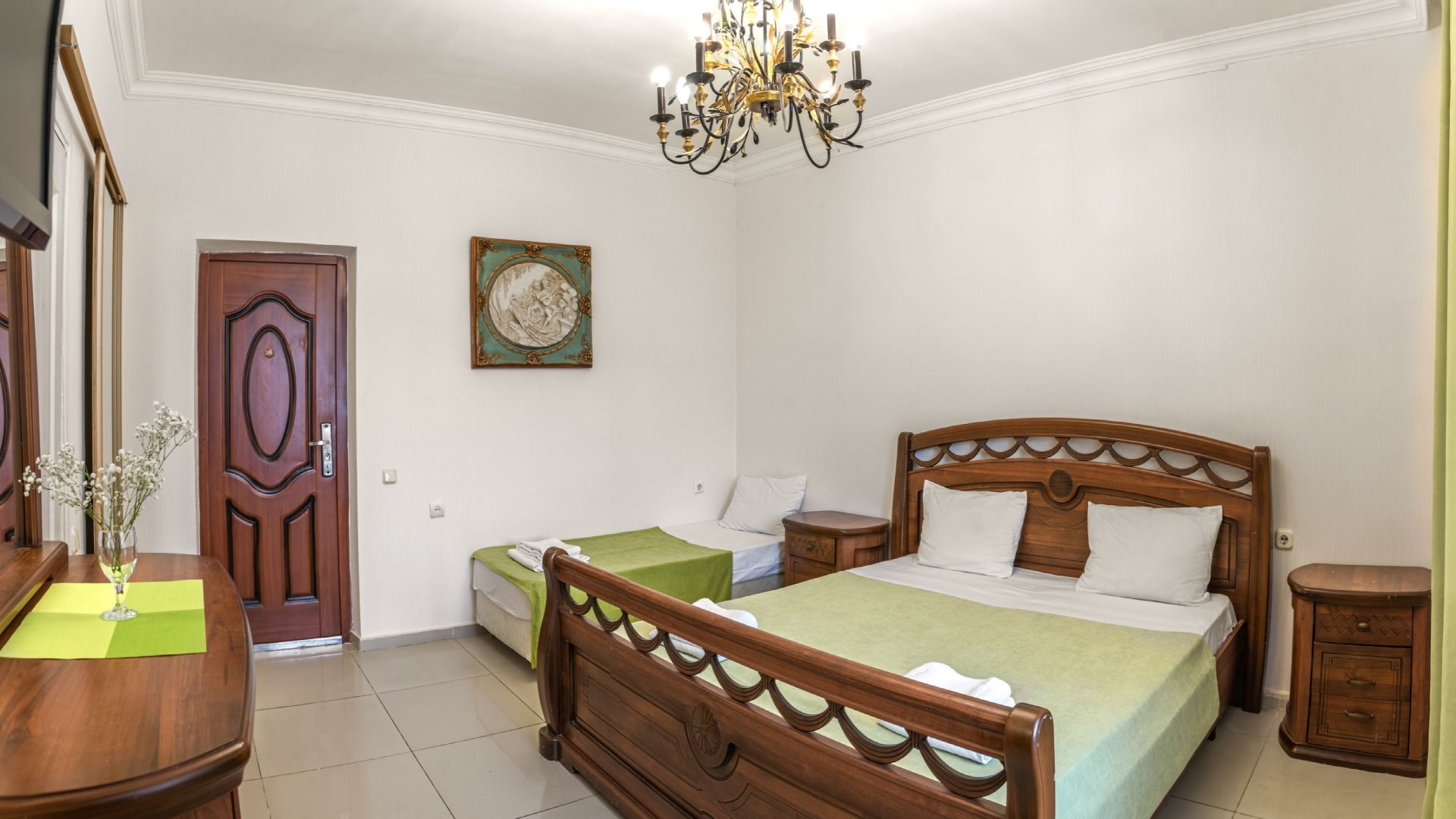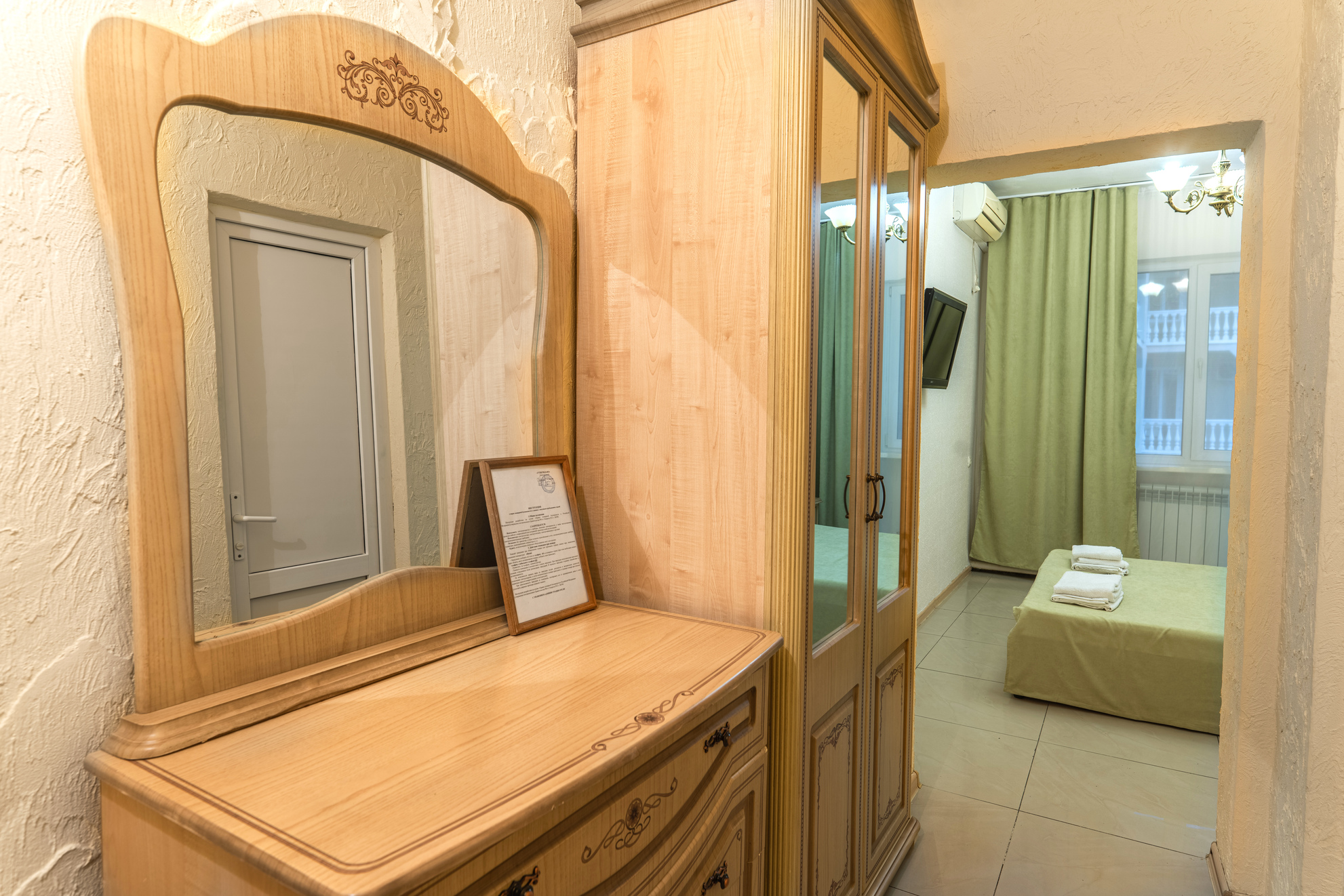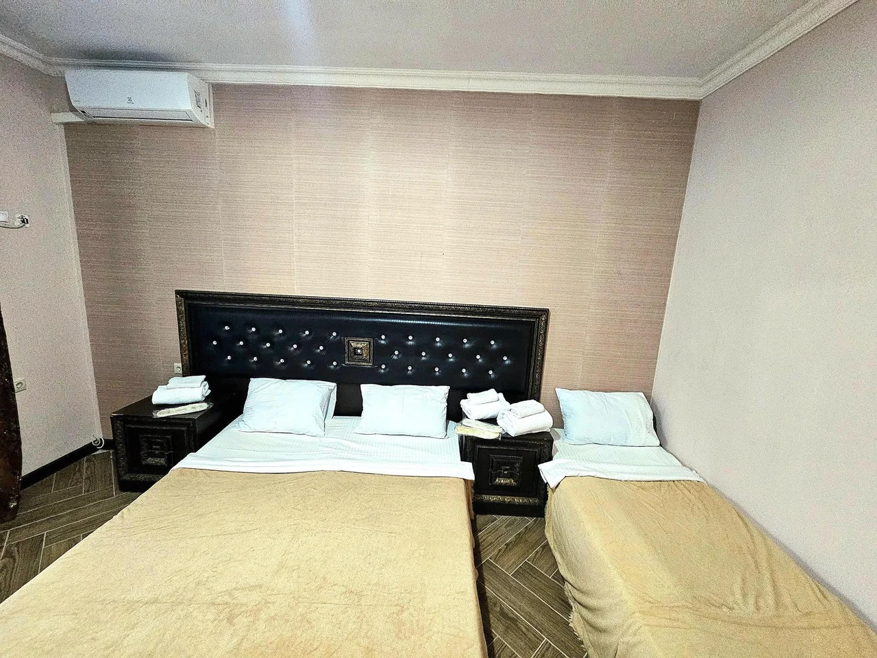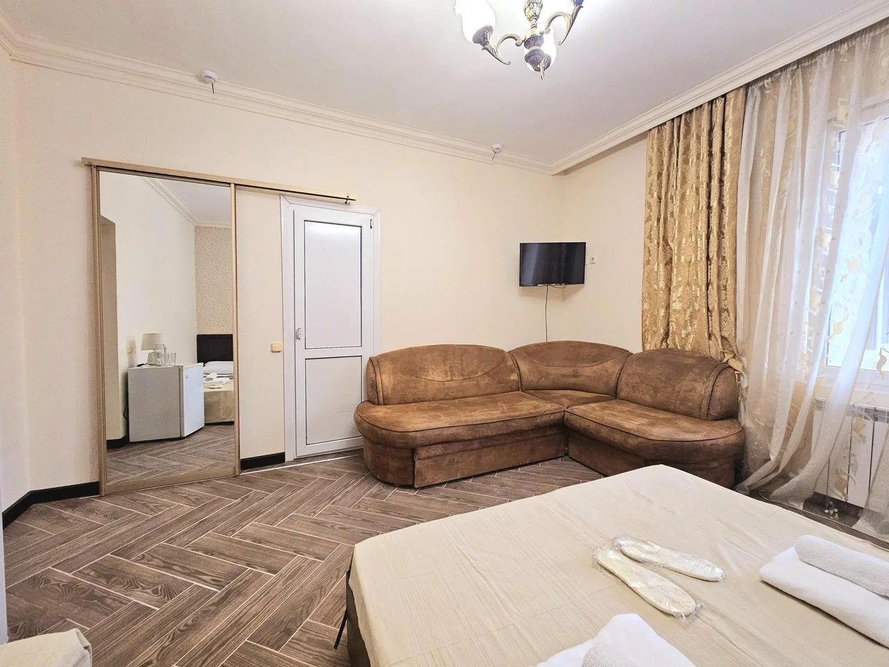 В номере: диван раскладной, зеркало, кровать двуспальная, кровать односпальная, прикроватные тумбочки, шкаф, кондиционер, мини-холодильник, телевизор ЖК