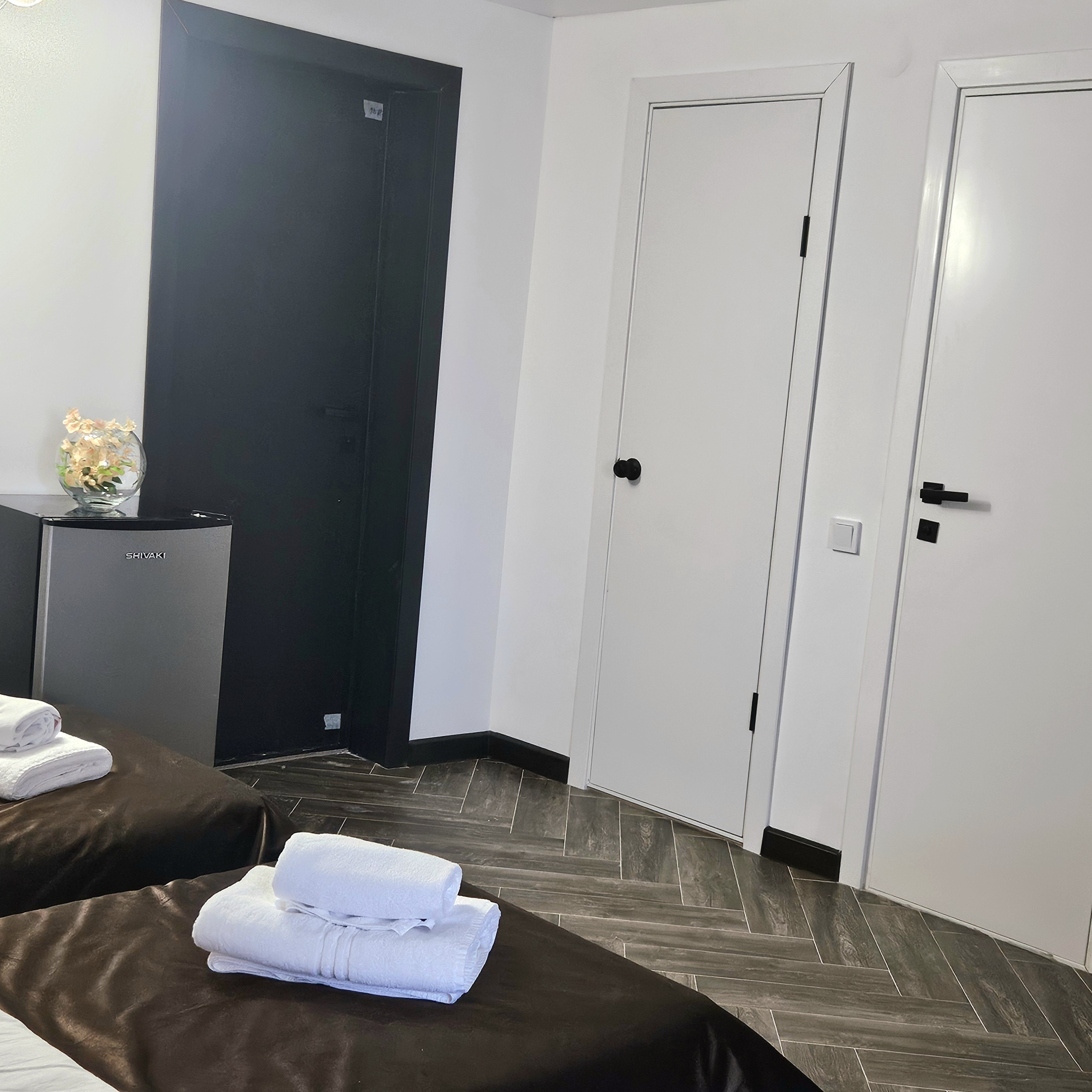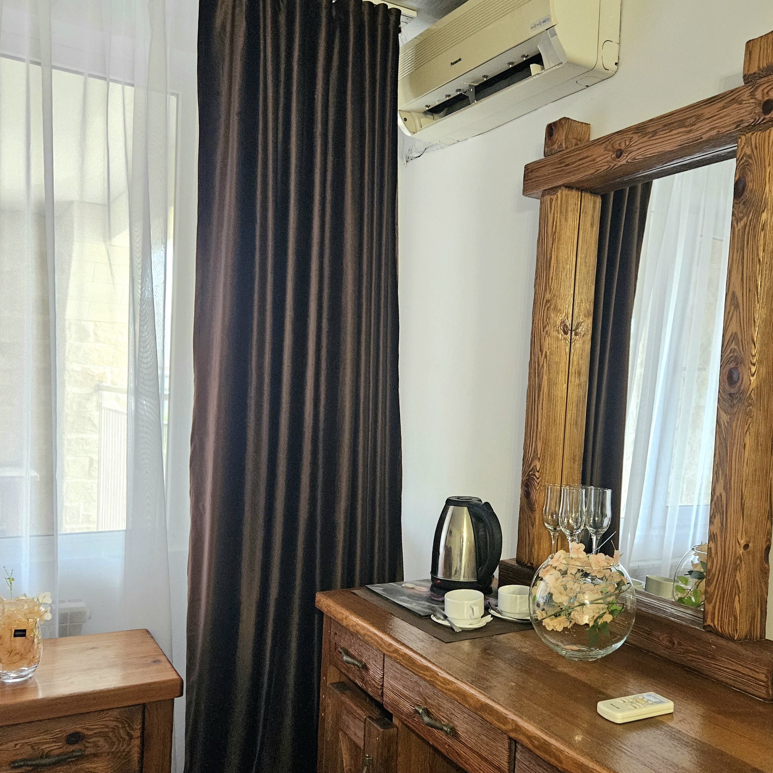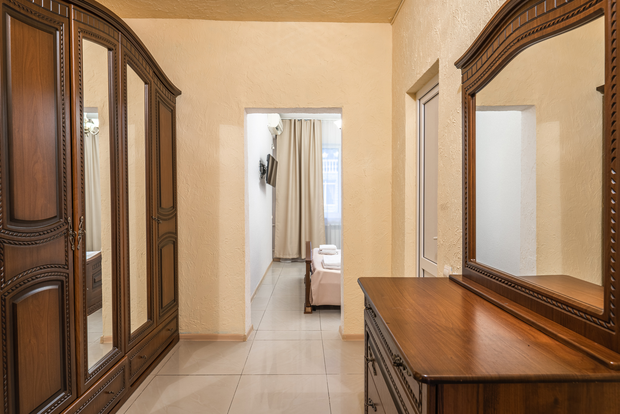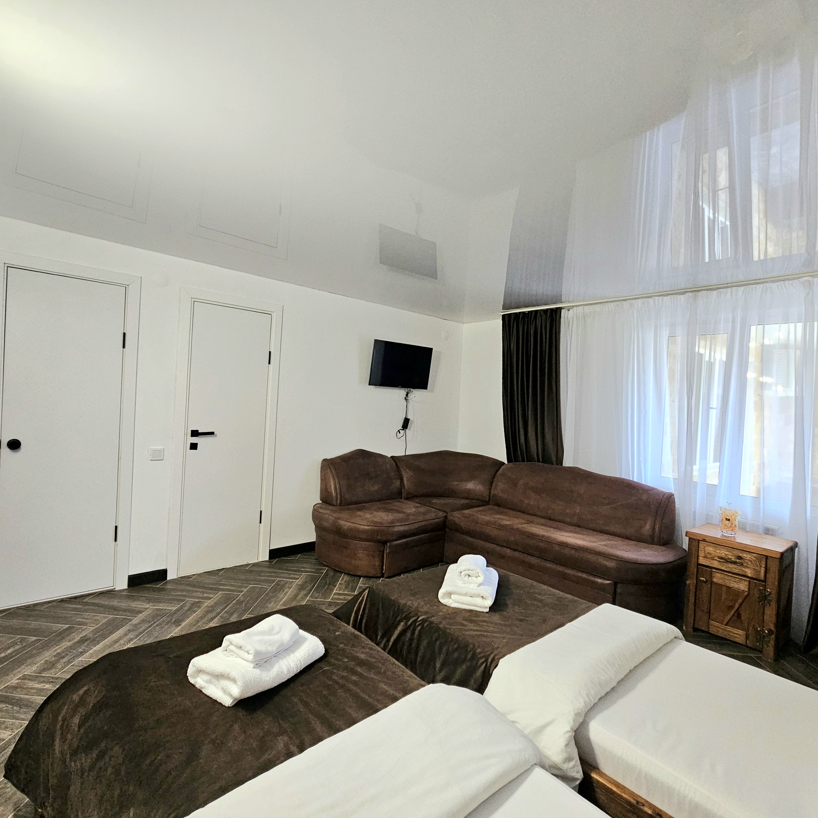 В номере: диван раскладной, зеркало, кровать двуспальная, кровать односпальная, прикроватные тумбочки, шкаф, кондиционер, мини-холодильник, телевизор ЖК