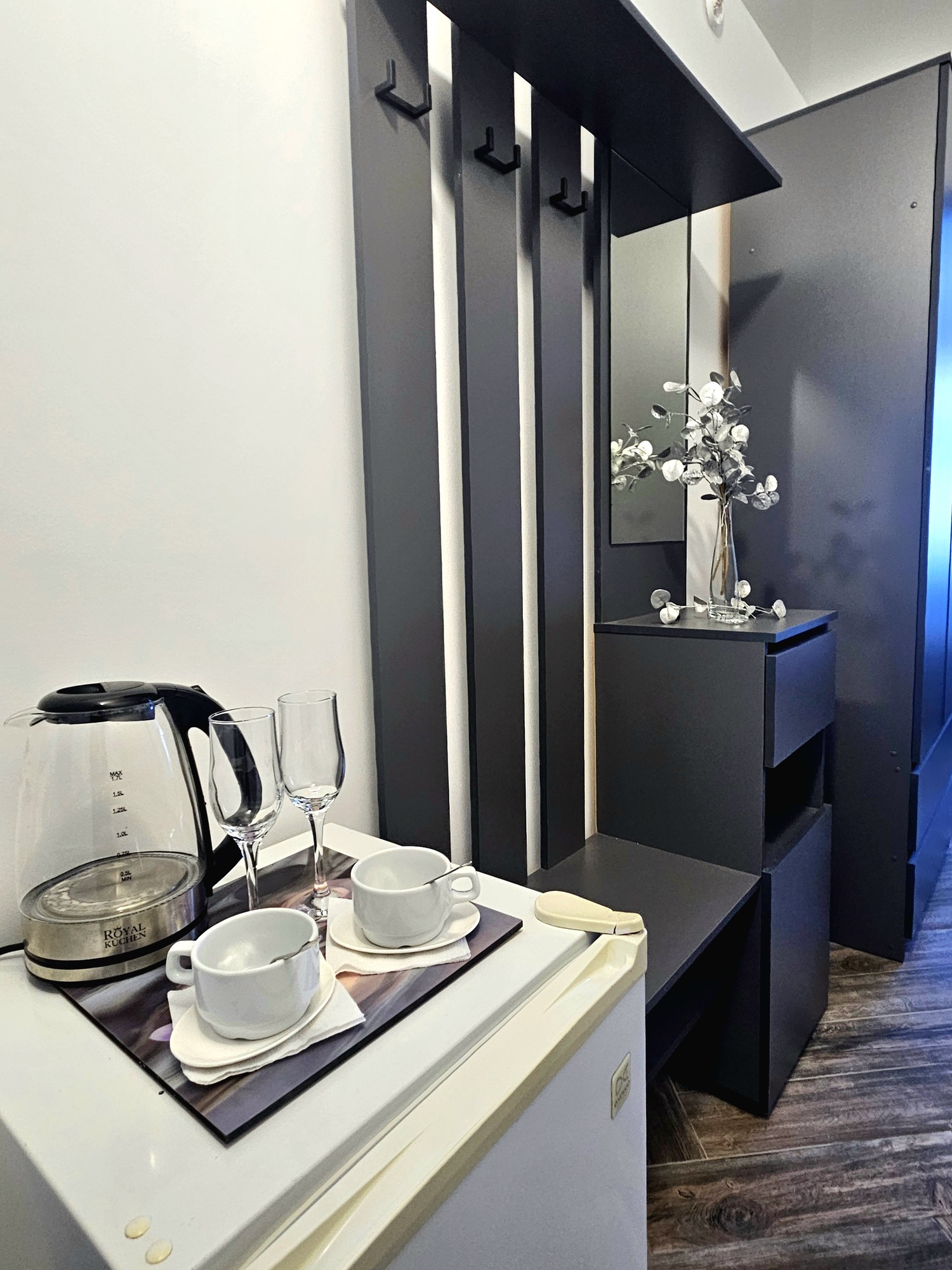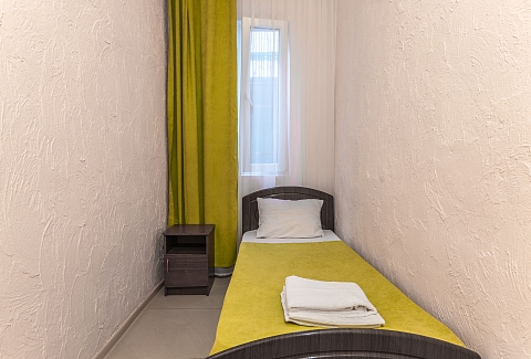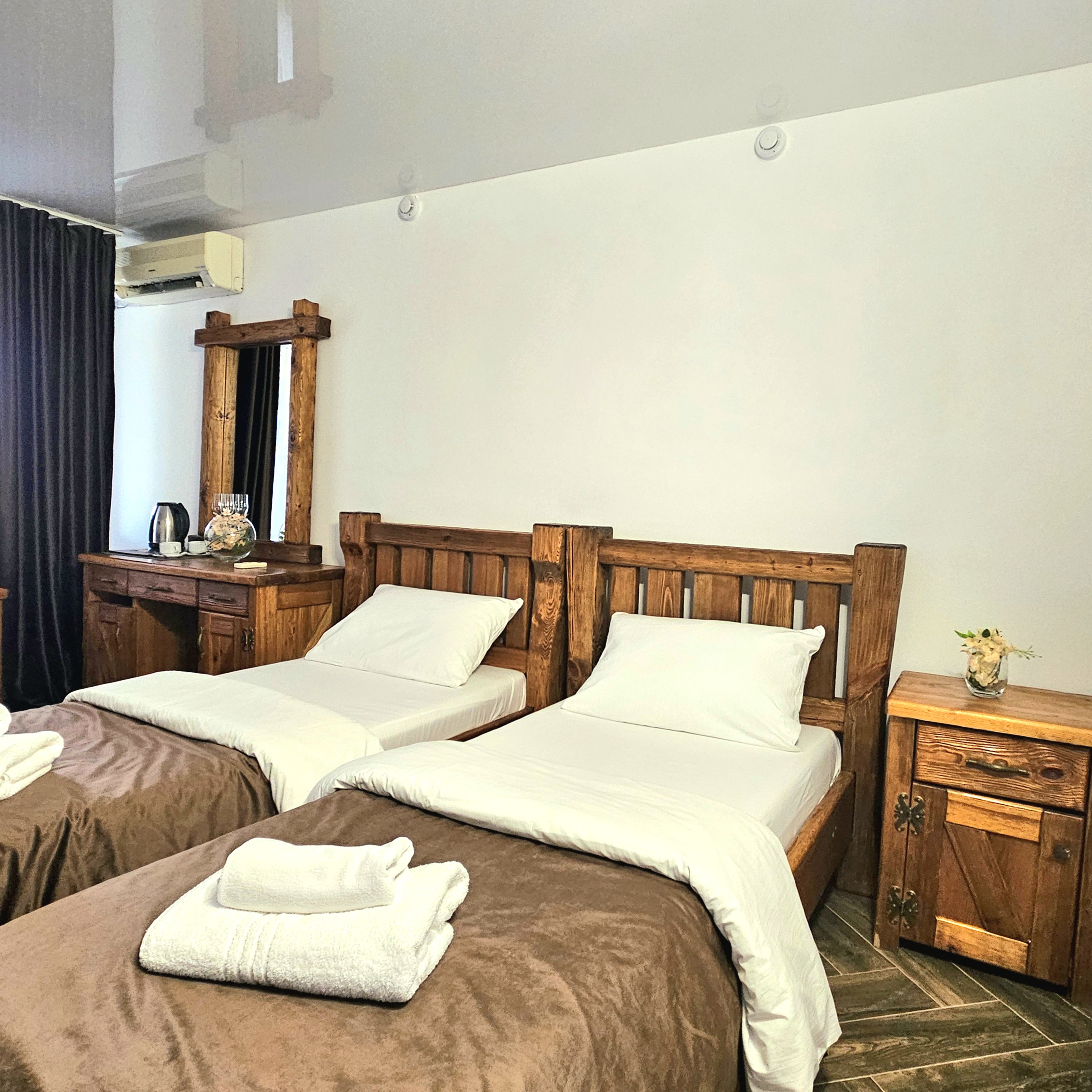 В номере: диван, зеркало, кровати односпальные, прикроватные тумбочки, стол, шкаф, кондиционер, мини-холодильник, телевизор ЖК, чайный набор посуды, электрочайник