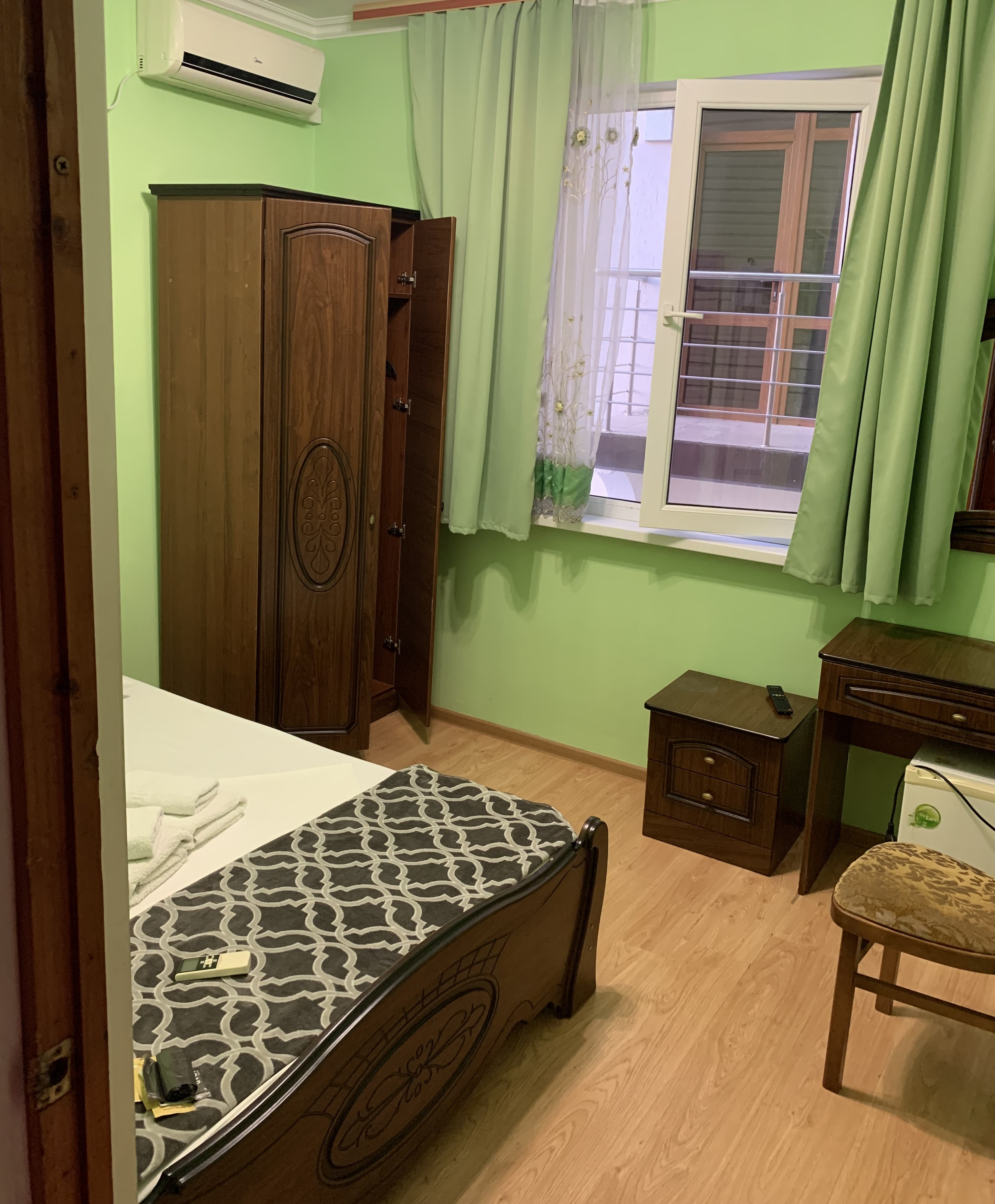 В номере: кровать двуспальная, прикроватные тумбочки, стол, стулья, шкаф, мини-холодильник, сплит-система, телевизор