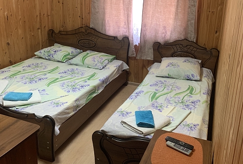 В номере: кровать двуспальная, кровать односпальная, прикроватные тумбочки, стол, стулья, шкаф, мини-холодильник, сплит-система, телевизор