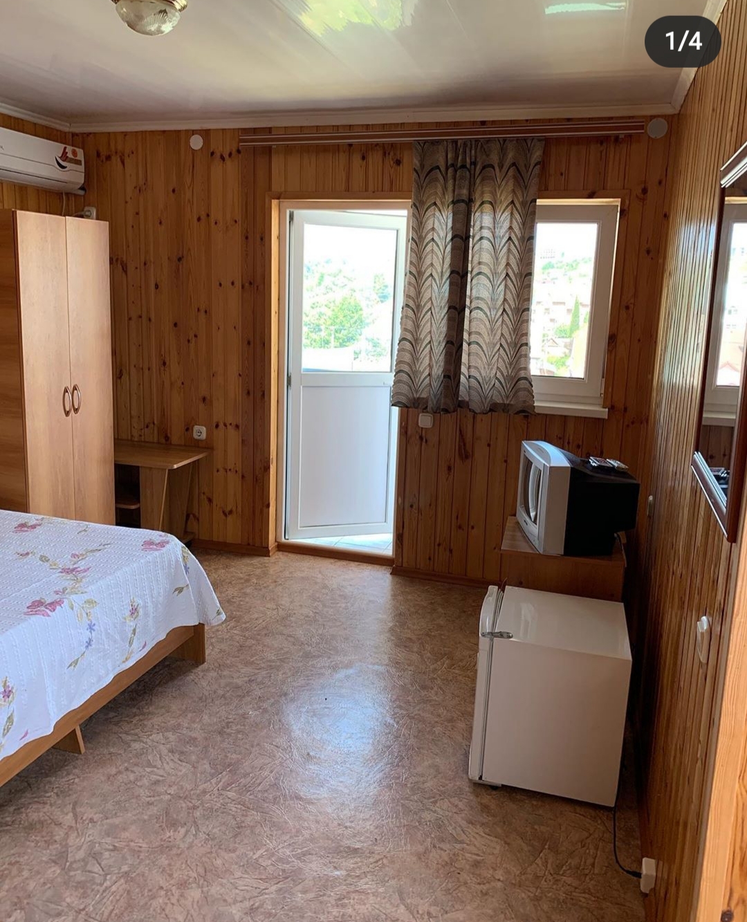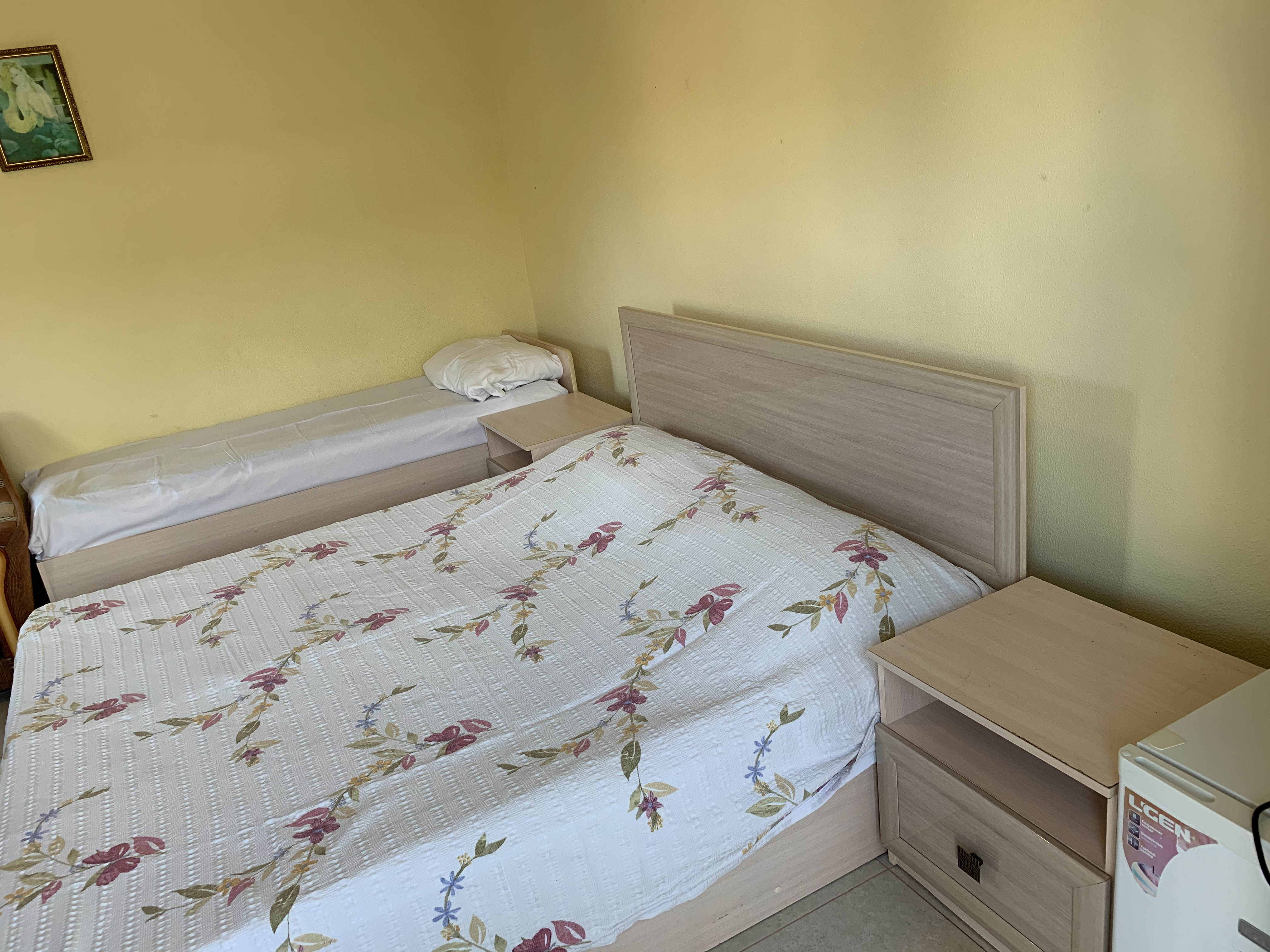 В номере: зеркало, кровать двуспальная, кровать односпальная, прикроватная тумбочка, шкаф, вентилятор, телевизор, холодильник