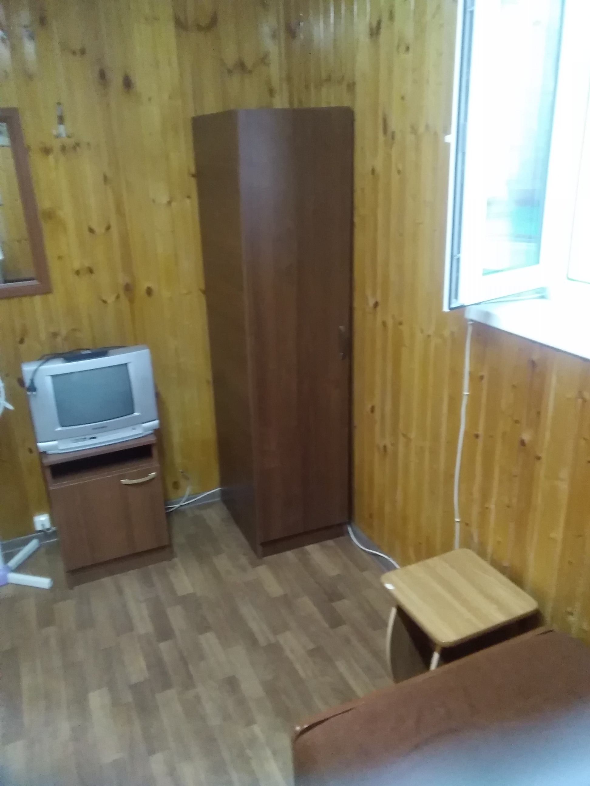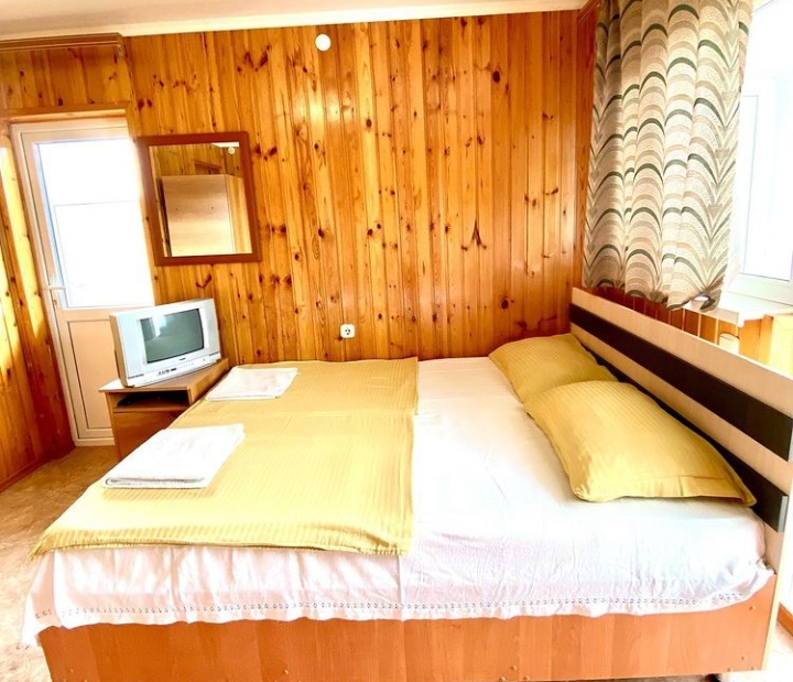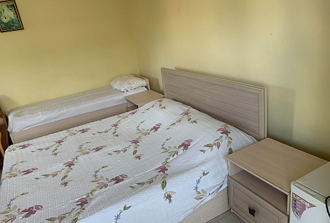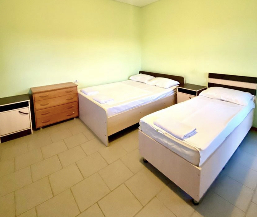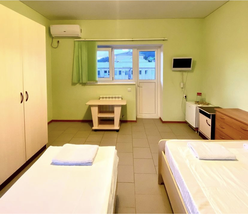 В номере: вешалка, зеркало, кровати односпальные /одна двуспальная кровать, прикроватная тумбочка, столик журнальный, шкаф, вентилятор, телевизор, холодильник