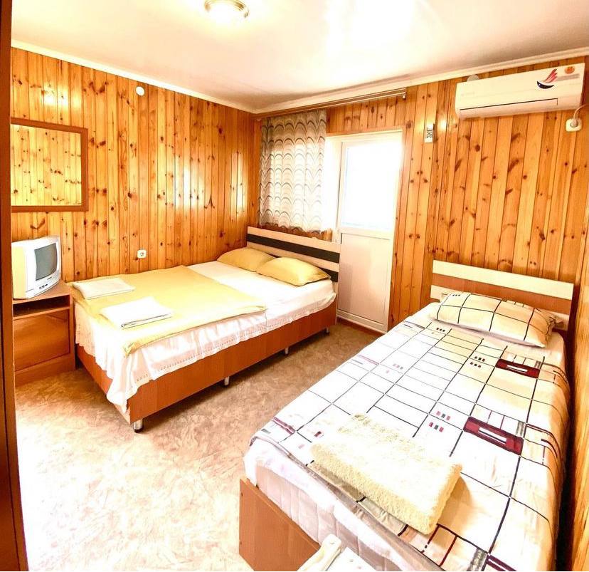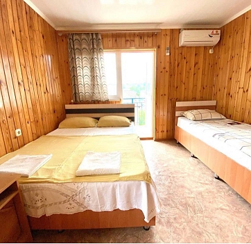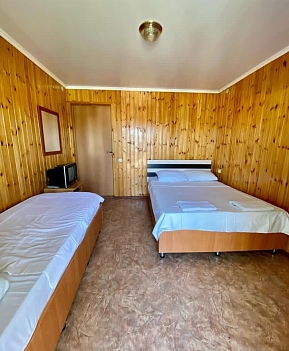 В номере: зеркало, кровать двуспальная, кровать односпальная, прикроватные тумбочки, столик журнальный, шкаф, кондиционер, мини-холодильник, телевизор