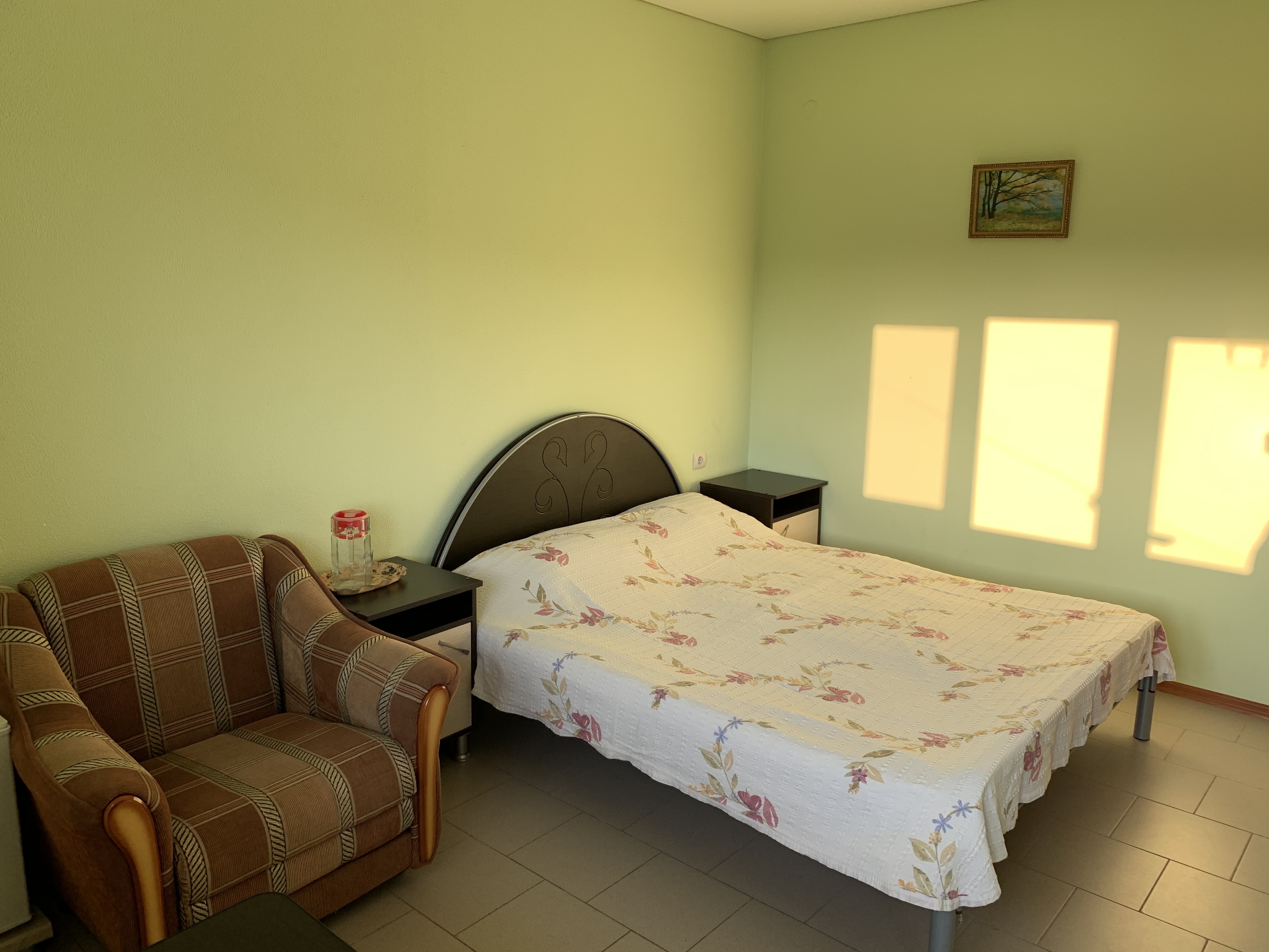 В номере: зеркало, кресло-кровать, кровать двуспальная, прикроватные тумбочки, столик журнальный, шкаф, кондиционер, мини-холодильник, телевизор