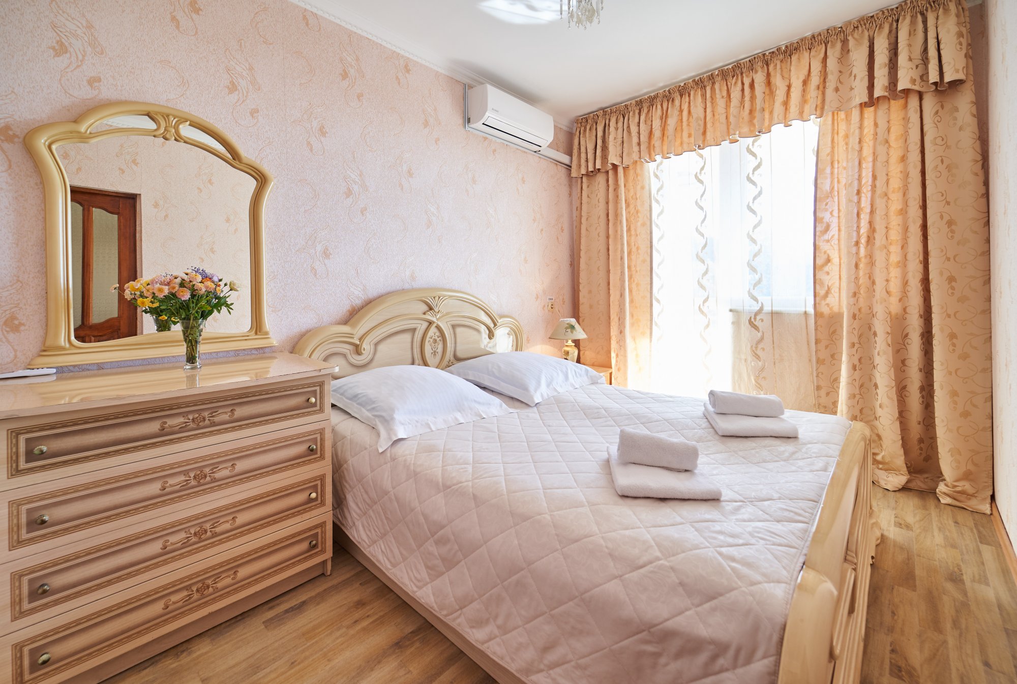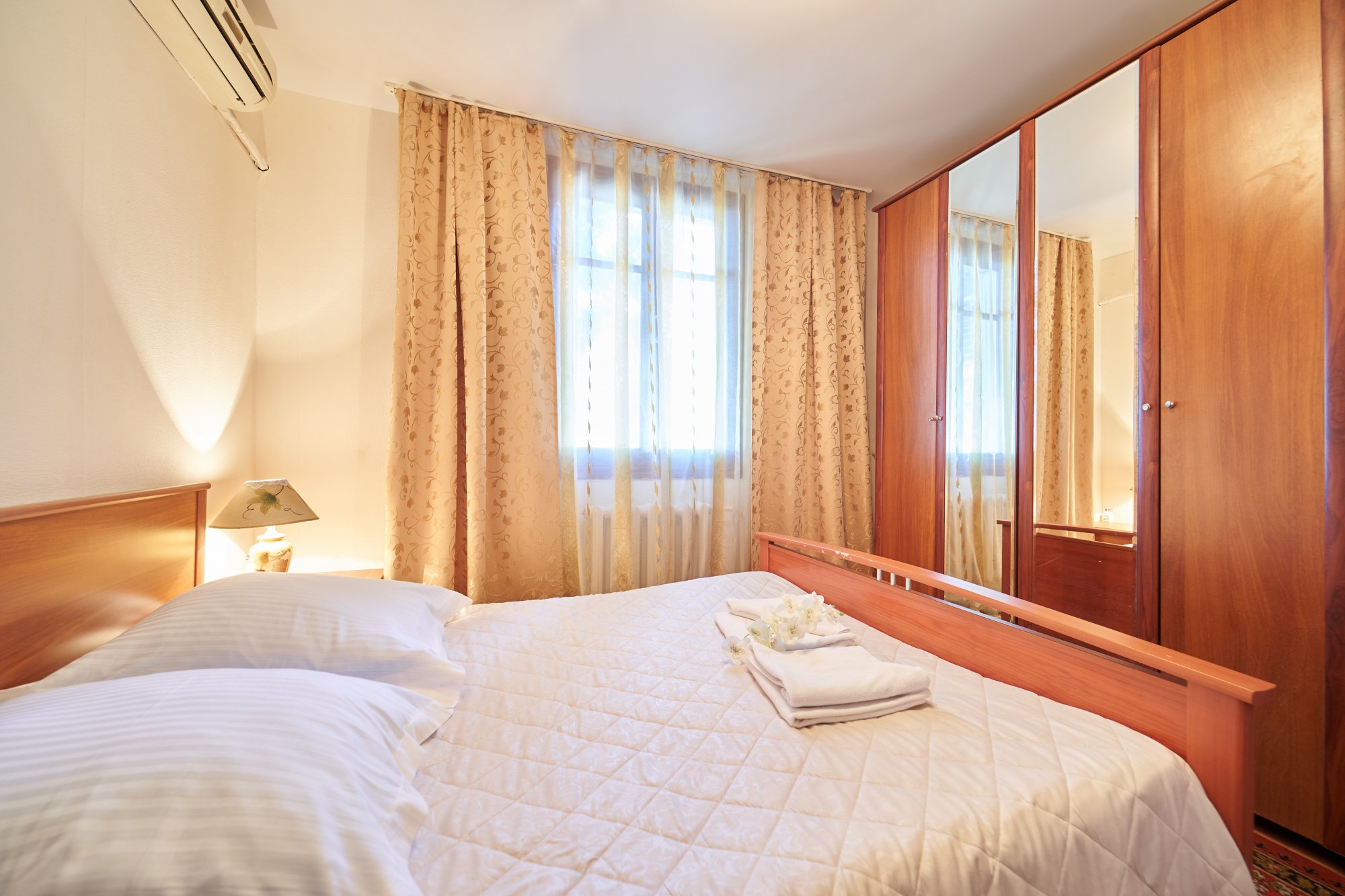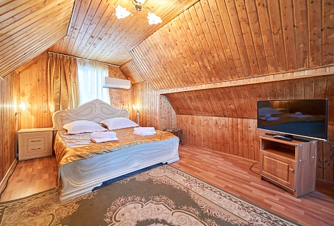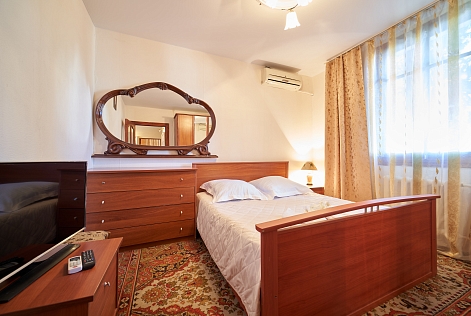 В номере: вешалка, зеркало, кровать двуспальная, набор мягкой мебели, прикроватные тумбочки, стол, шкаф, кондиционер, набор посуды, телевизор, холодильник