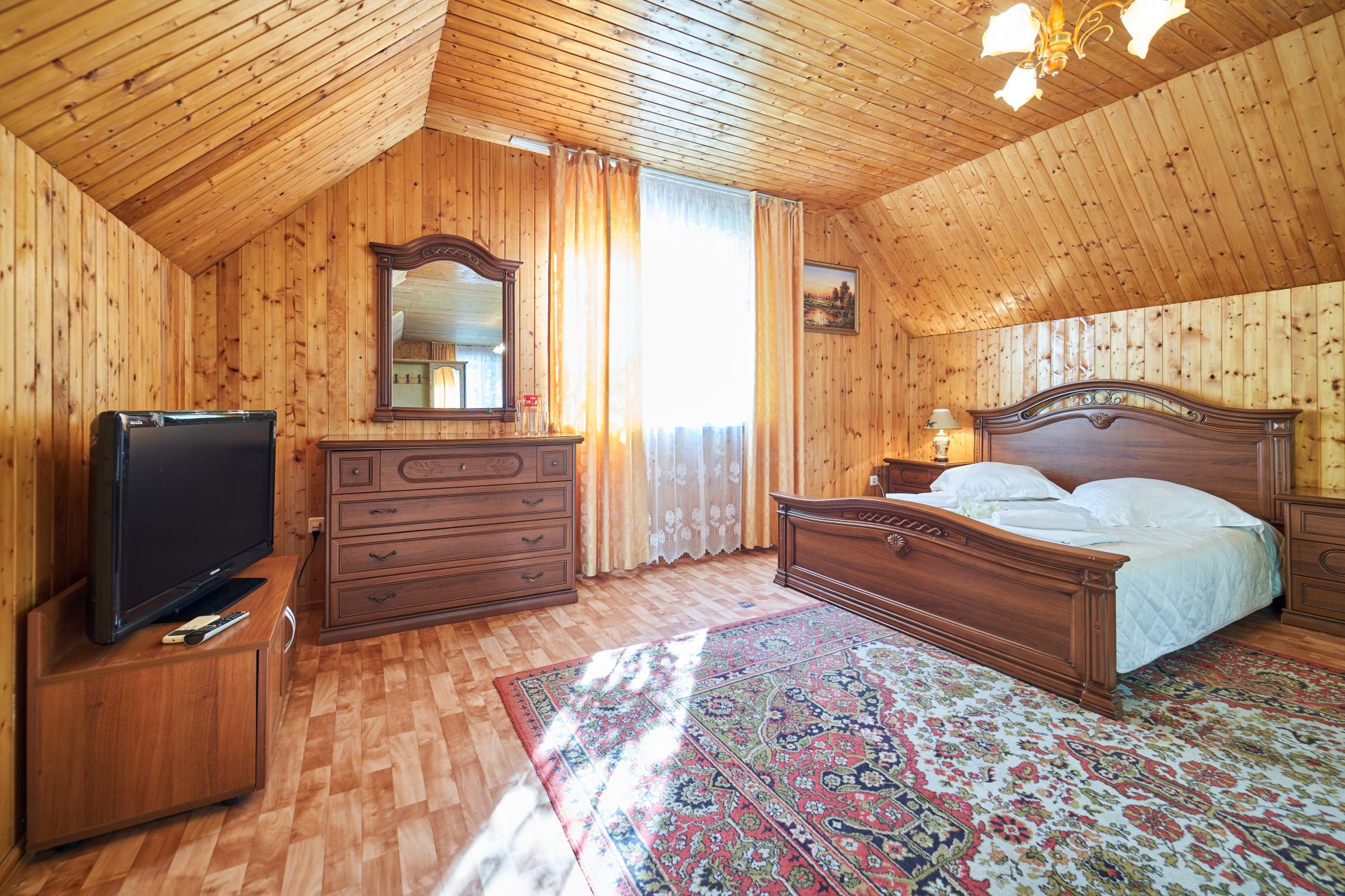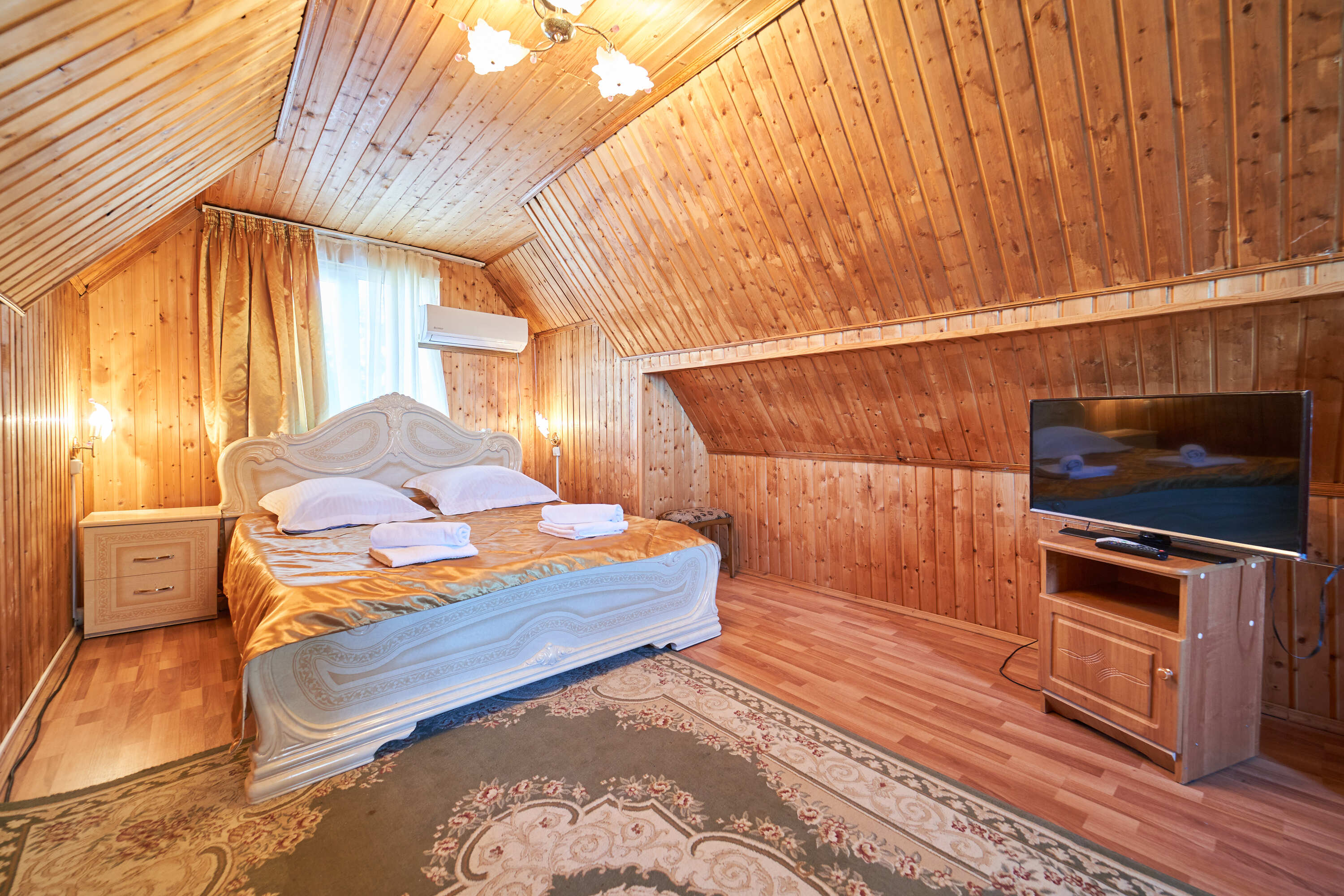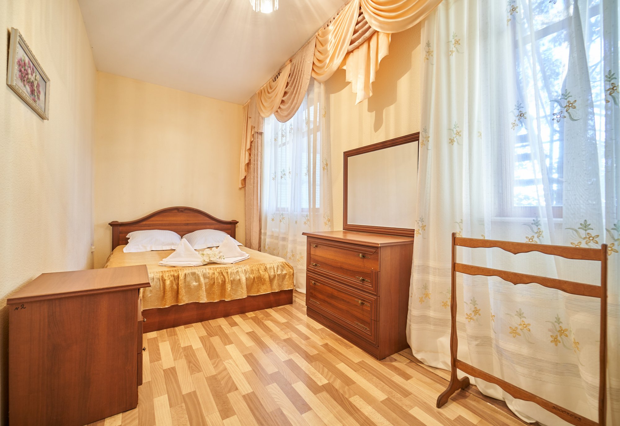 В номере: вешалка, зеркало, кровать двуспальная, набор мягкой мебели, прикроватные тумбочки, стол, шкаф, кондиционер, набор посуды, телевизор, холодильник