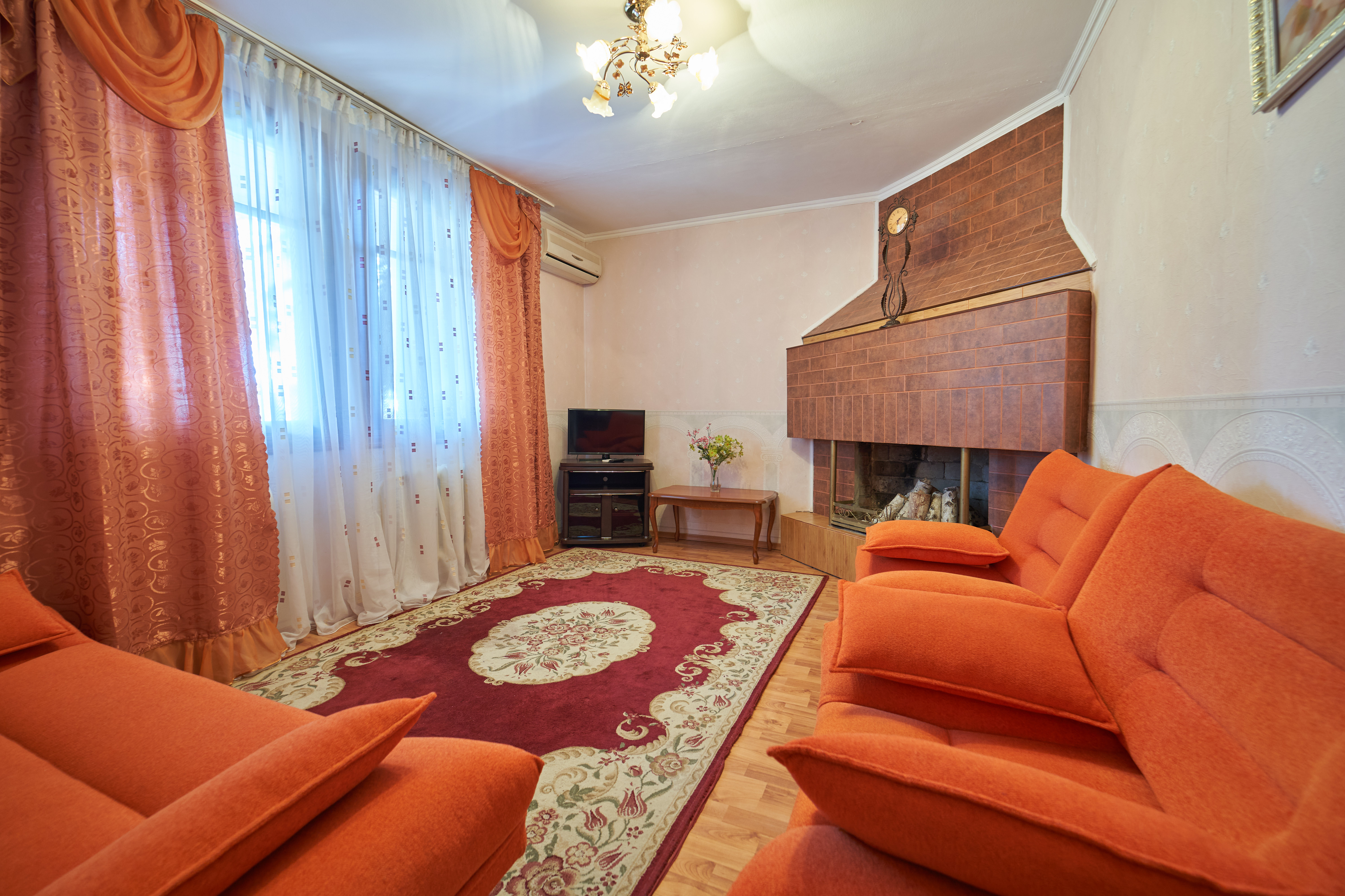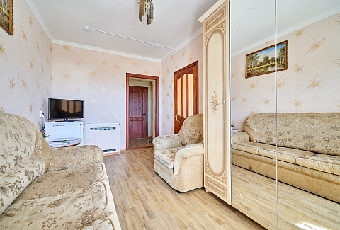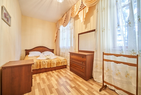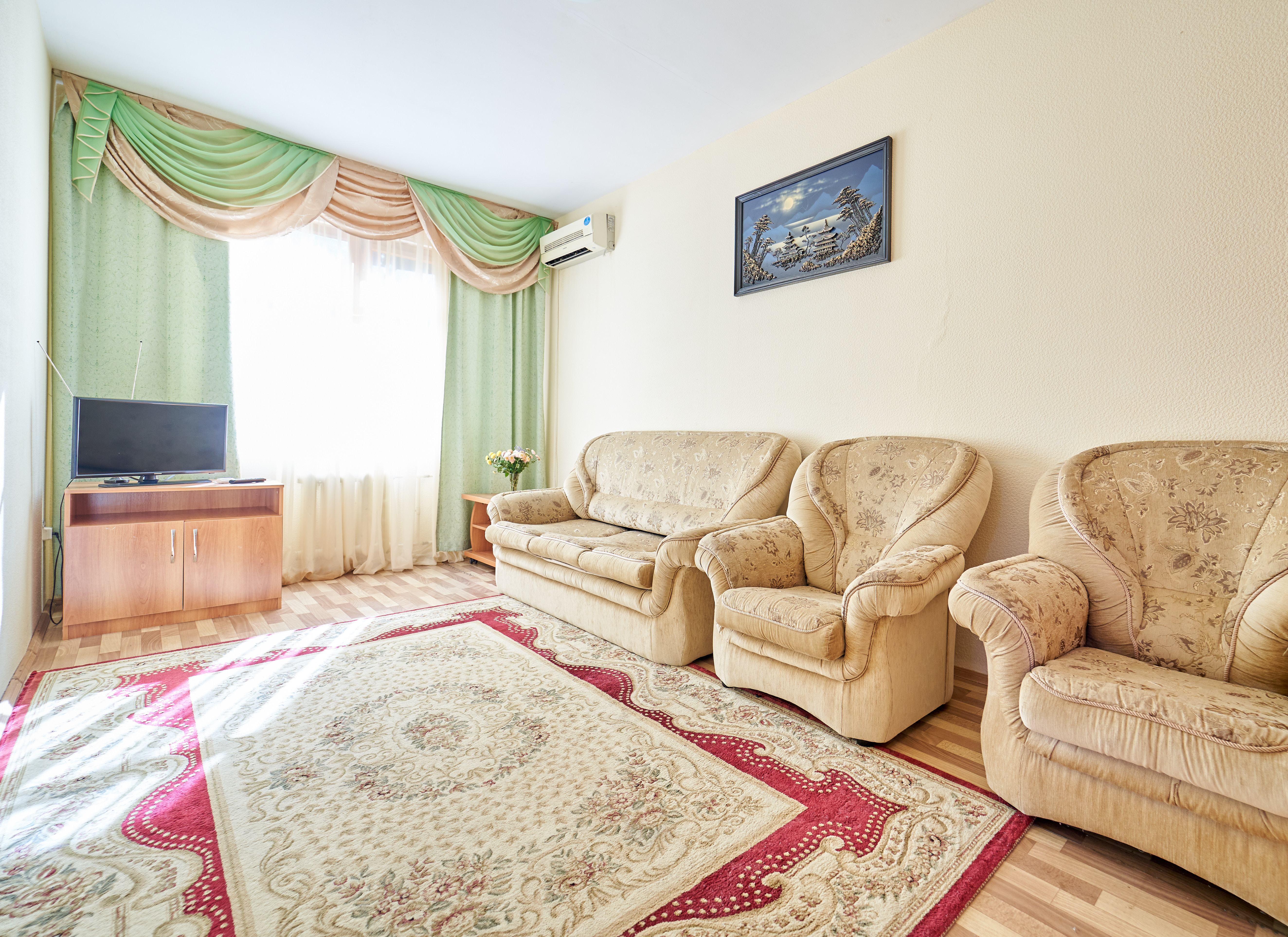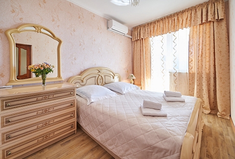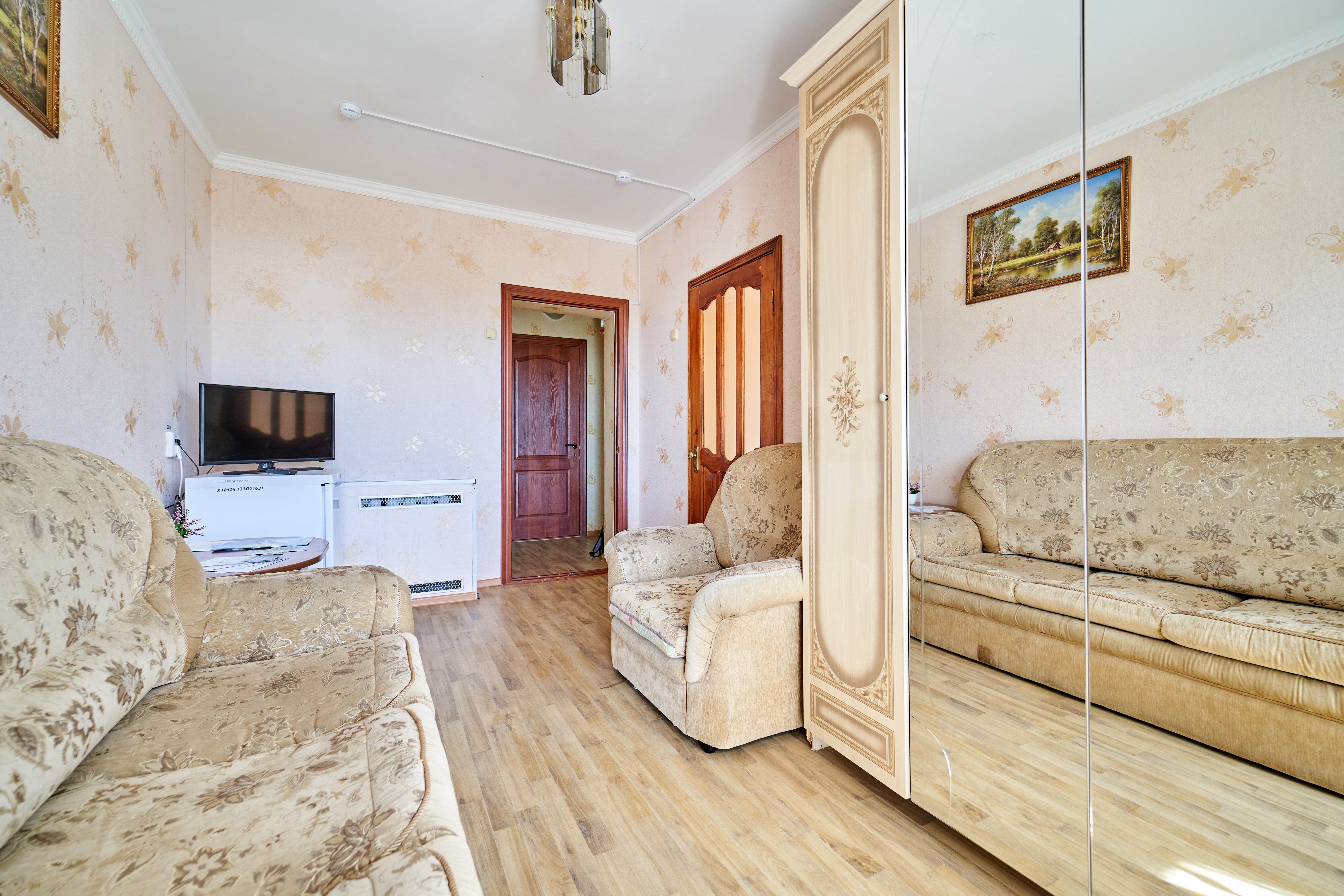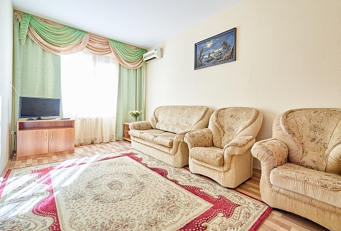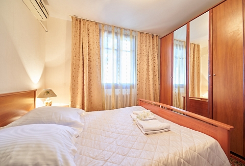 В номере: вешалка, зеркало, кровать двуспальная, набор мягкой мебели, прикроватные тумбочки, столик журнальный, тумба под телевизор, шкаф, кондиционер, набор посуды, телевизор, холодильник