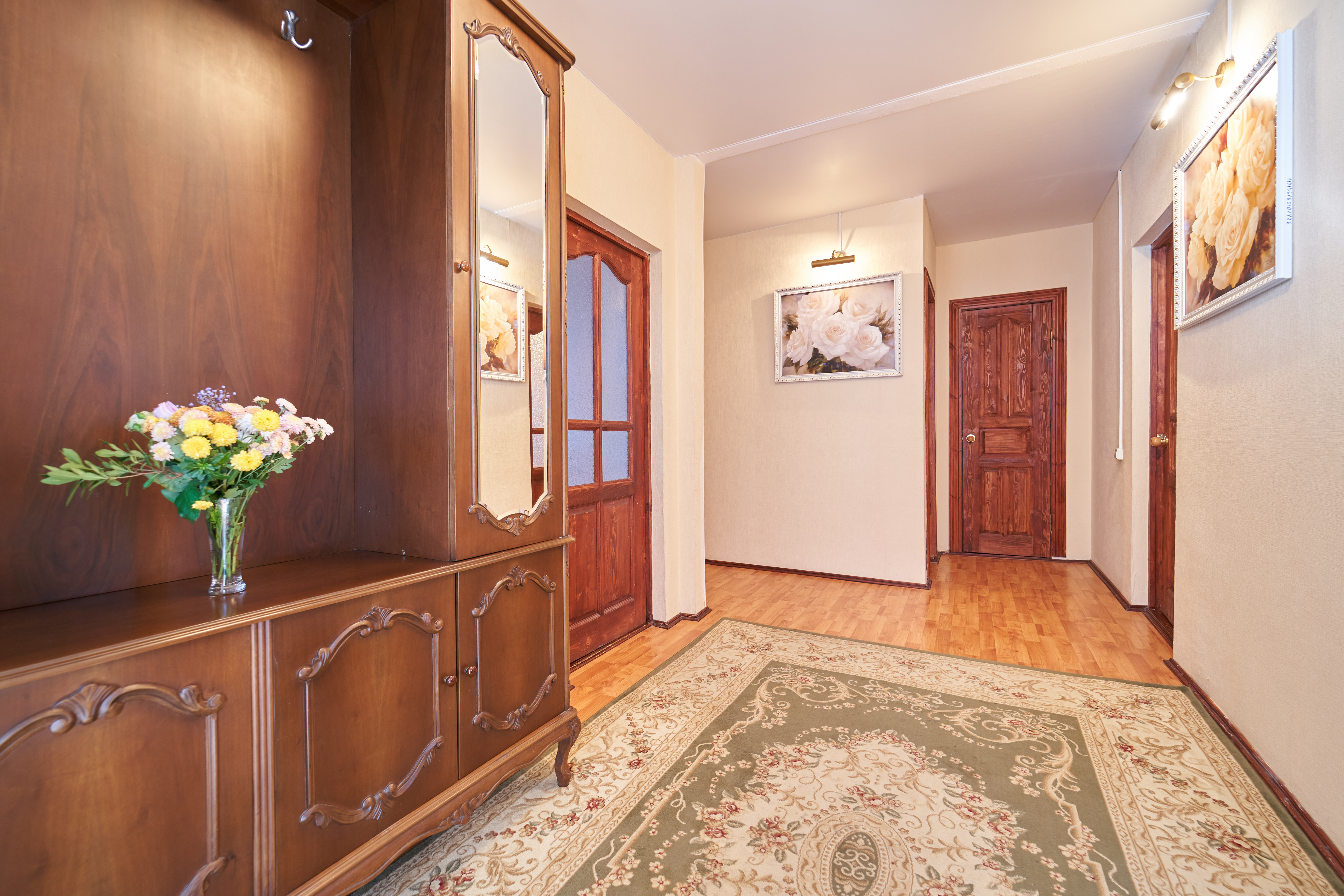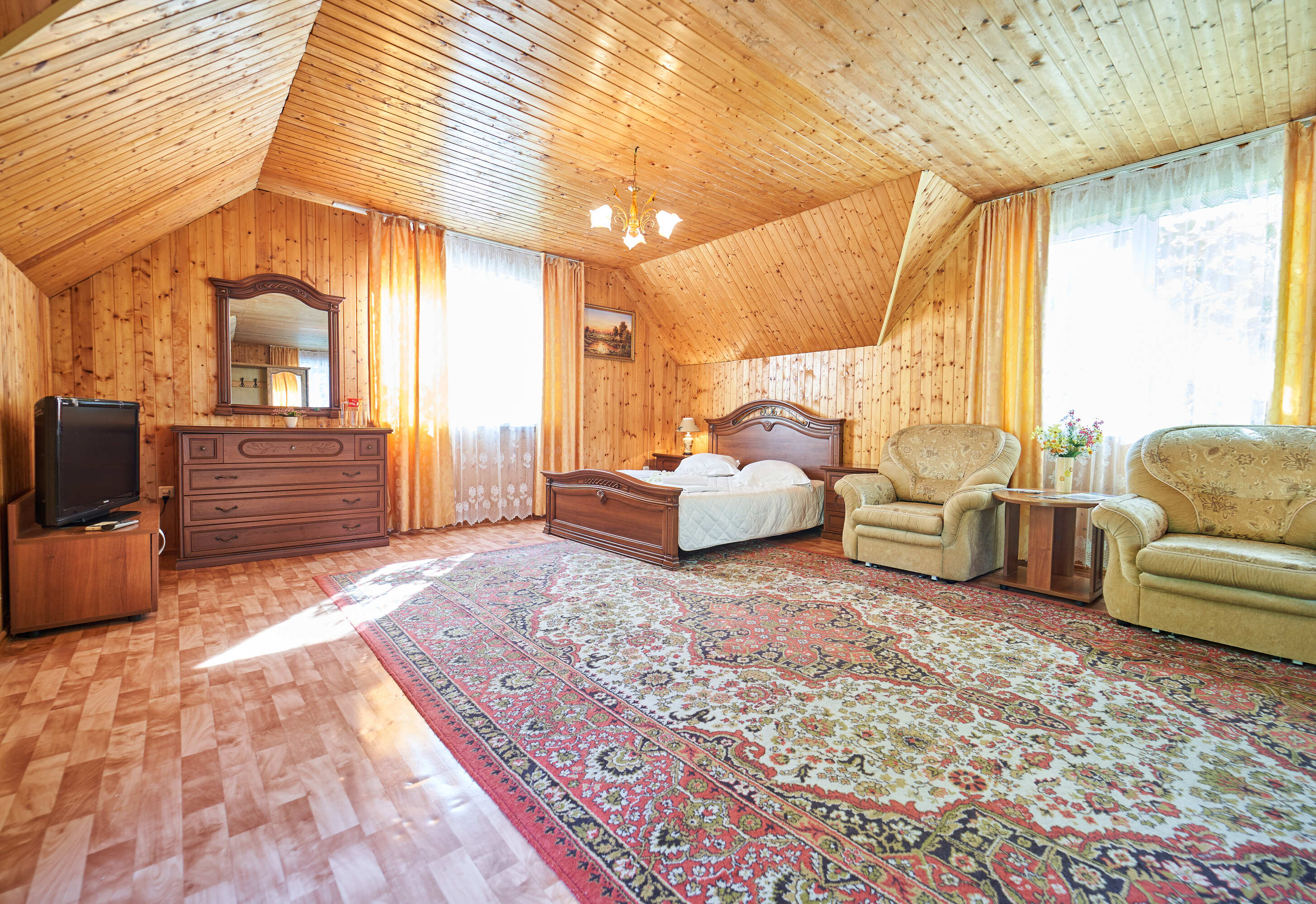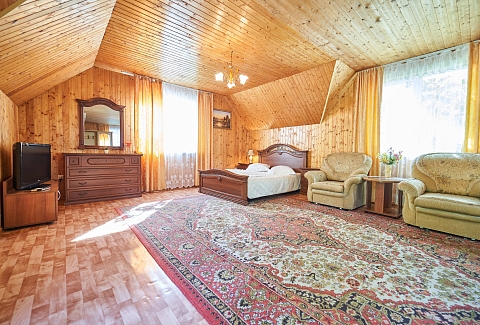 В номере: вешалка, зеркало, комод, кровать двуспальная, набор мягкой мебели, прикроватные тумбочки, стол, стулья, шкаф, шкаф для посуды, гладильная доска, кондиционер, микроволновая печь, набор посуды, телевизор, утюг, холодильник