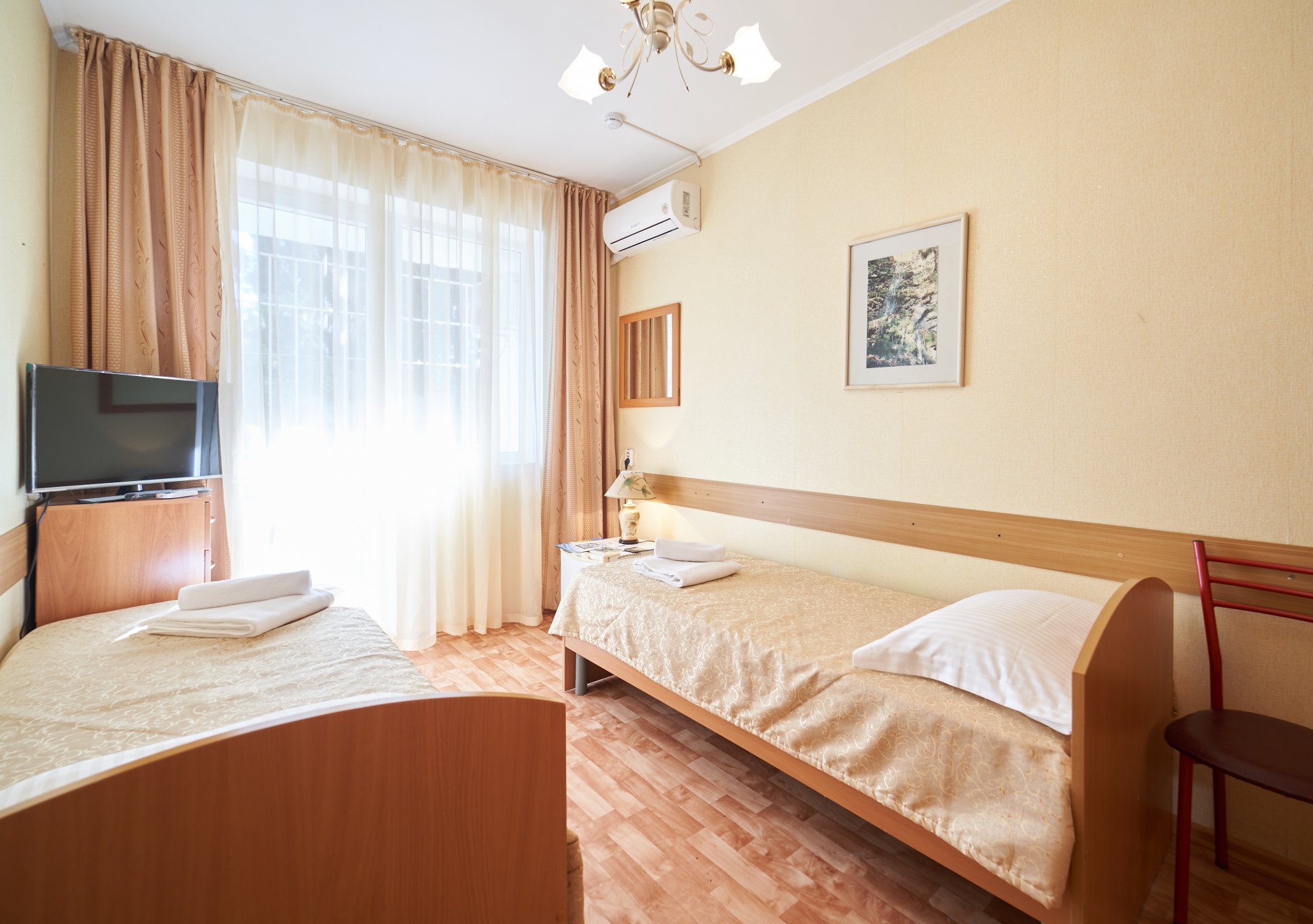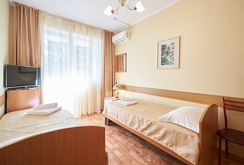 В номере: вешалка, зеркало, кровати односпальные, прикроватные тумбочки, стул, тумба под телевизор, шкаф, кондиционер, телевизор, холодильник