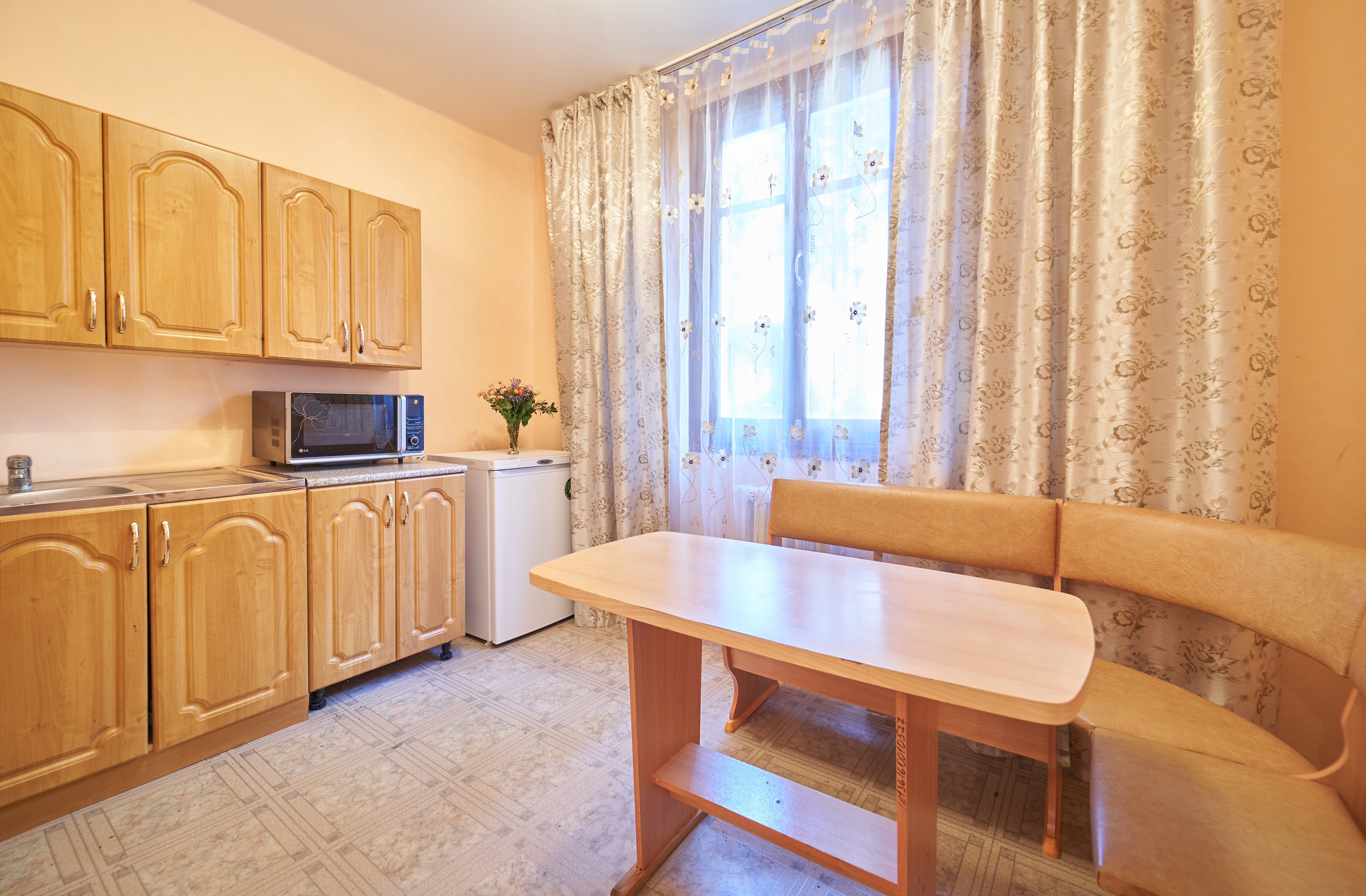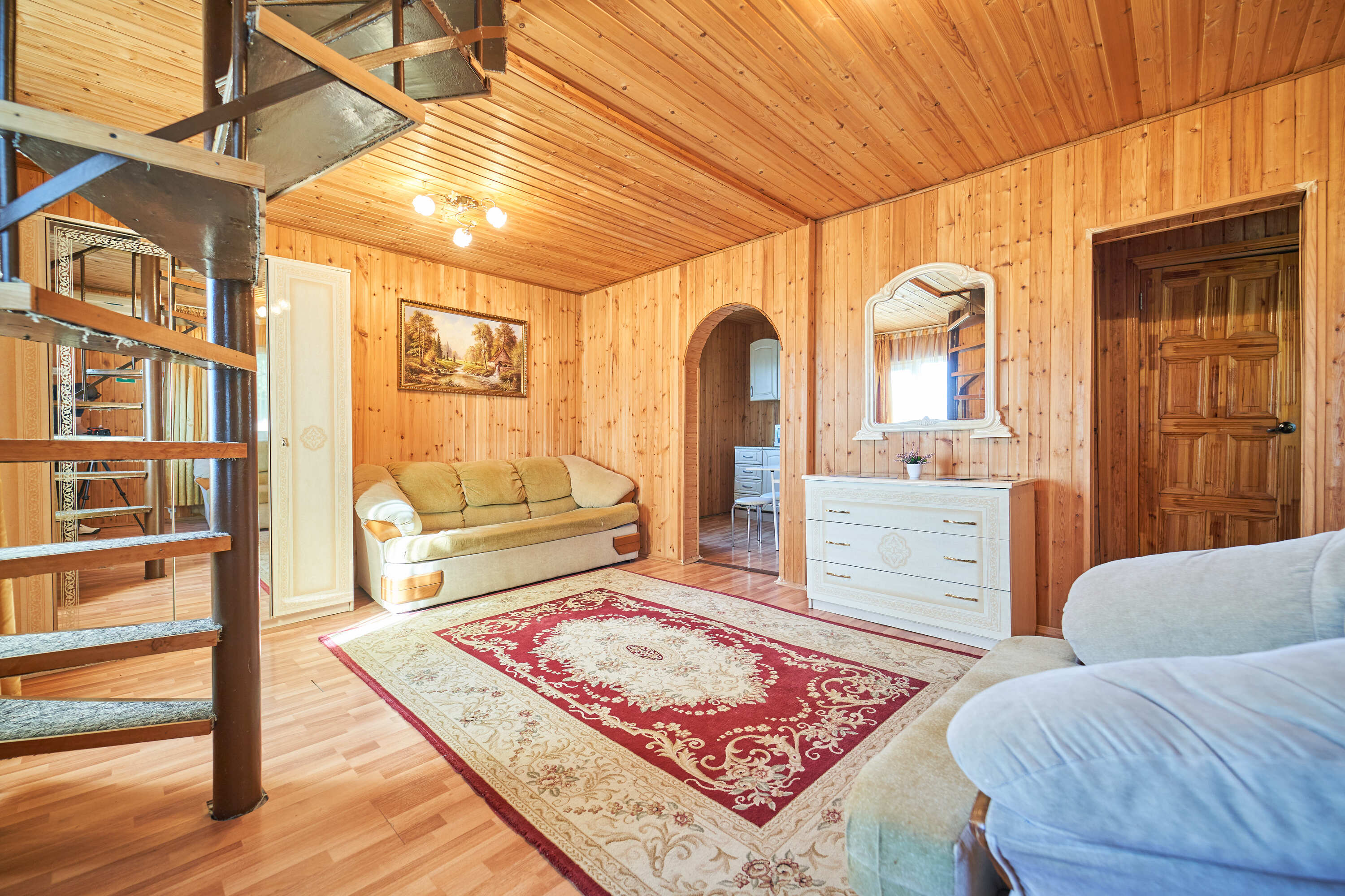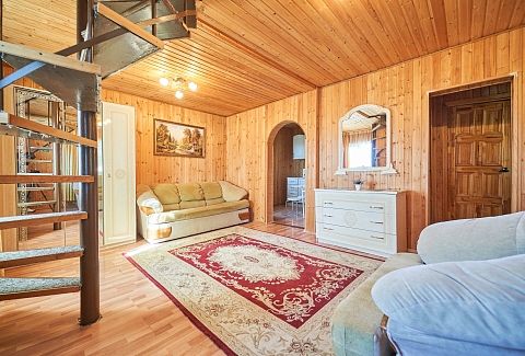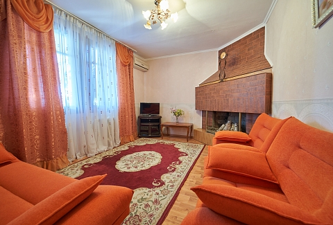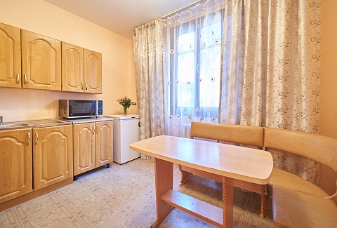 В номере: вешалка, зеркало, кровать двуспальная, кухонная мебель, набор мягкой мебели, прикроватные тумбочки, стол, столик журнальный, стулья, шкаф, шкаф для посуды, кондиционер, микроволновая печь, набор посуды, телевизор, холодильник, электрочайник