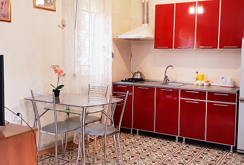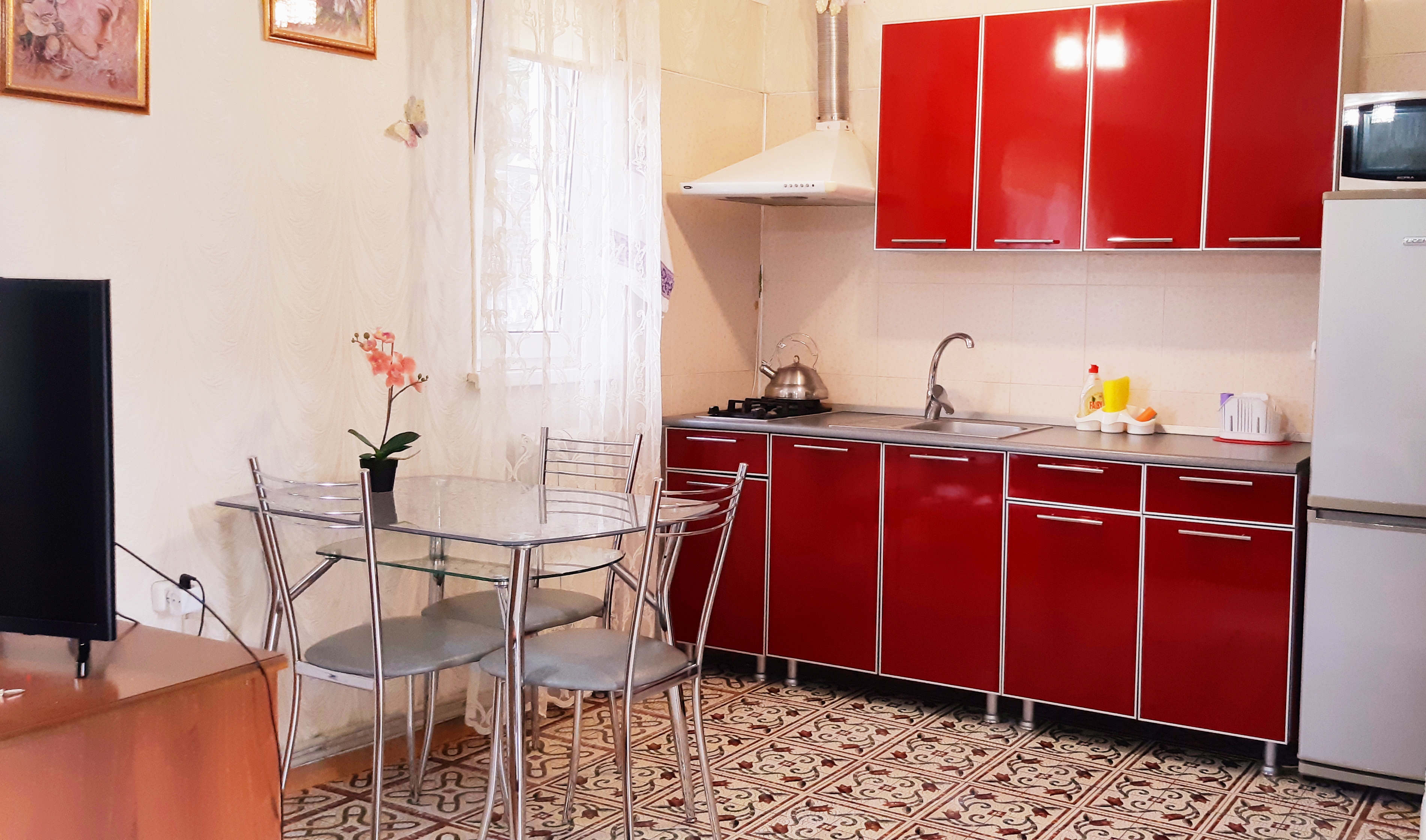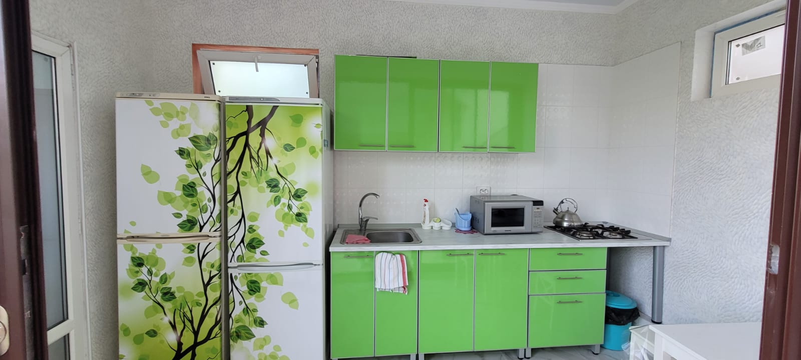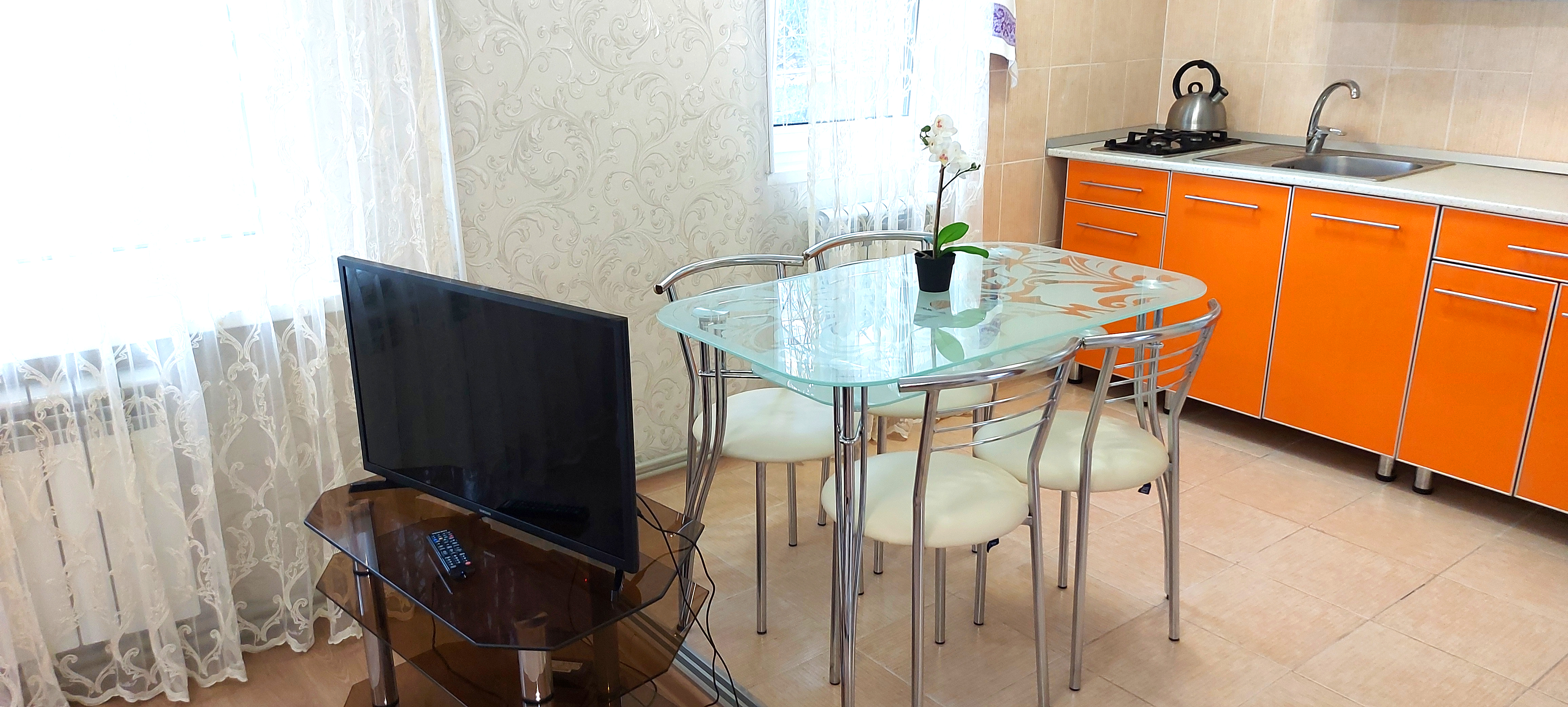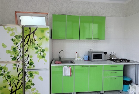 В номере: диван, кровать двуспальная, прикроватная тумбочка, стол, стулья, шкаф, кондиционер, микроволновая печь, набор посуды, телевизор, холодильник, электрочайник