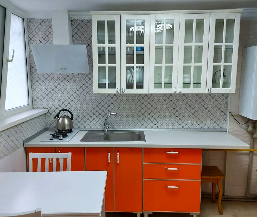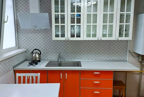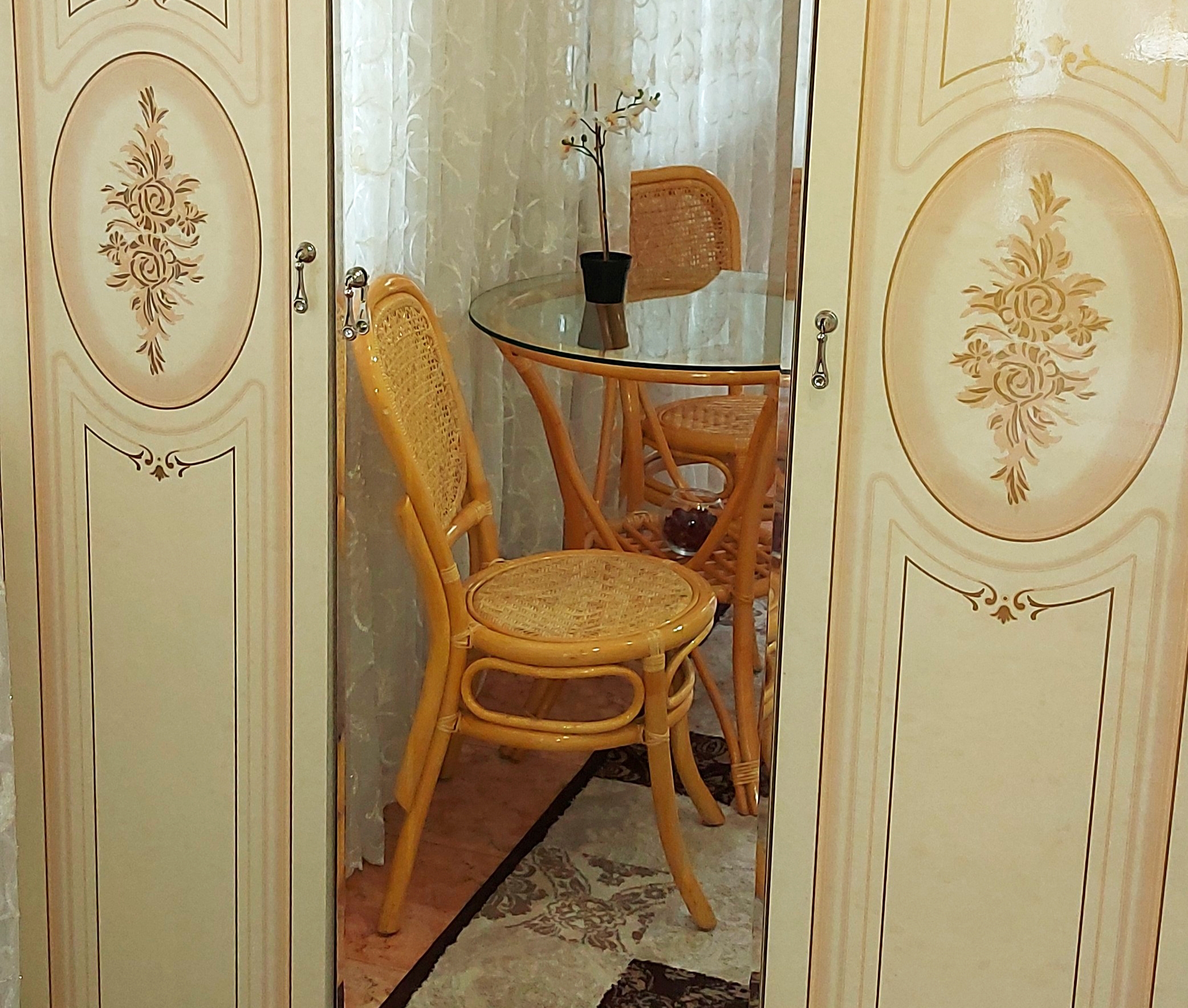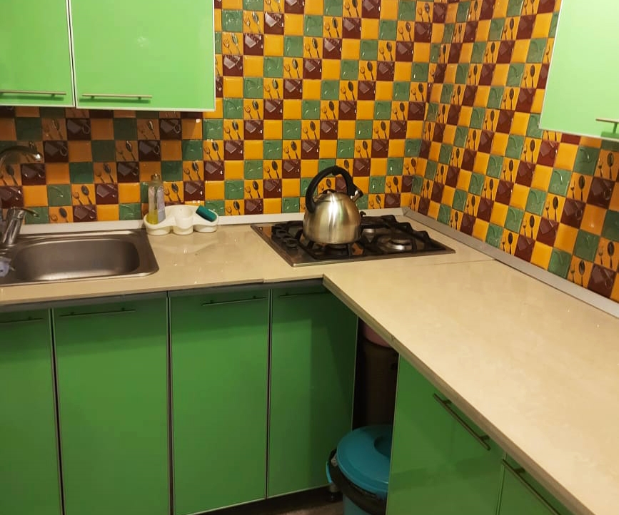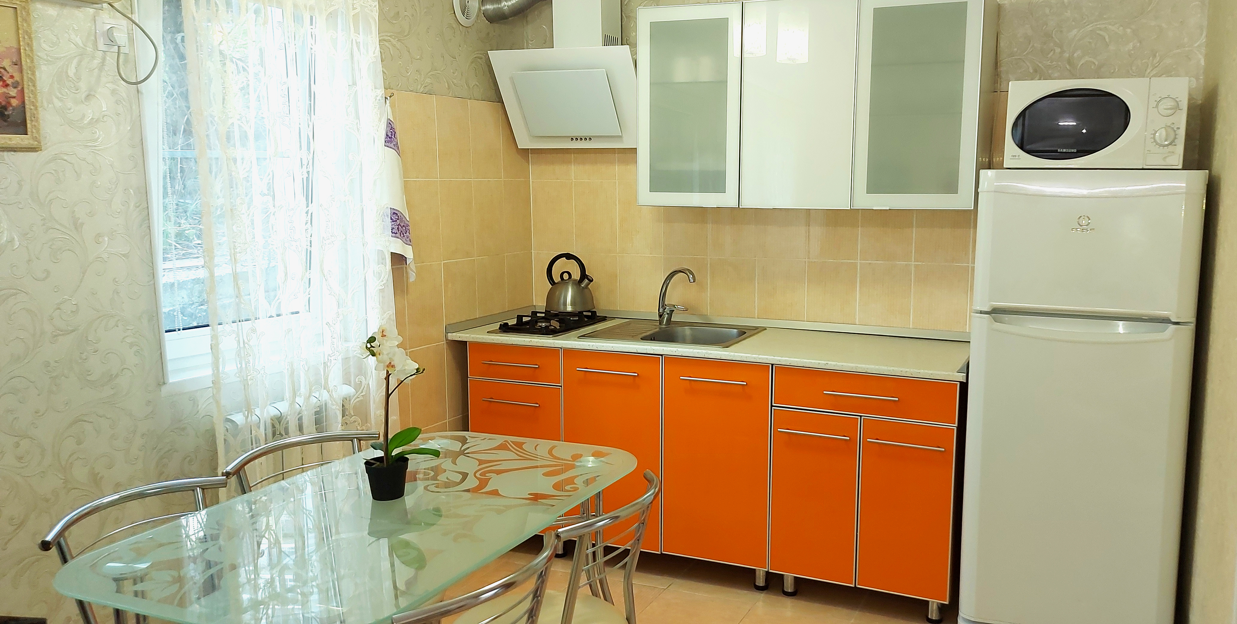 В номере: диван, кровать двуспальная, прикроватная тумбочка, стол, стулья, шкаф, кондиционер, микроволновая печь, набор посуды, телевизор, холодильник, электрочайник