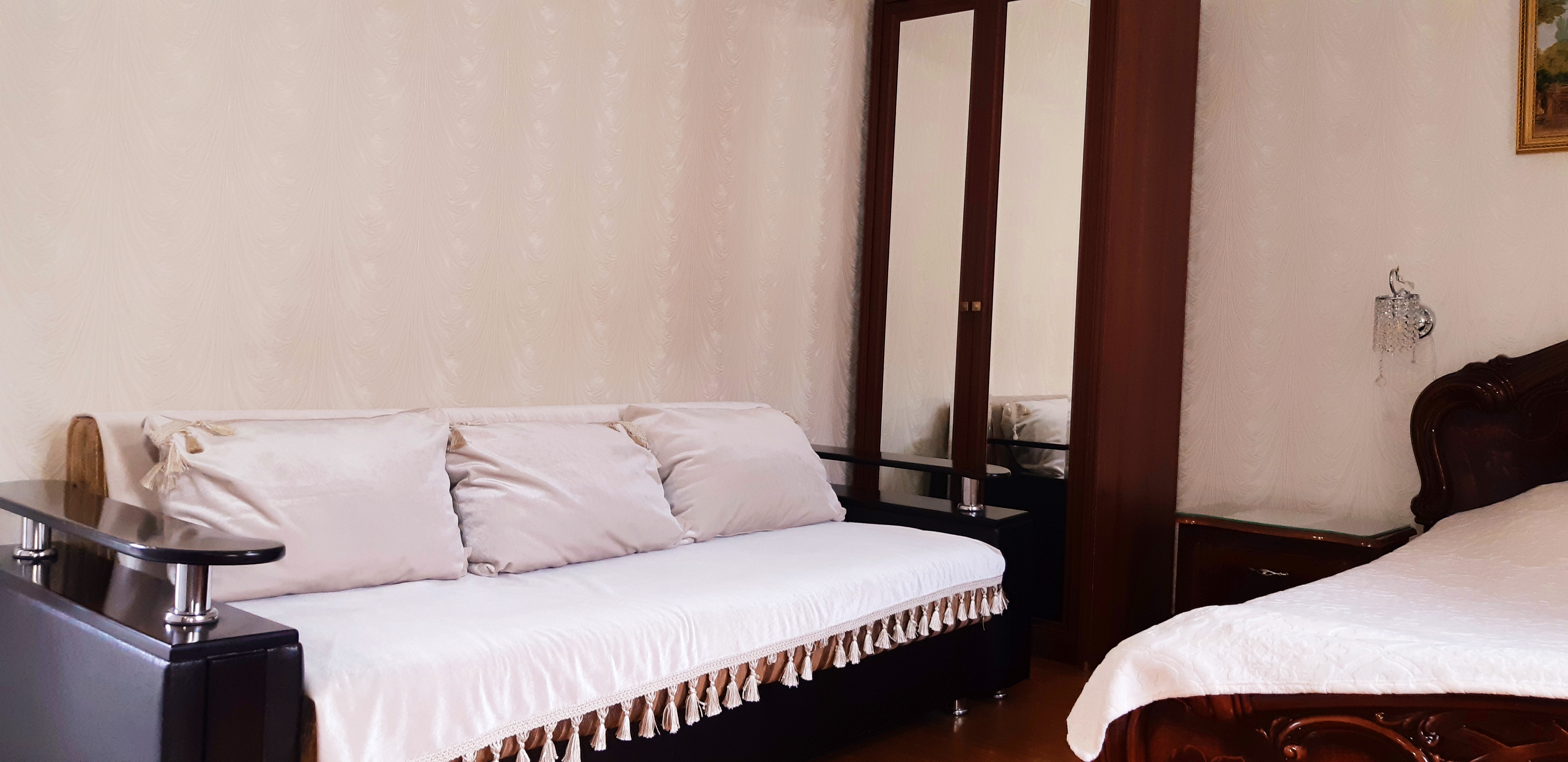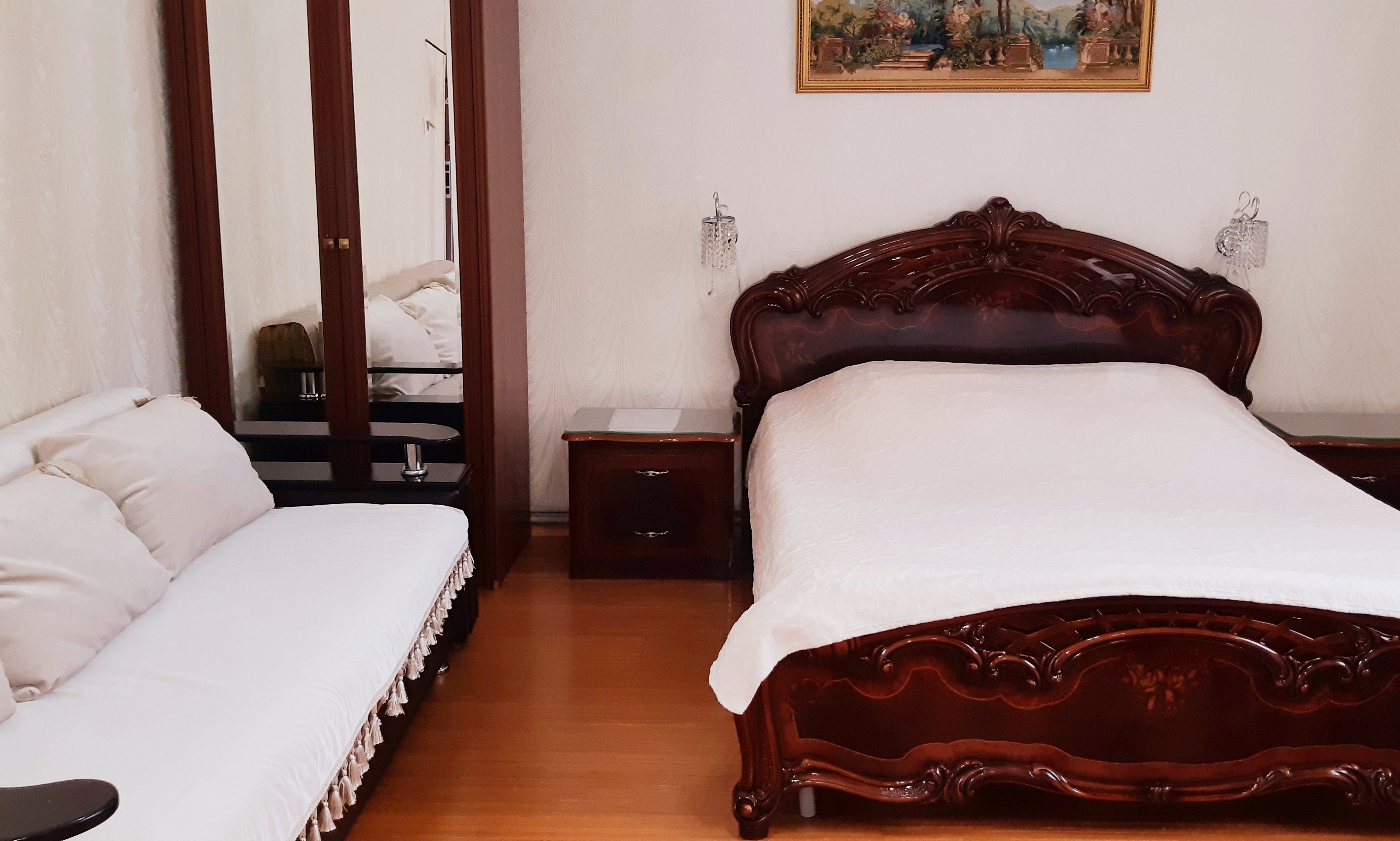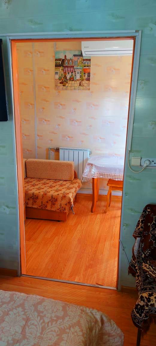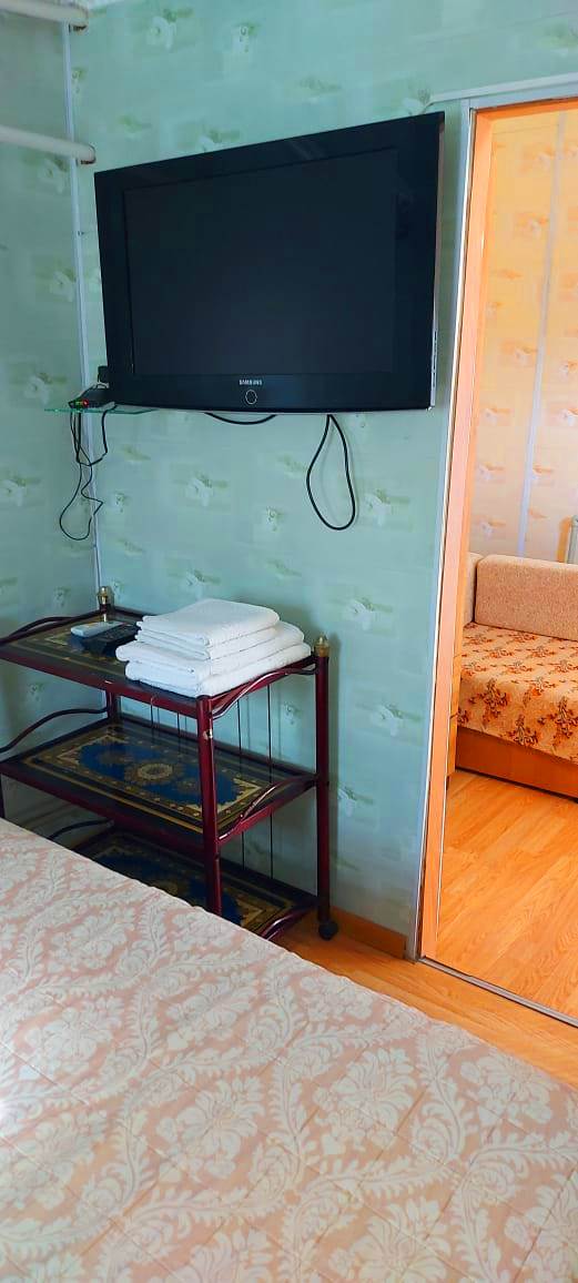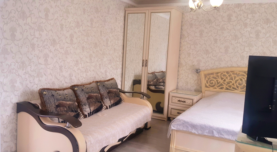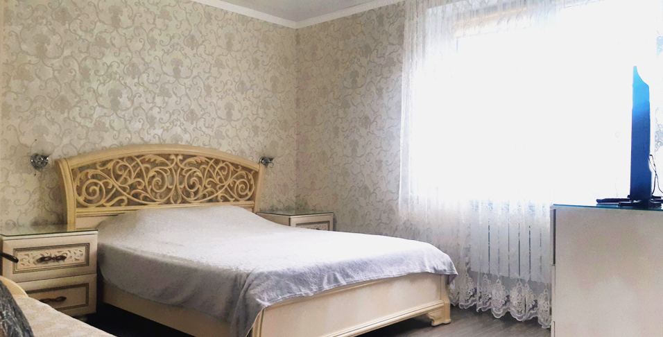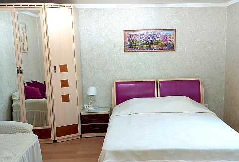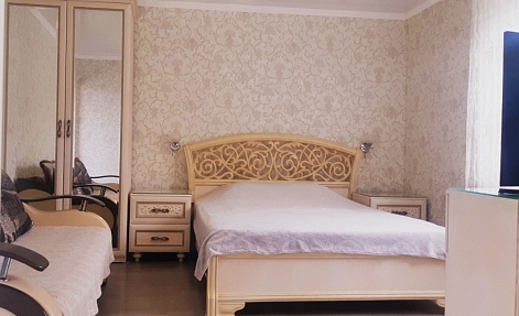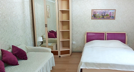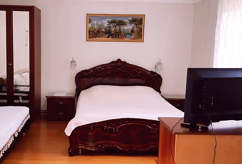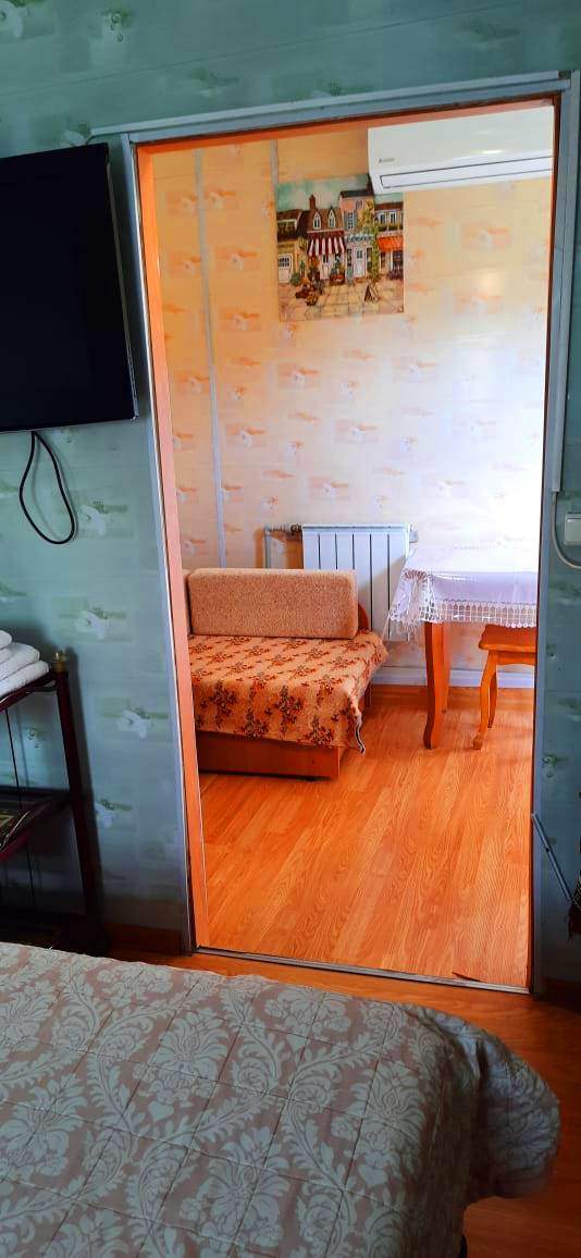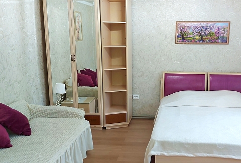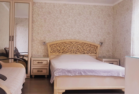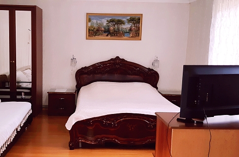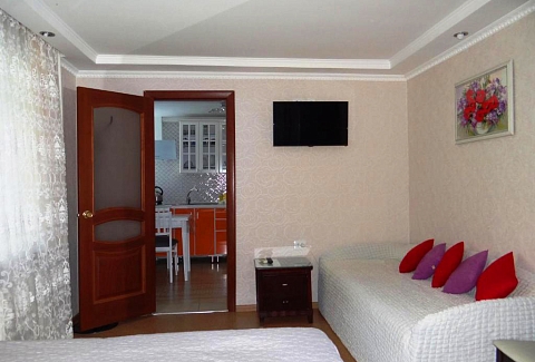 В номере: диван раскладной, кровать двуспальная, прикроватные тумбочки, столик журнальный, шкаф, кондиционер, телевизор, холодильник, электрочайник