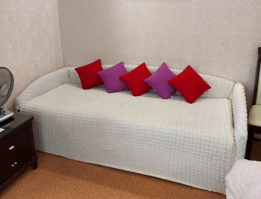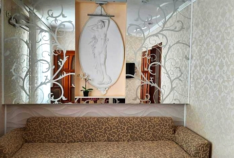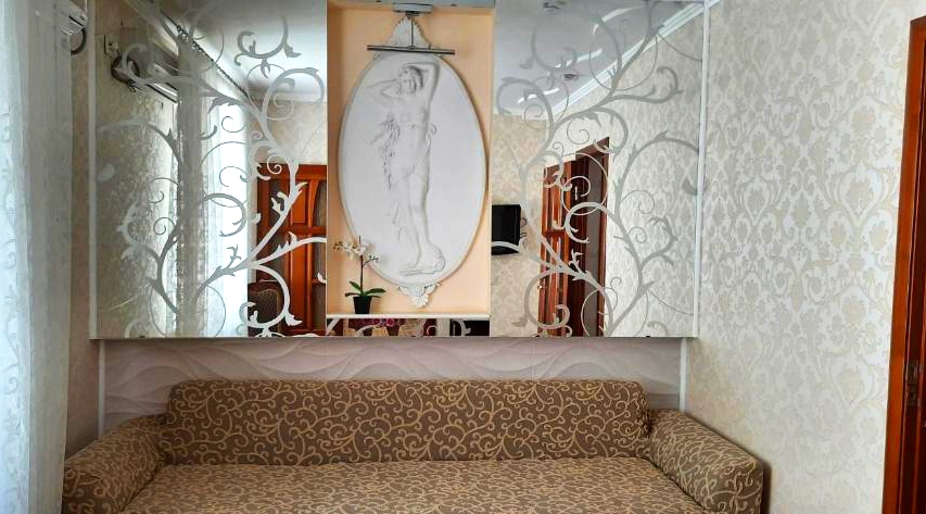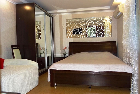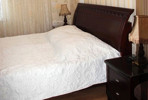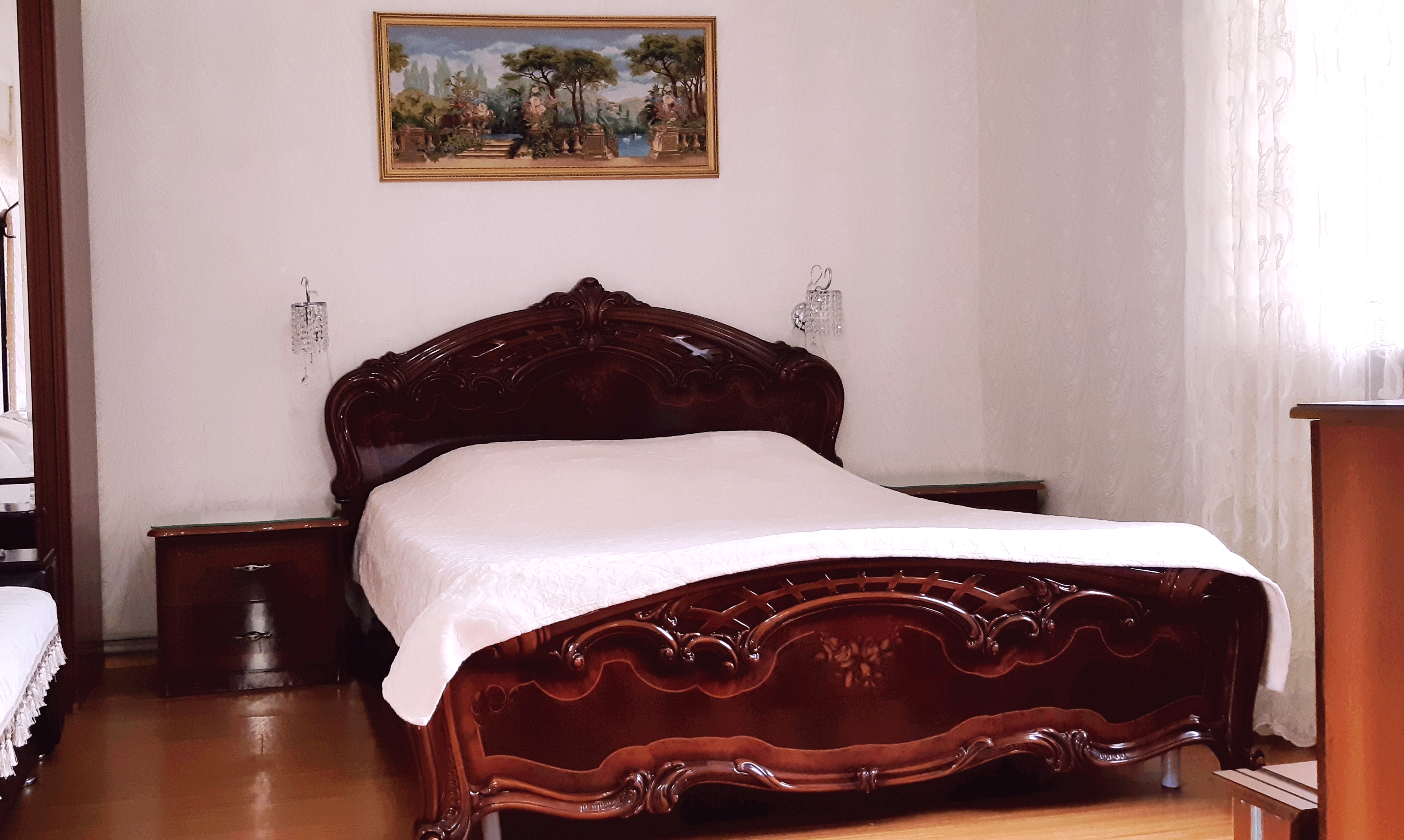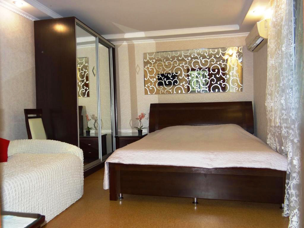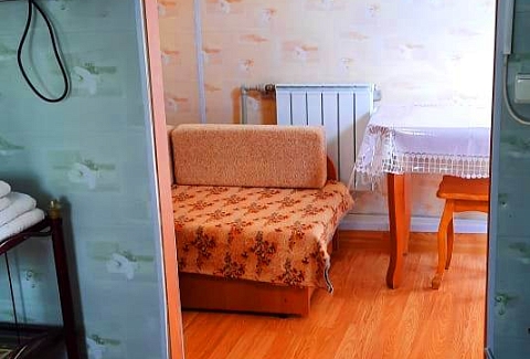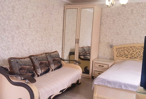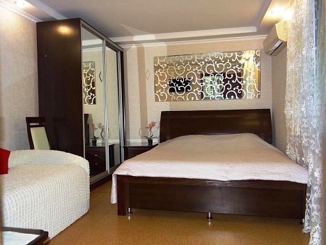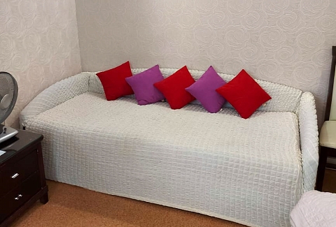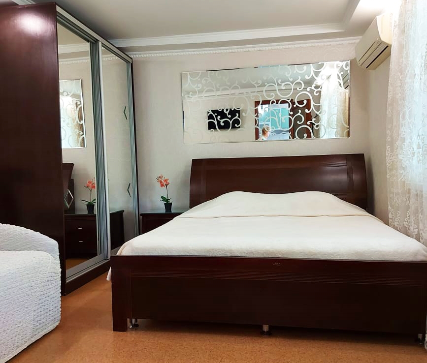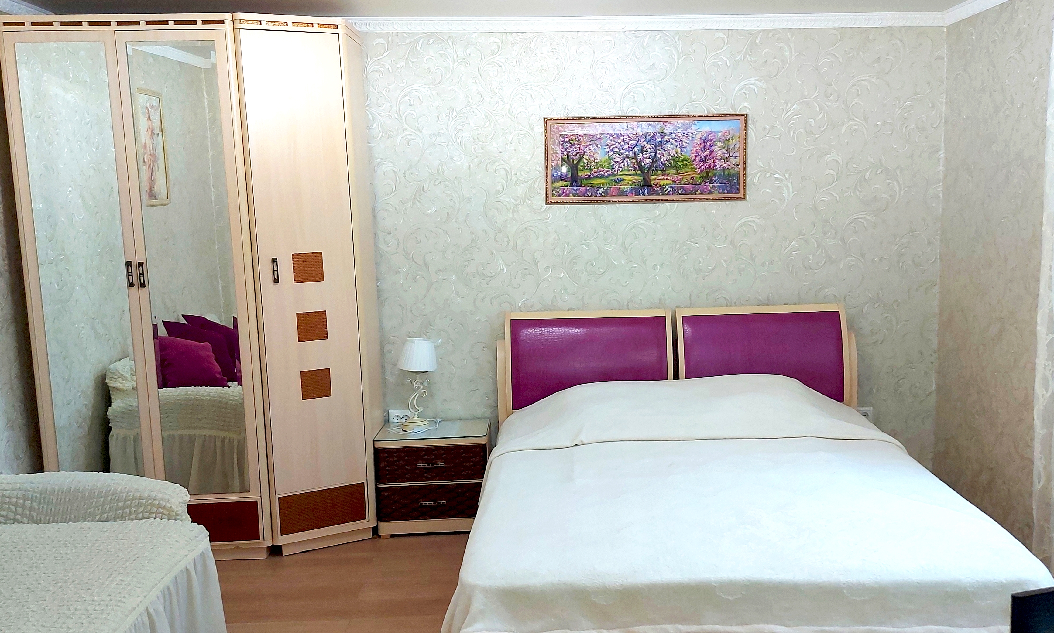 В номере: диван раскладной, кровать двуспальная, прикроватные тумбочки, столик журнальный, шкаф, кондиционер, телевизор, холодильник, электрочайник